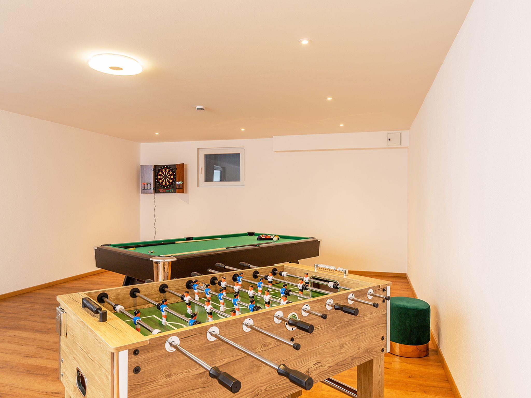 Im Keller erwartet Sie ein ca. 40 m² großer Freizeitraum mit Billard, Kicker und Dart sowie einem gemütlichen Sitzbereich – perfekt für gemeinsame Stunden.