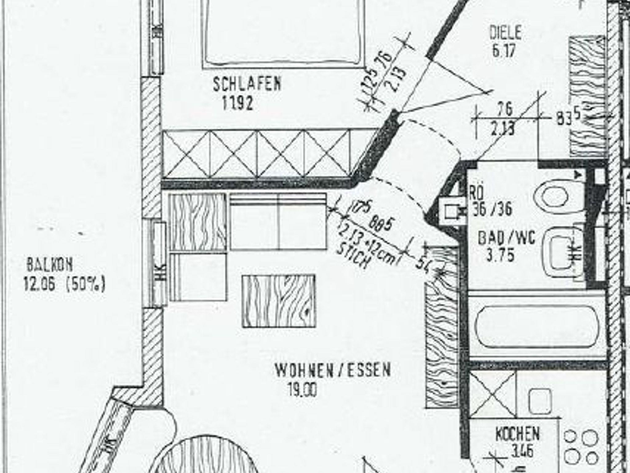 Die Wohnung hat zwei Räume: ein separates Schlafzimmer mit einem bequemen Doppelbett (1,80m x 2,00m) und ein Wohnzimmer mit einer Schlafcouch, die zusätzlichen Schlafplatz bietet.