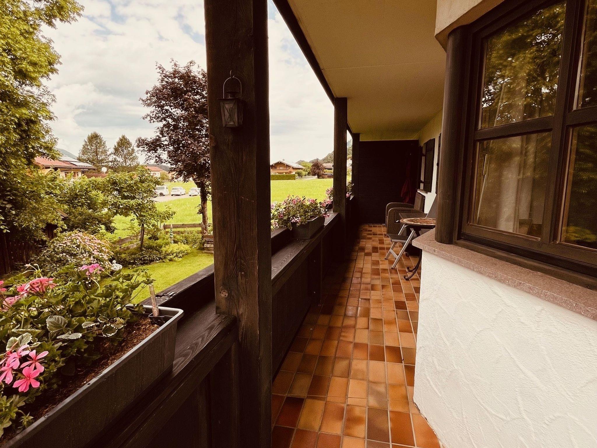 Vom rückversetzten Haus aus genießt ihr einen herrlichen Blick auf die umliegende Bergwelt des Achentals. Der großzügige Balkon lädt zum Verweilen ein.