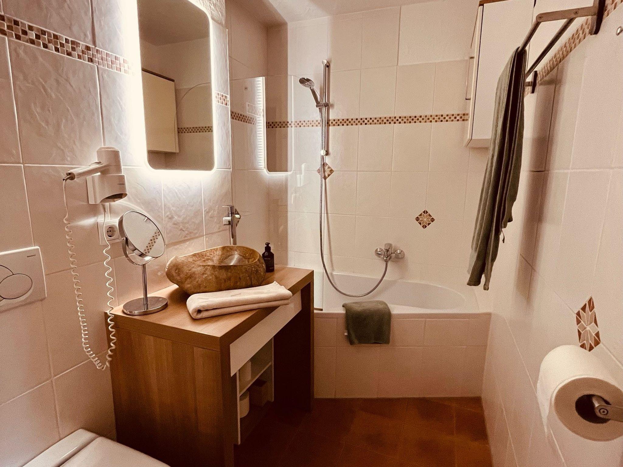 Und auch das Bad hat asureichend Platz, ist sehr sauber und bietet Komfort. Nach einer langen Wanderung könnt ihr euch in der schönen Eckbadewanne bei einem Bad entspannen.