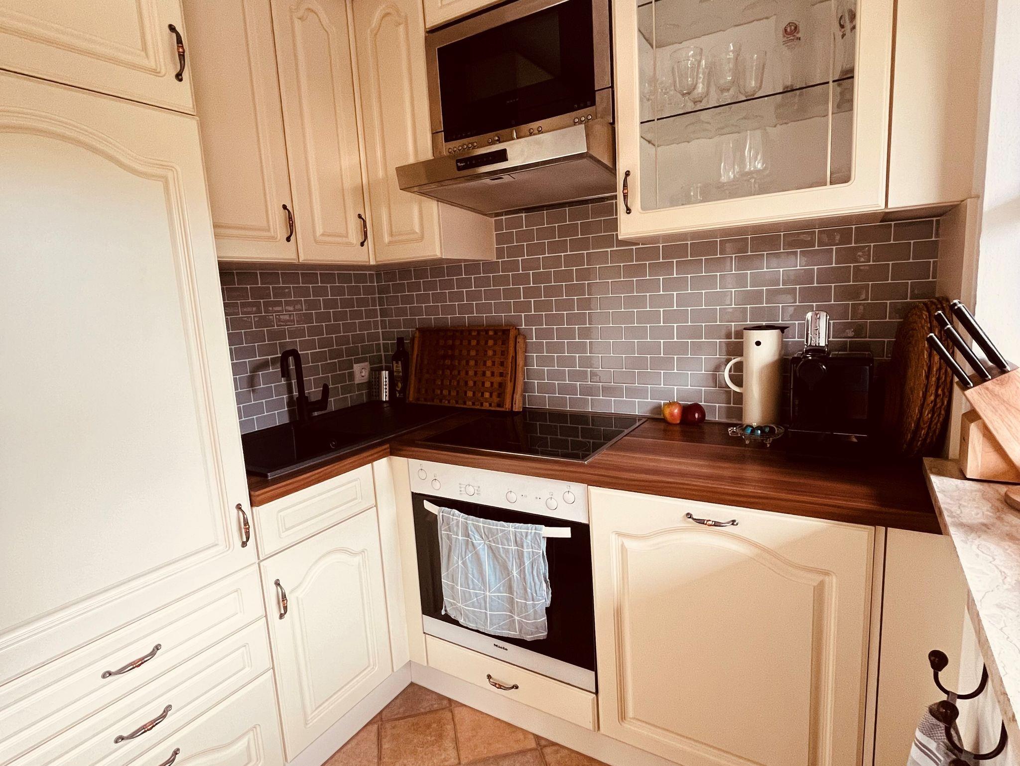 Die Sitzecke im hellen Erker des Wohnzimmers lädt zum Entspannen und Verweilen ein. Eure Mahlzeiten könnet ihr in der separaten, voll ausgestatteten Küche zubereiten, die trotz ihrer Größe keine Wünsche offen lässt.