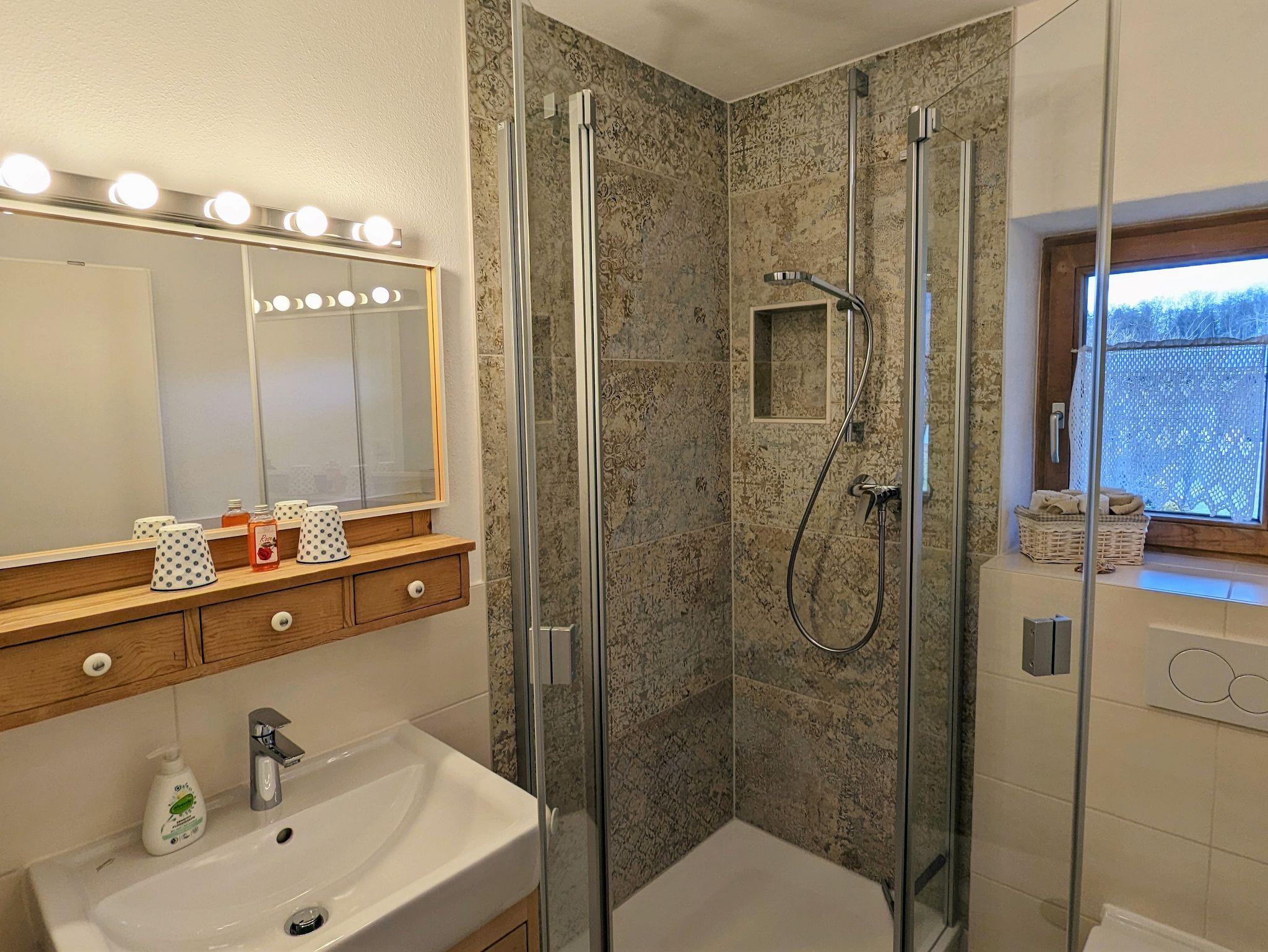 Das moderne Badezimmer mit Dusche und WC verfügt über Fußbodenheizung, Handtuchtrockner und Föhn.