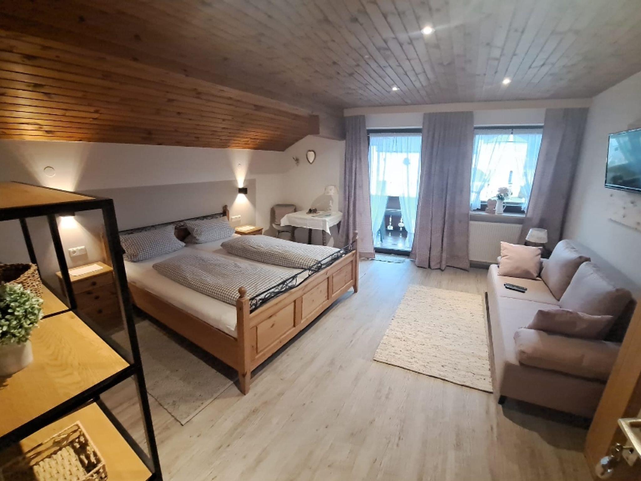 Unser schönes und gemütliches Familienzimmer ist im Landhausstil eingerichtet und bekam im Dezember 2023 ein upgrade. Ausgestattet ist das Zimmer mit einem Doppelbett, verstellbaren Lattenrost, Sitzgruppe, möblierten Balkon, Flachbild TV, WLAN, Radio, Dusche/WC und einem Sofa ,ausziehbar. Dieses wird als zusätzliches Bett angeboten. Ebenso ist Platz für ein Babyzustellbett. Vom Balkon aus haben Sie einen herrlichen Blick auf die Berge. Mit dem Zimmernamen möchte ich Sie auf die Dalsen-Alm hinweisen. Nur knapp 6 km von hier starten Sie in Schleching-Mühlau zu einer Wanderung über ein wunderschönes Almengebiet mit Einkehrmöglichkeit. Unsere Liegewiese und Terrassen stehen allen Gästen zur Verfügung. Reichhaltiges Frühstück in unserem gemütlichen Frühstücksraum.