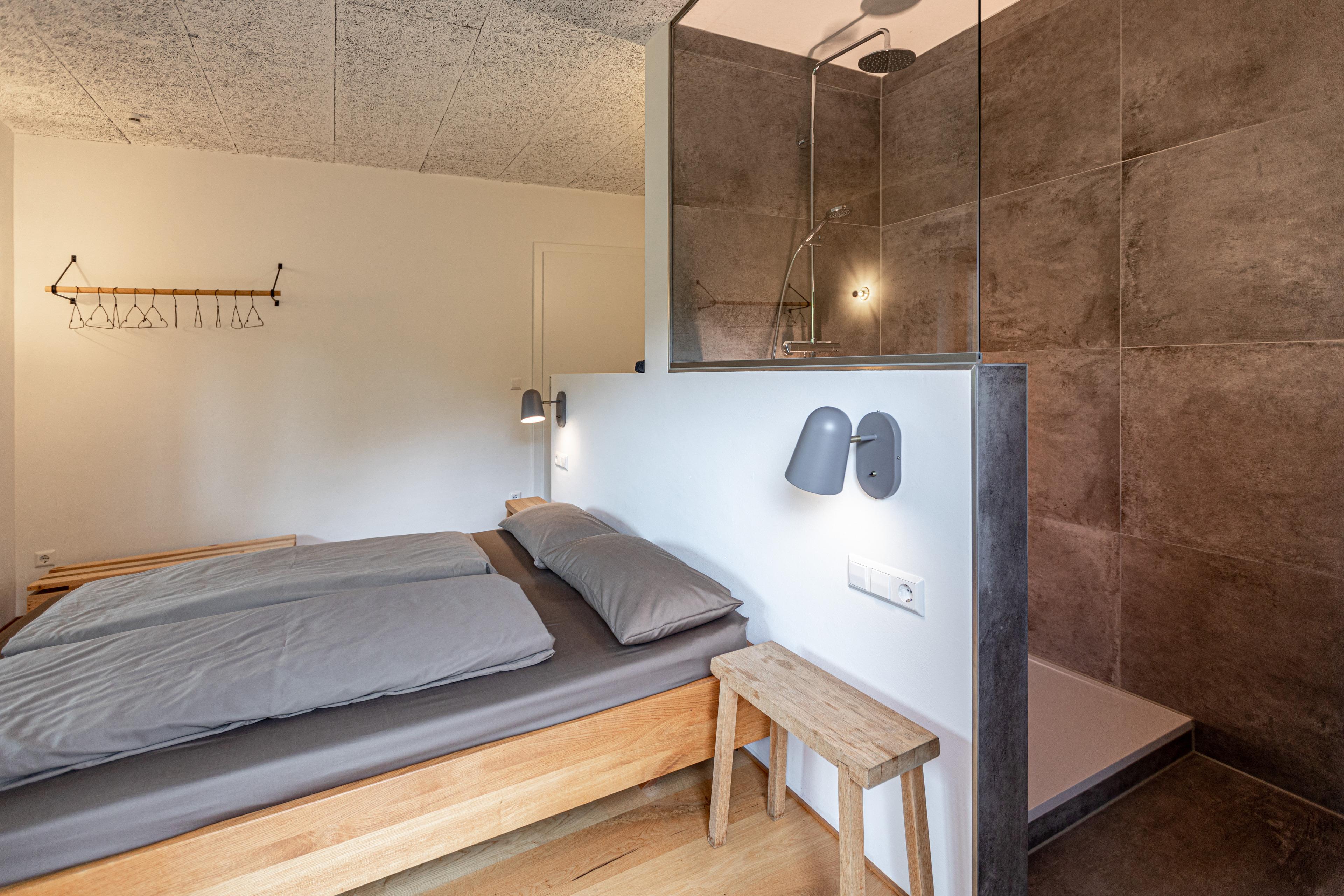 Das Schlafzimmer mit integriertem Bad setzt die offene Gestaltung fort und sorgt für ein luftiges Wohngefühl. Der großzügige L-förmige Balkon, der von zwei Seiten zugänglich ist, lädt ein, entspannte Stunden in der Morgen- oder Abendsonne zu verbringen.