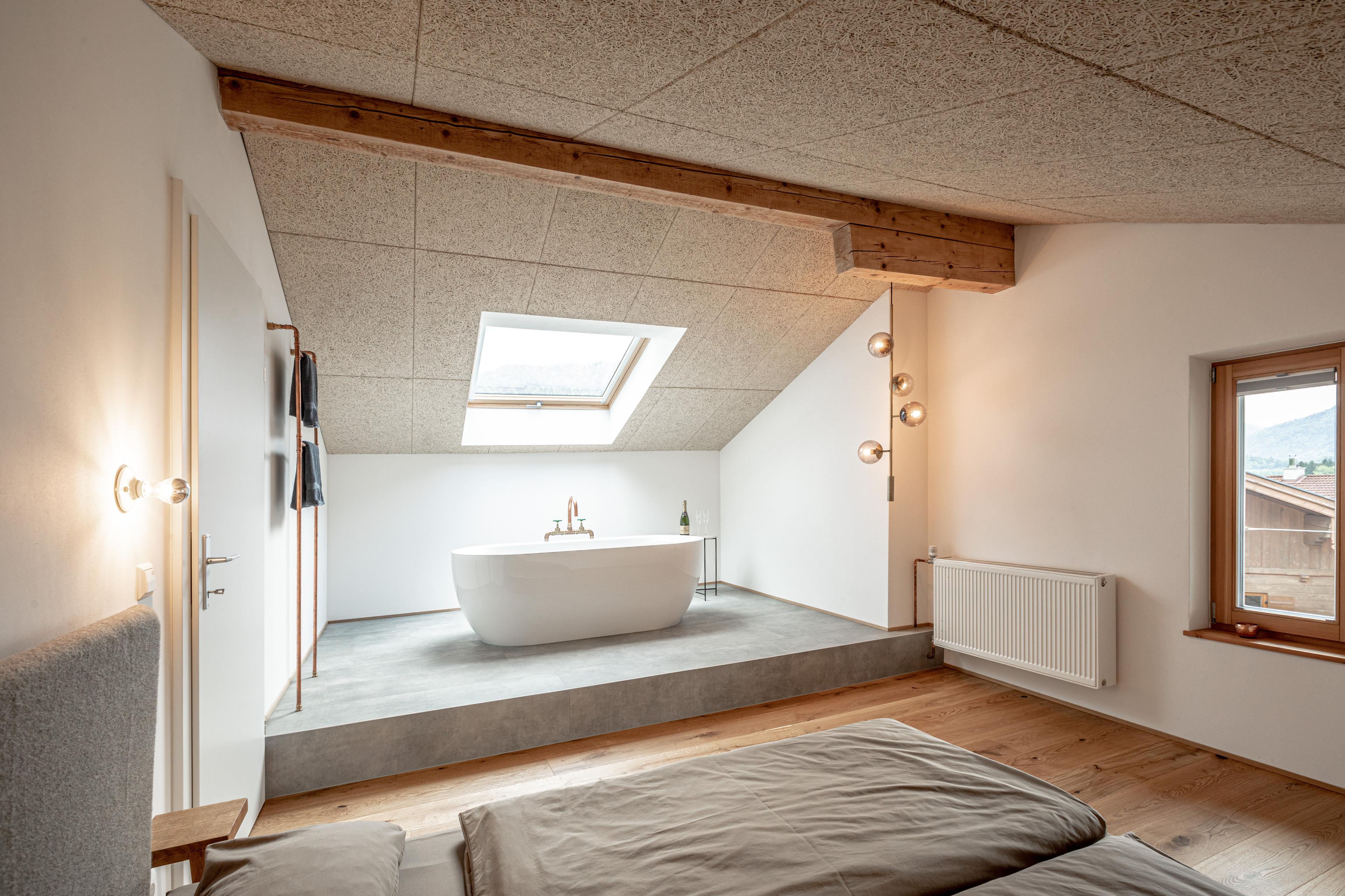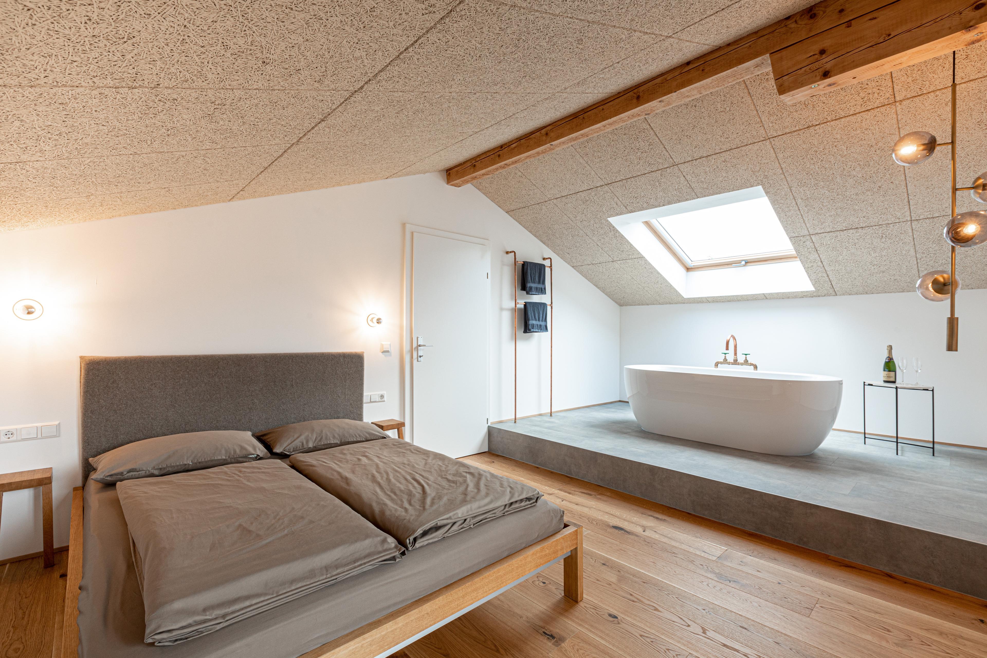 Das Schlafzimmer ist mit einem komfortablen Doppelbett (1,60 x 2,00 m) ausgestattet und überrascht mit einer freistehenden Badewanne für entspannte Momente. Das angrenzende Badezimmer verfügt über eine großzügige Regendusche, einen Schminktisch und WC.
