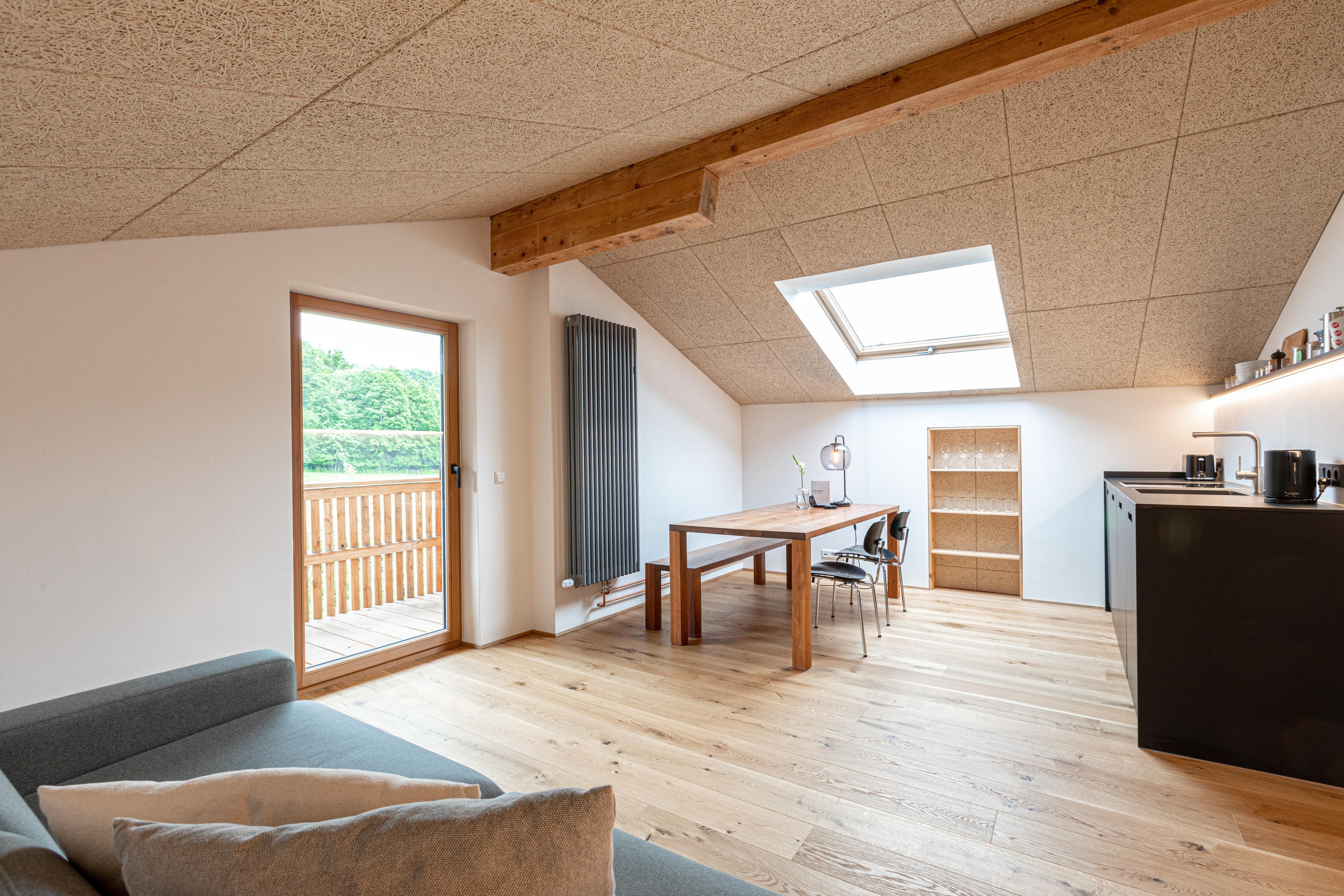 Nachhaltigkeit spielt eine zentrale Rolle: Die Wohnung wurde mit natürlichen Baustoffen saniert, nutzt Ökostrom sowie eine Pelletheizung. Die Außenanlage ist bienen- und insektenfreundlich gestaltet.
