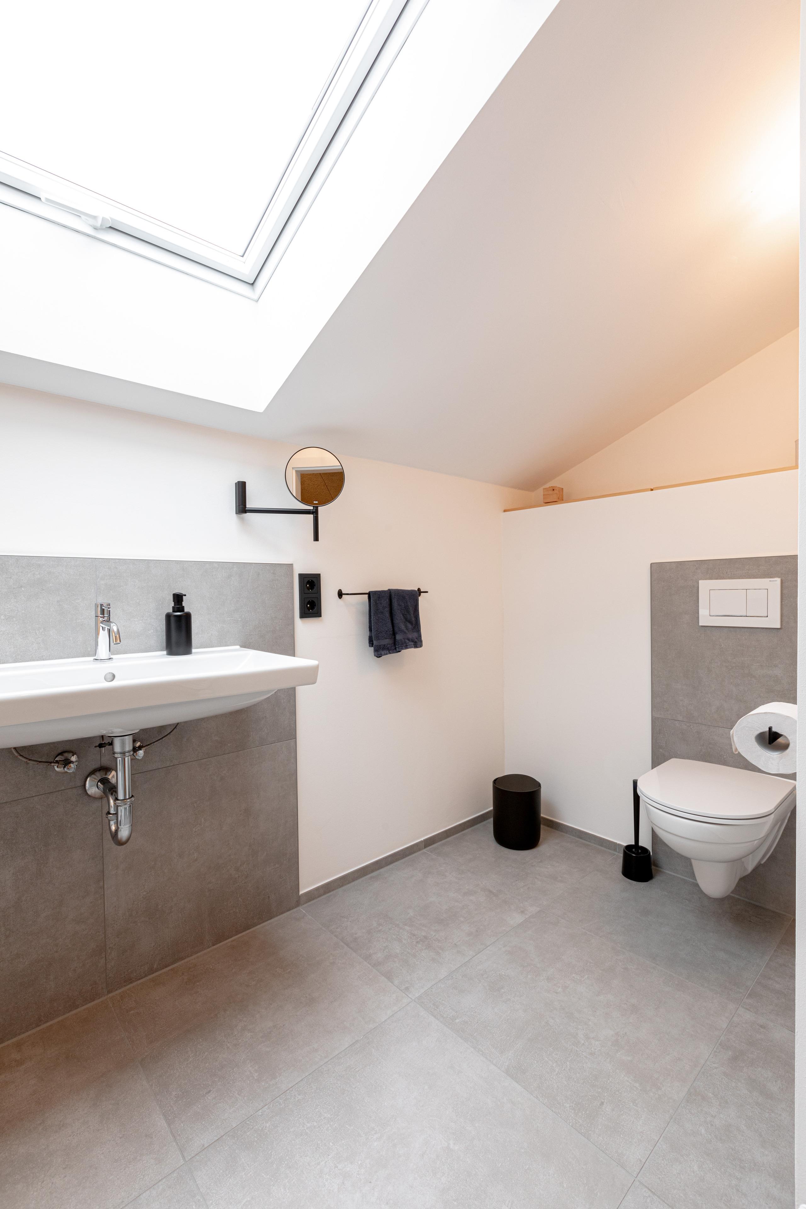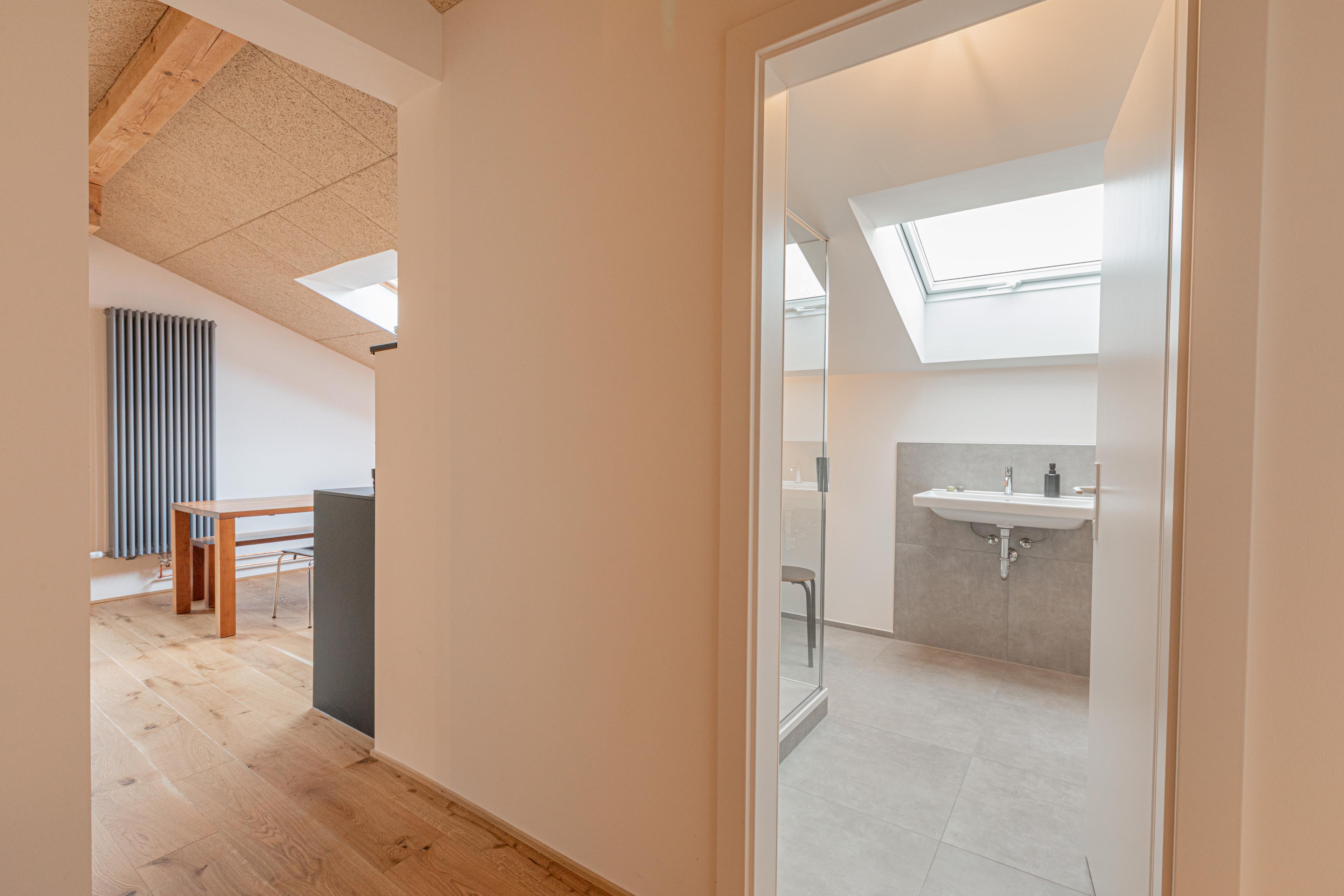 Die Wohnung "Weitblick" im 2. Obergeschoss besticht durch lichtdurchflutete Räume und einen unvergleichlichen Ausblick auf das Bergpanorama, insbesondere die Hochplatte. Auf 70 m² bietet sie Platz für bis zu vier Personen – ideal für Paare oder Familie.