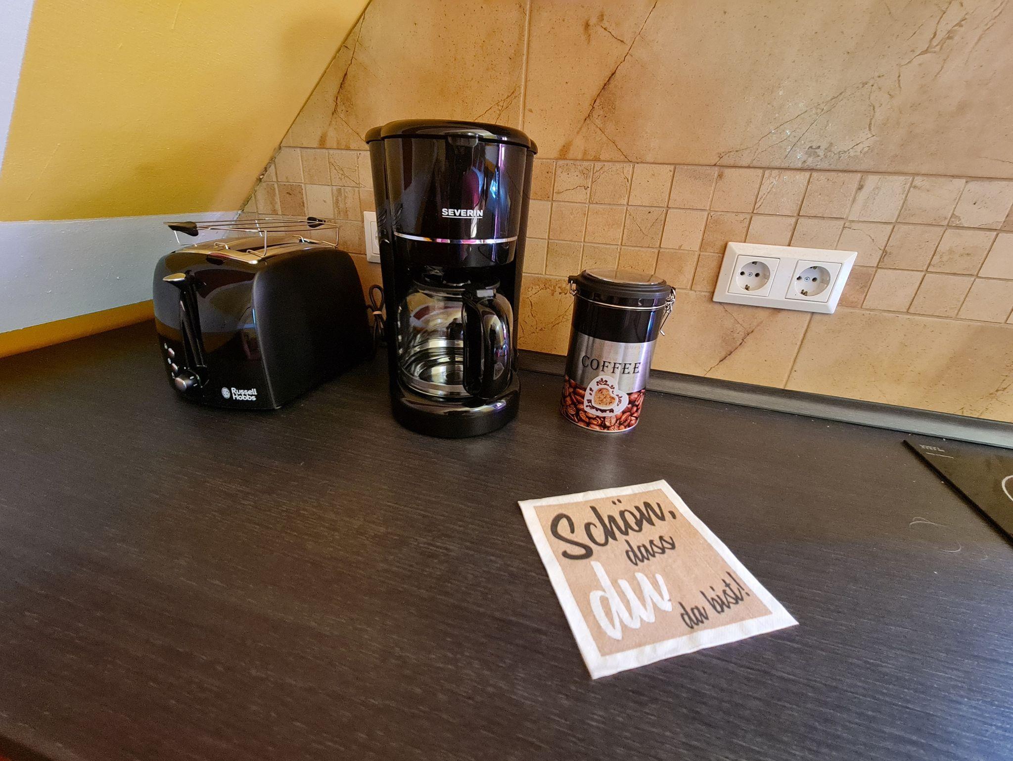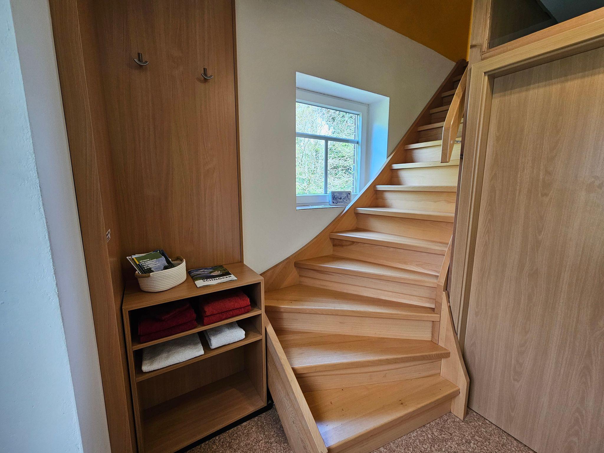 Das Appartement ist in zwei Etagen aufgeteilt. Beim Öffnen der Eingangstür begrüßt Sie eine kleine Garderobe, die Tür zum Bad und die Treppe, die Sie nach oben führt. Das Bad enthält eine Dusche, ein Waschbecken, eine Toilette, ein Urinal und natürlich ein Regal mit genügend Stauraum für Sie.