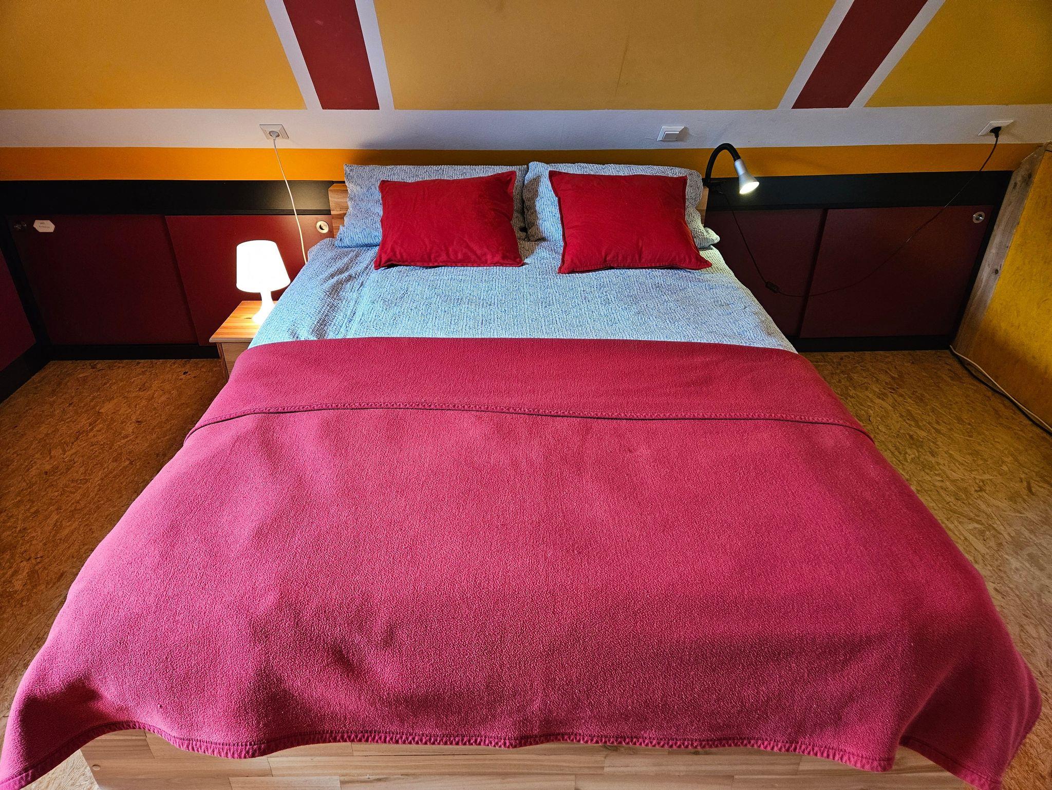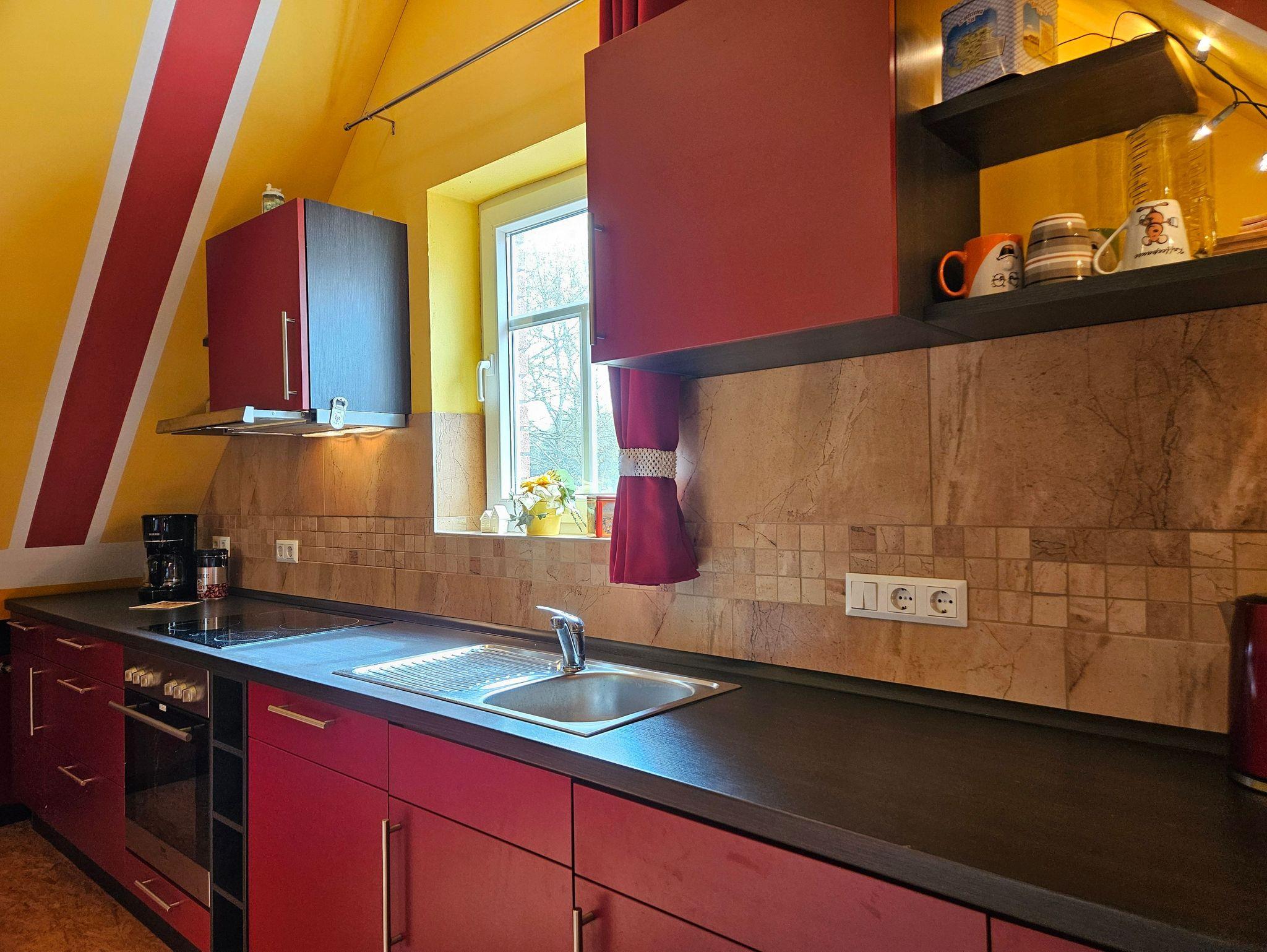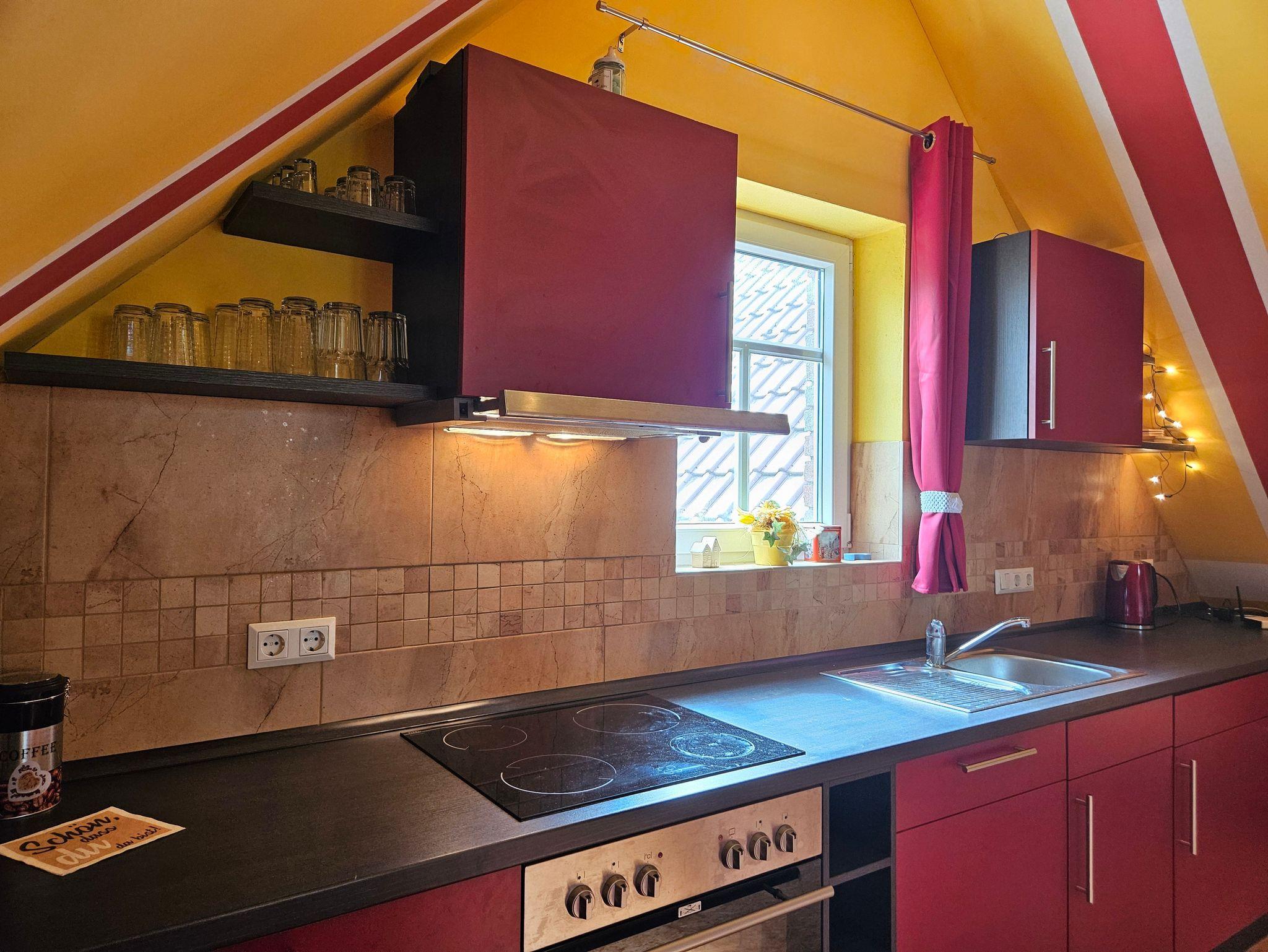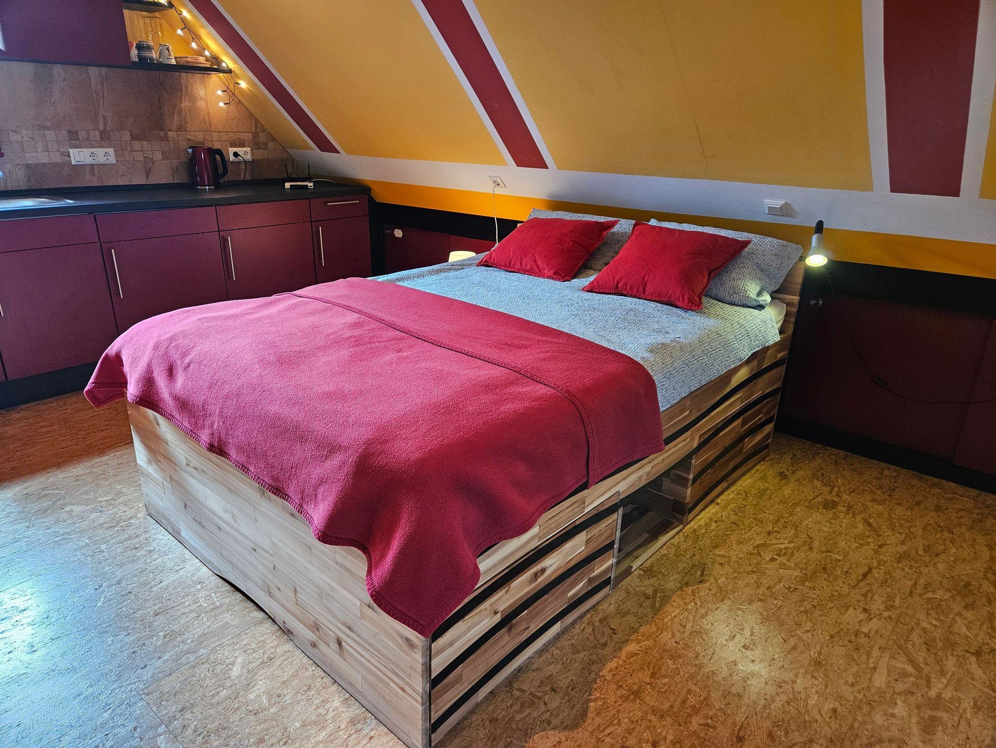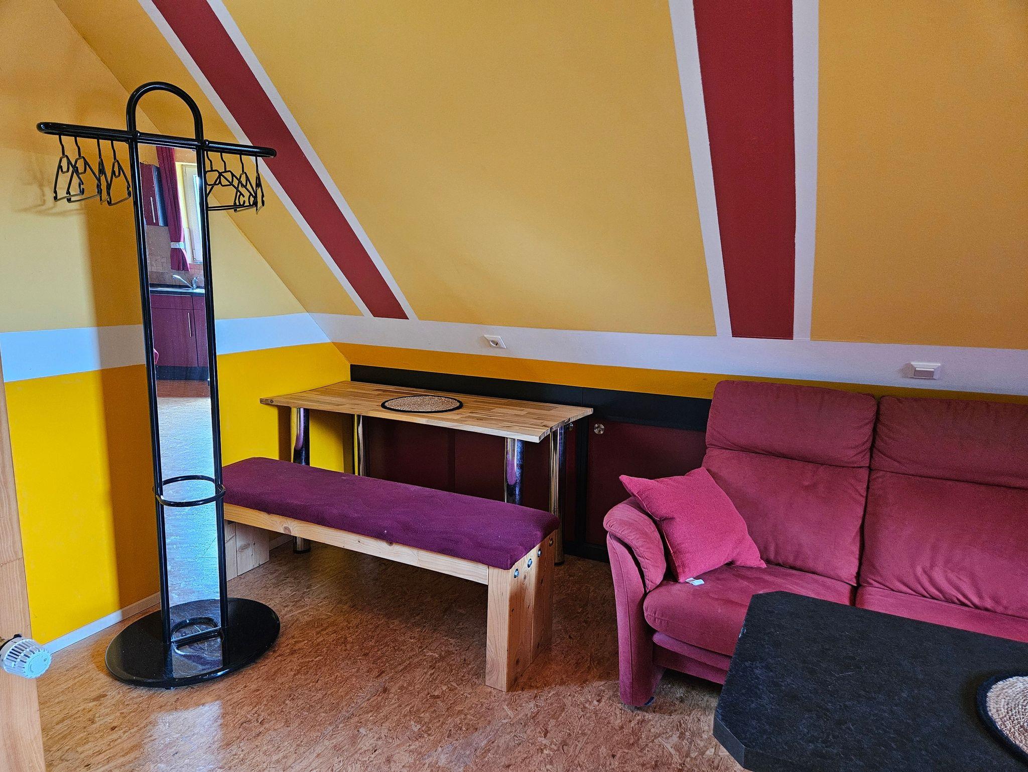 Wenn Sie nun die Treppe hinauf gehen, lädt Sie herzlich ein offener Raum mit einem gemütlichen französisches Bett (140 x 200 cm), eine Sofaecke und eine Küchenzeile zum Kochen ein. Die Küchenzeile ist komplett mit Geschirr, Besteck und Töpfen etc. bestückt und enthält eine Mikrowelle, einen Herd mit Backofen, einen Gefrierschrank und einen Kühlschrank. Zudem müssen Sie nicht von Hand spülen, denn sogar eine Spülmaschine ist vorhanden. Auch auf einen Fernseher brauchen Sie nicht verzichten, dieser ist schwenkbar, sodass man sowohl vom Bett, als auch von der Sitzecke alles im Blick hat. Die Fenster, die sich auf beiden Seiten des Raumes befinden sorgen für ein angenehmes Licht im Raum. Für ein gemütliches Beisammensitzen am Tag oder ein schönes Ausklingen am Abend lädt zusätzlich die große Gartenterrasse mit Strandkorb ein.