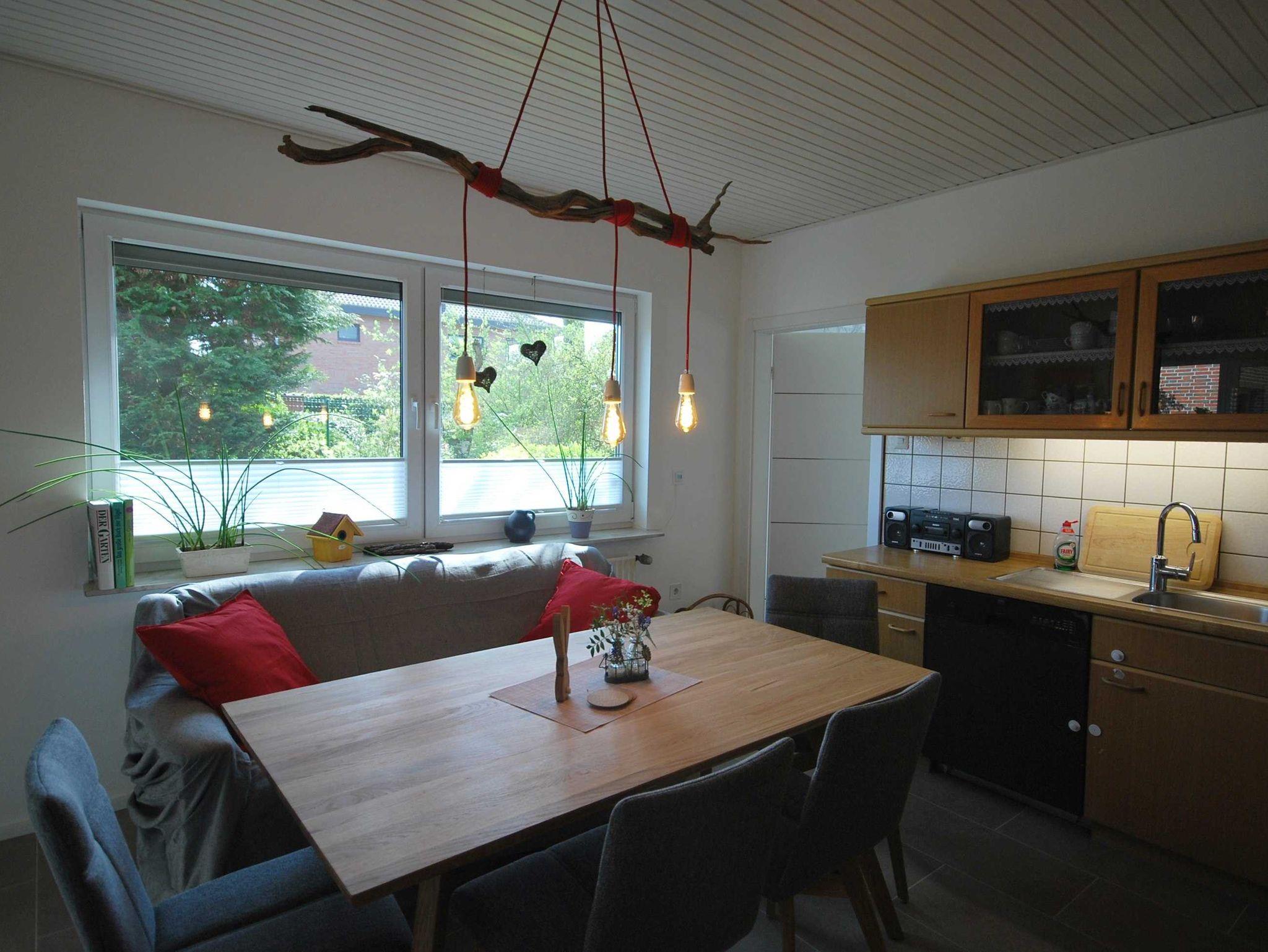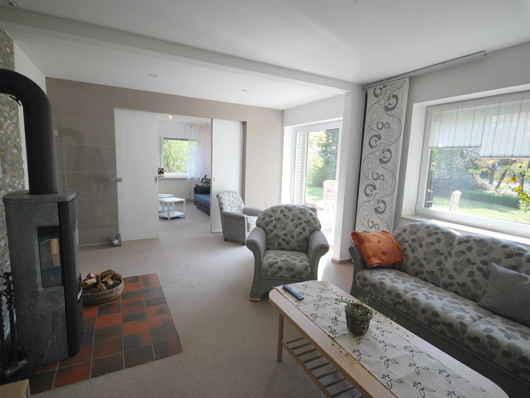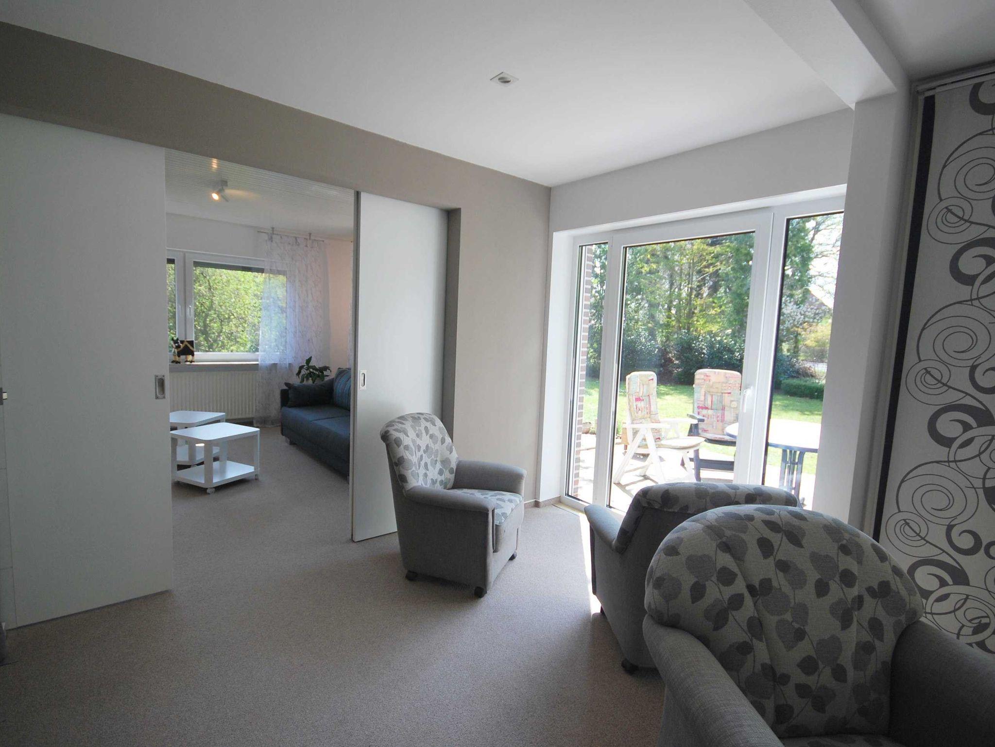 Wir begrüßen Sie in unserer mit viel Liebe zum Detail renovierten, lichtdurchfluteten 95m² Erdgeschosswohnung mitten inRemels. Die Wohnung ist barrierefrei und verfügt über einen separaten Eingang sowie einen großen Garten mitTerrasse.Schlafzimmer mit Doppelbett, Wohnzimmer mit Kamin, zweites kleineres Wohnzimmer mit Schlafcouch (welchesmit einer Schiebetür abgetrennt werden kann), komplett ausgestattete Küche mit Geschirrspülmaschine und Backofen,Bad mit Dusche und WC, separates WC, Hauswirtschaftsraum m. Waschmaschine + Trockner.