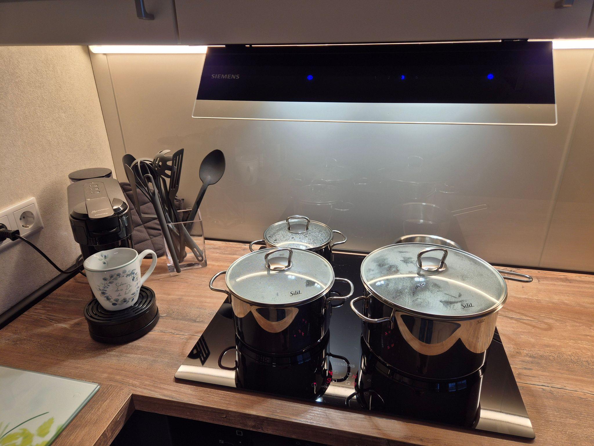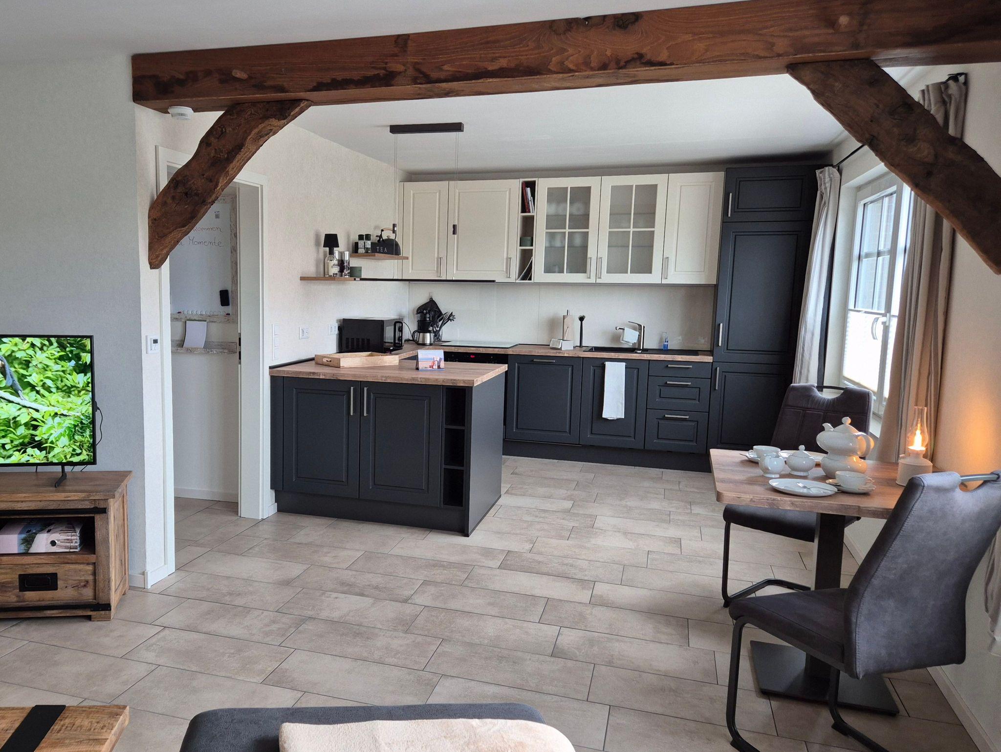 Unsere Ferienwohnung Mörgensünn im Erdgeschoss ist ca. 67qm groß und verfügt über einen großen Wohnraum mit integrierter Landhausküche. Die Küche ist ausgestattet mit: Kühlgefrierkombination, Induktionsherd, Mikrowelle, Geschirrspüler, Toaster, Kaffeemaschine (Pads u. Filterkaffee) Wasserkocher. Im Wohnzimmer könnt ihr es euch auf der Schlafcouch zum Lesen oder Fernsehen bequem machen. Ihr findet diverse Spiele sowie Bücher und Zeitschriften zum Thema Ostfriesland zum Schmöckern.