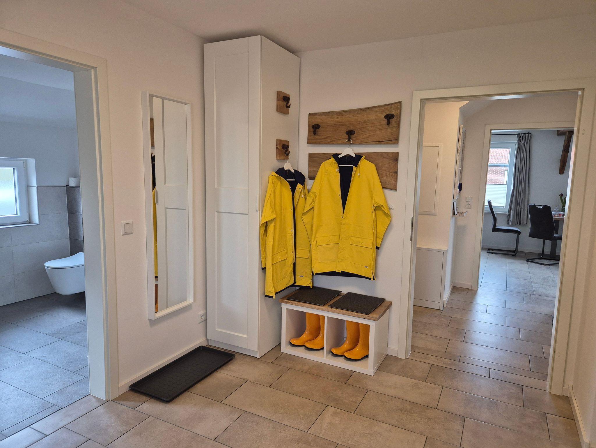 Über die teilweise überdachte Terrasse betretet ihr den großen Eingangsbereich mit Garderobe.