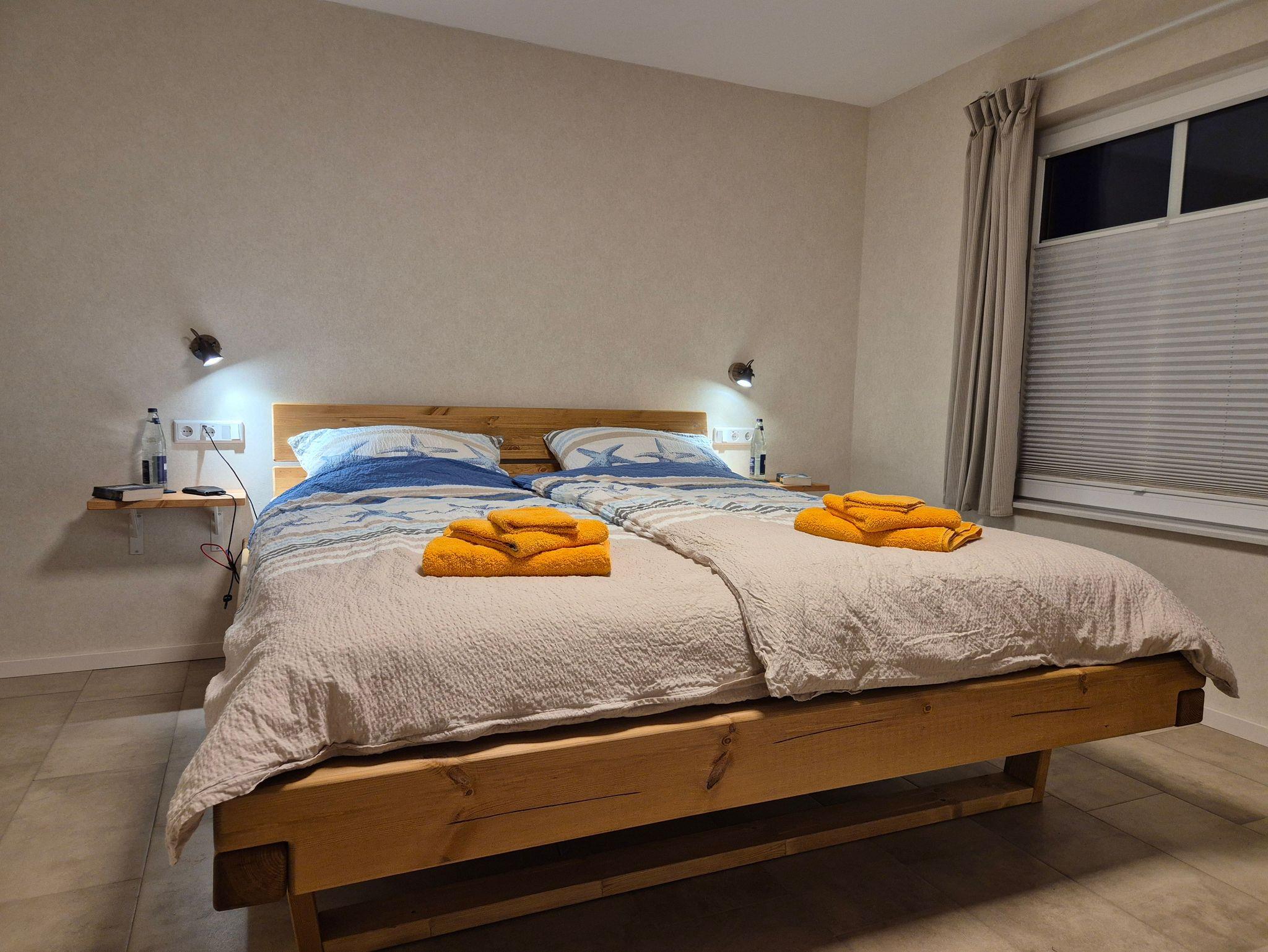 Im Schlafzimmer steht euch ein 200 x 180 cm großes Doppelbett zur Verfügung. Ihr könnt euch von der Sonne wecken lassen oder das Schafzimmer mit Gardinen abdunkeln. Außerdem gibt es eine gemütliche Leseecke.