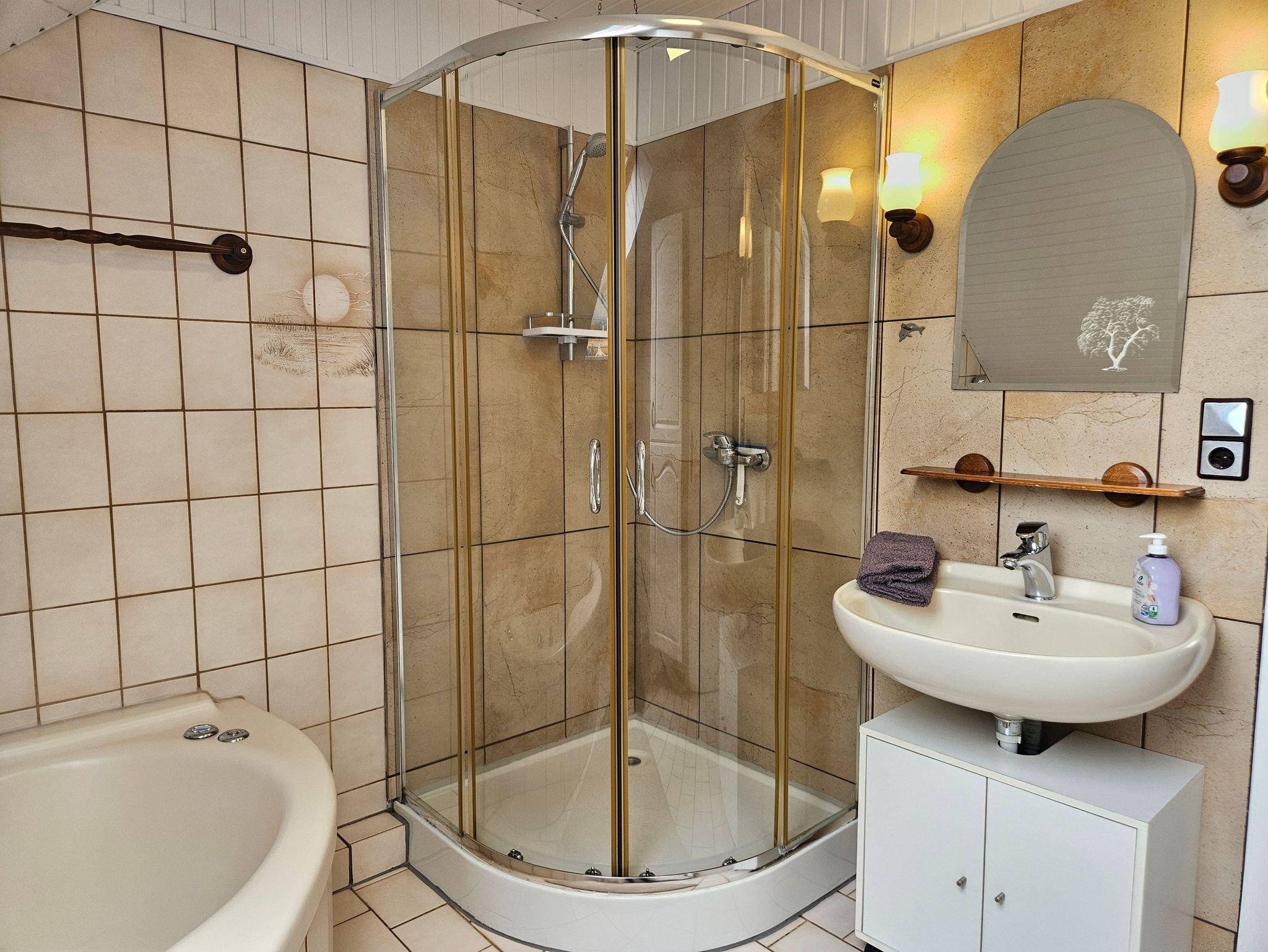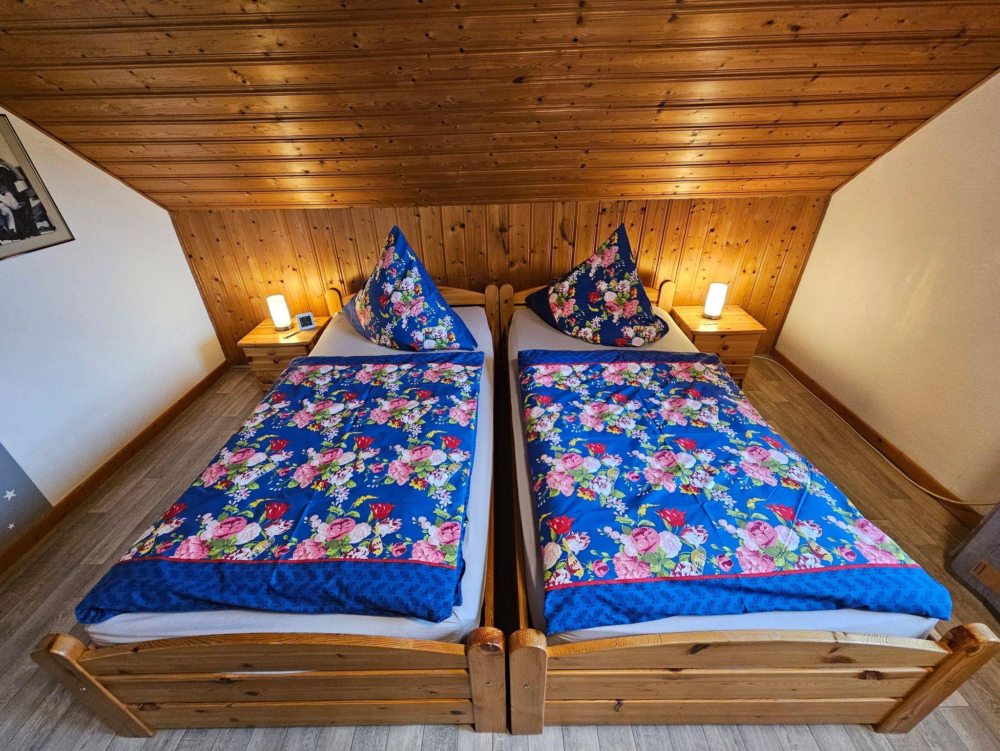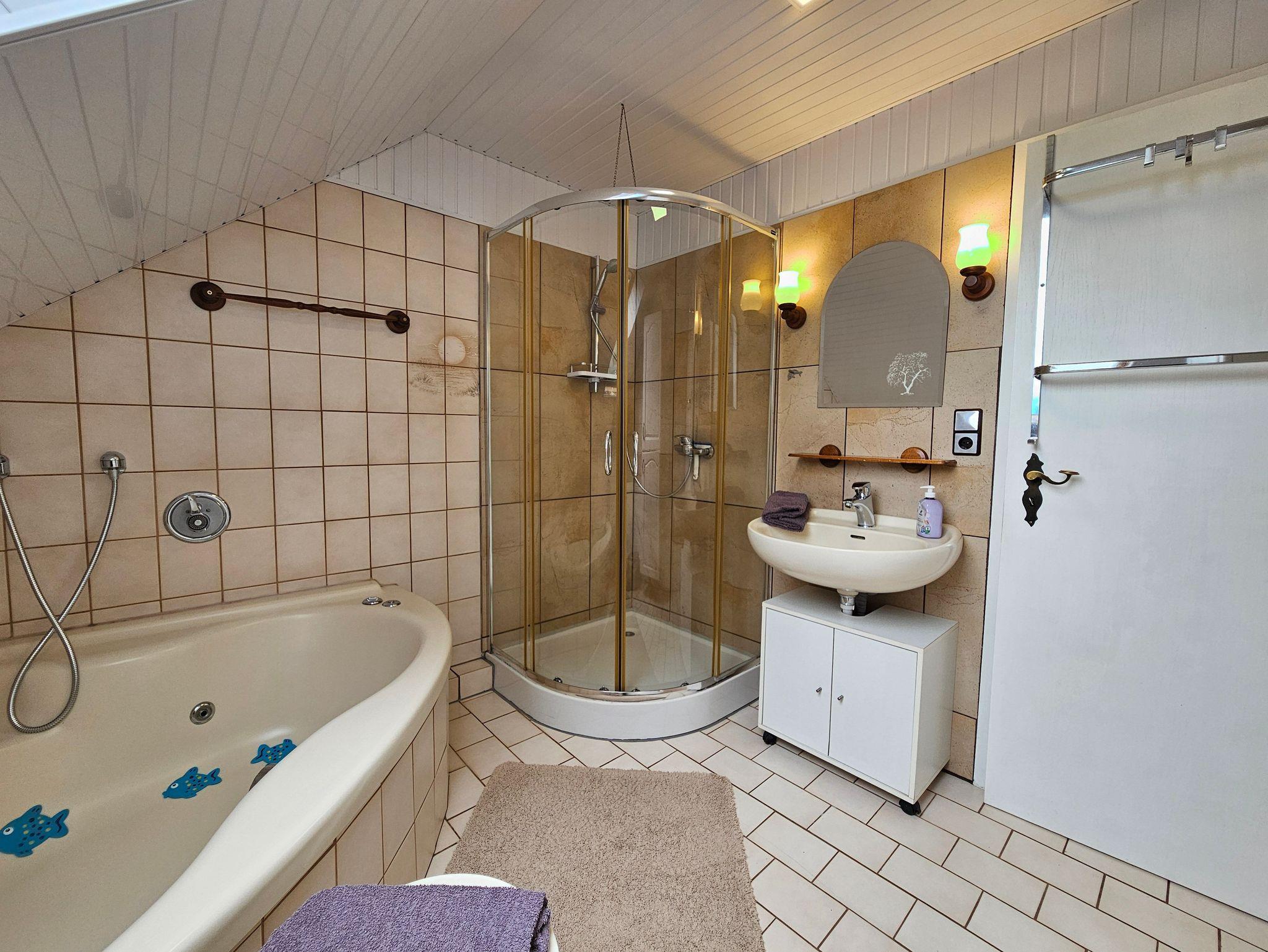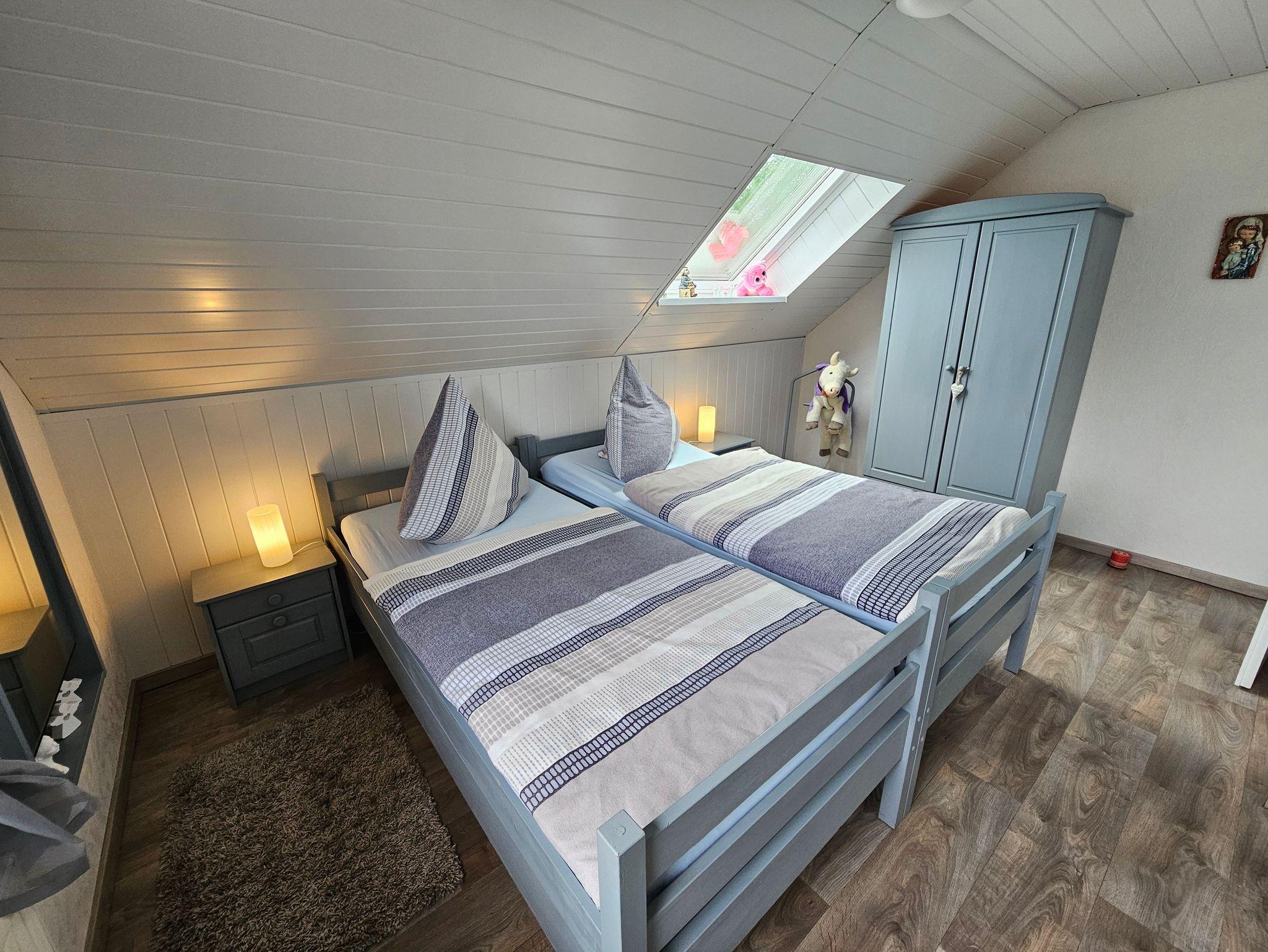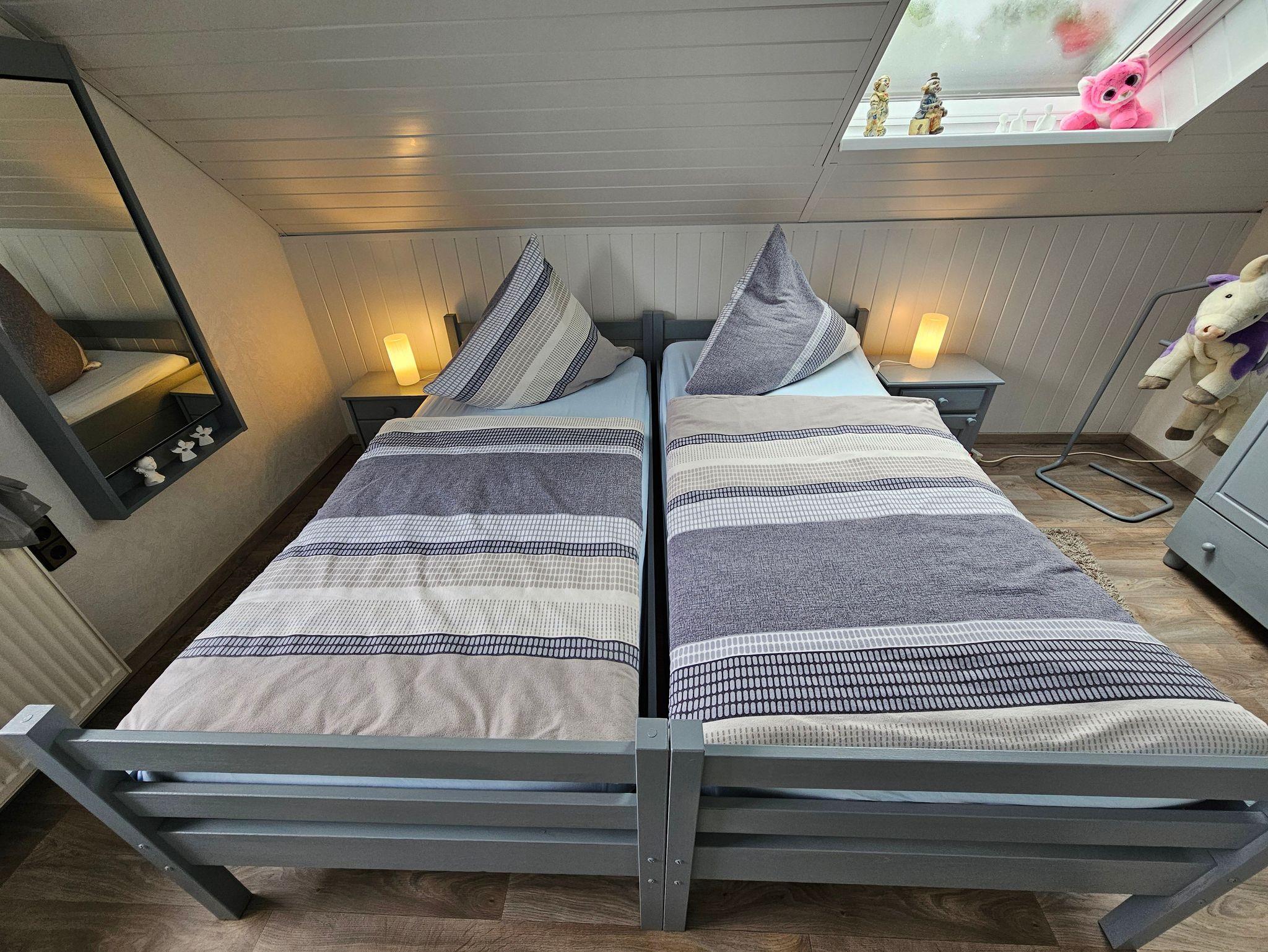Gemütliche Ferienwohnung mit etwa 60qm Wohnfläche. Sie besteht aus zwei Schlafzimmern. Das eine mit Doppelbett und einem Flachbild-TV. Das andere Schlafzimmer besteht aus zwei Einzelbetten im gemütlichen Flair. Ein Kinderbett ist vorhanden und kann auf Anfrage genutzt werden. Selbstverständlich sind die Betten bezogen. Zusätzliche Decken und Kissen sind auf Wunsch erhältlich. Das Wohnzimmer mit gemütlicher Sitzecke und großen Flachbild TV lädt zum Verweilen ein. Ihnen steht auch eine voll ausgestattete Küche mit vielerlei Geräten zur Verfügung. Das Bad hält eine große Badewanne mit Whirlpool bereit und hier lässt es sich ideal entspannen.
