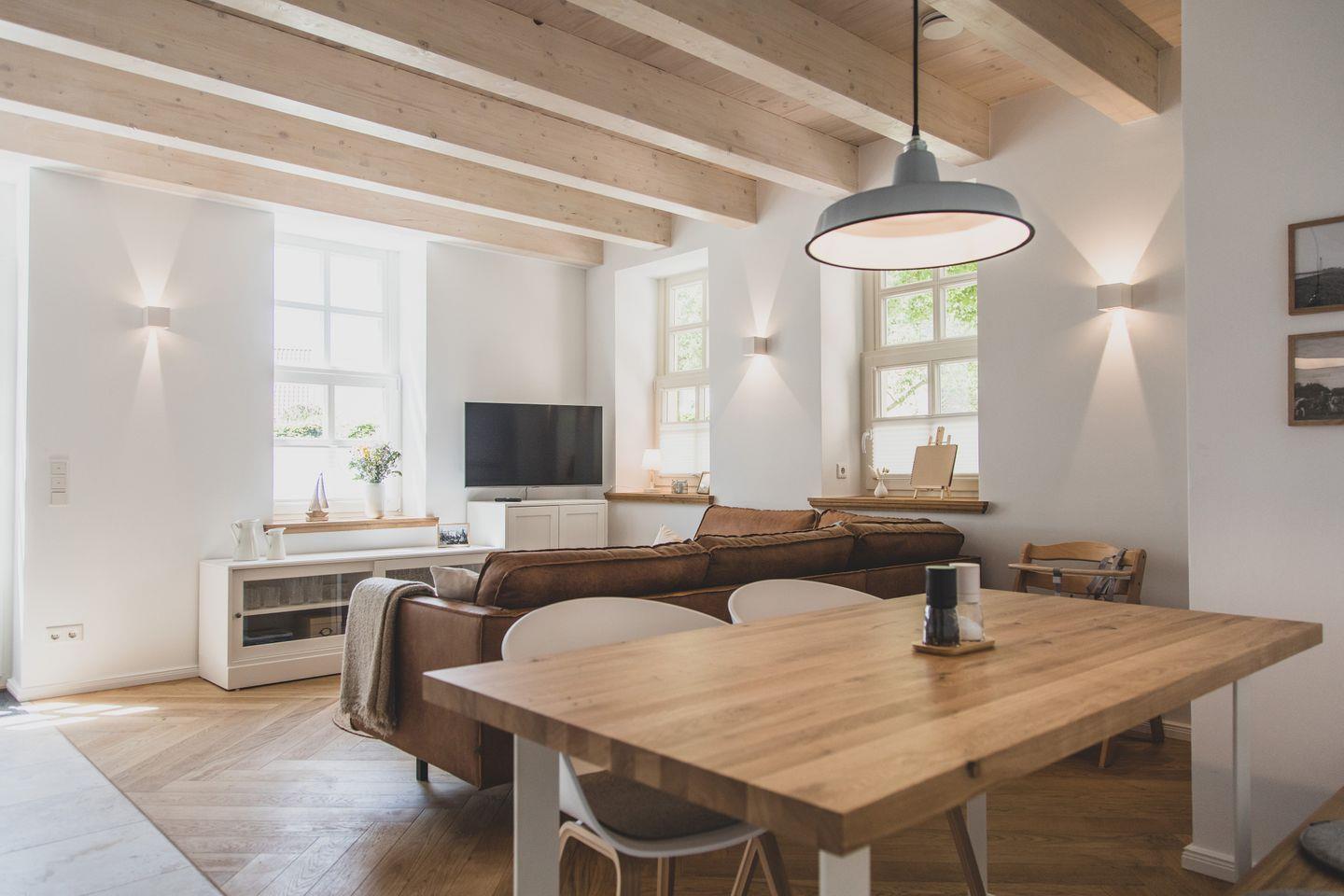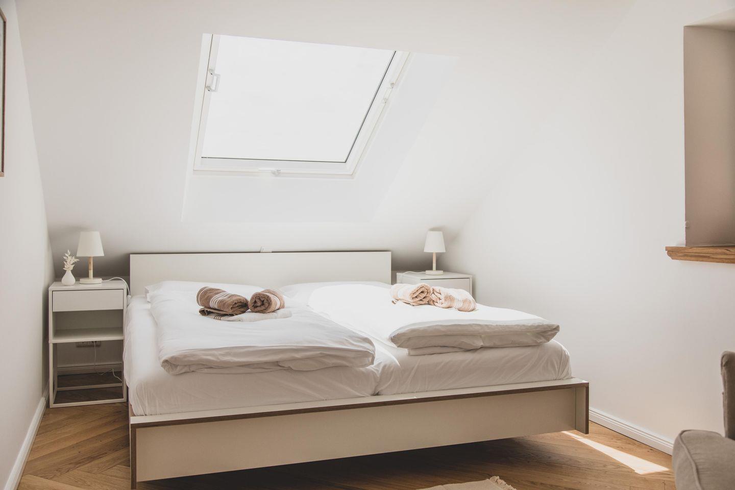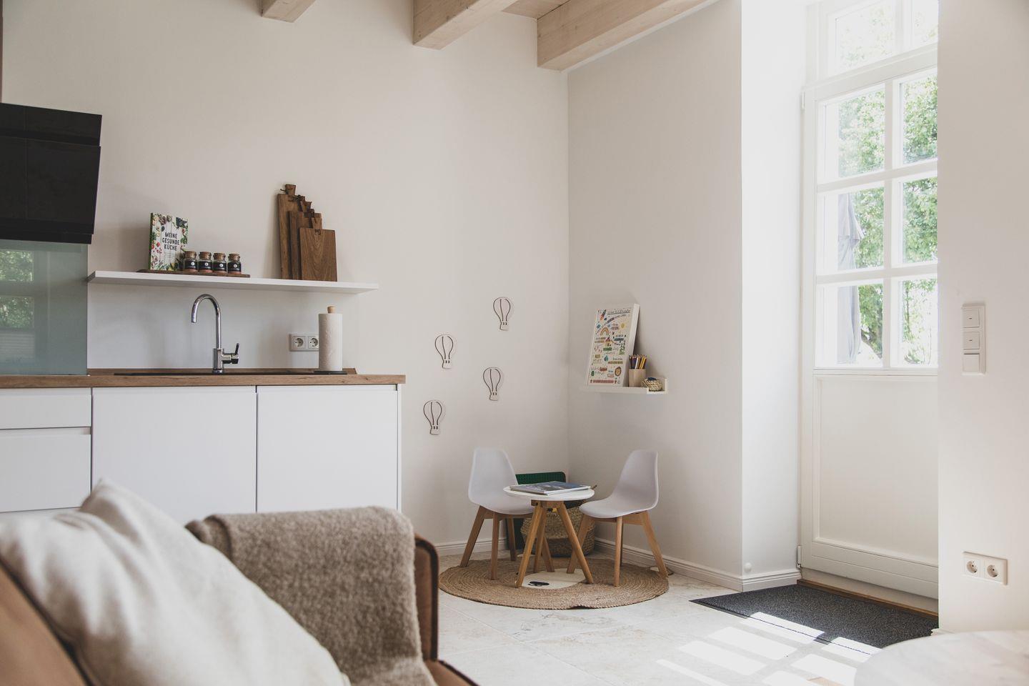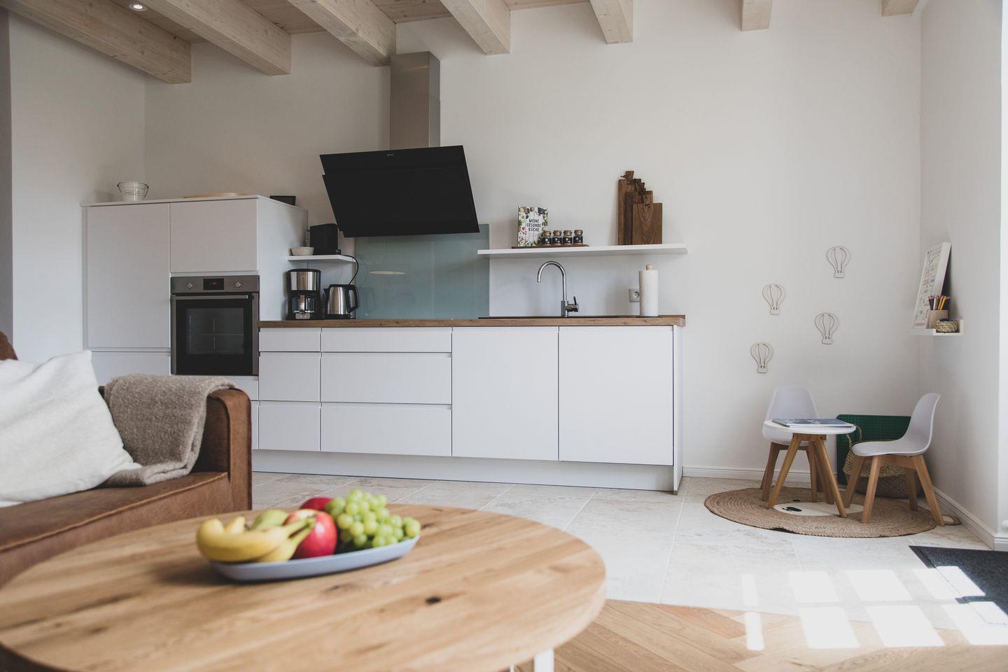 Mit einer großzügigen Fläche von 70 m² bietet die Wohnung Platz für bis zu vier Gäste. Sie verfügt über zwei geschmackvoll eingerichtete Schlafzimmer, die für einen erholsamen Schlaf sorgen. Der lichtdurchflutete Wohnbereich lädt zum Verweilen ein und ist mit einem gemütlichen Sofa sowie einem Esstisch ausgestattet, der Platz für gemeinsame Mahlzeiten bietet. Die offene Küche ist modern und voll ausgestattet mit hochwertigen Geräten wie einem Induktionsherd, Backofen, Geschirrspüler und einer Mikrowelle - ideal für Hobbyköche.