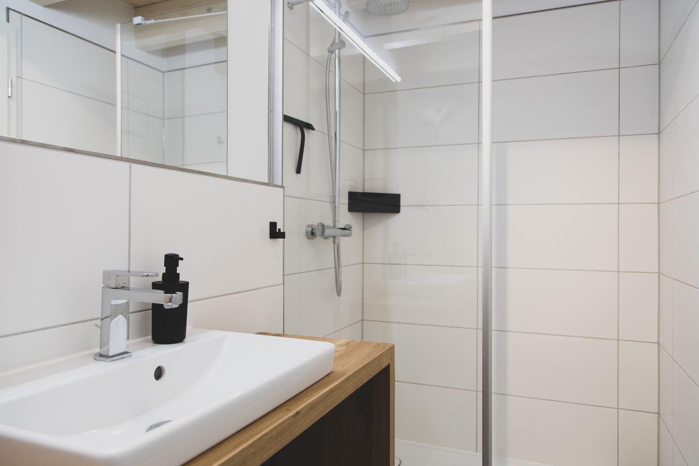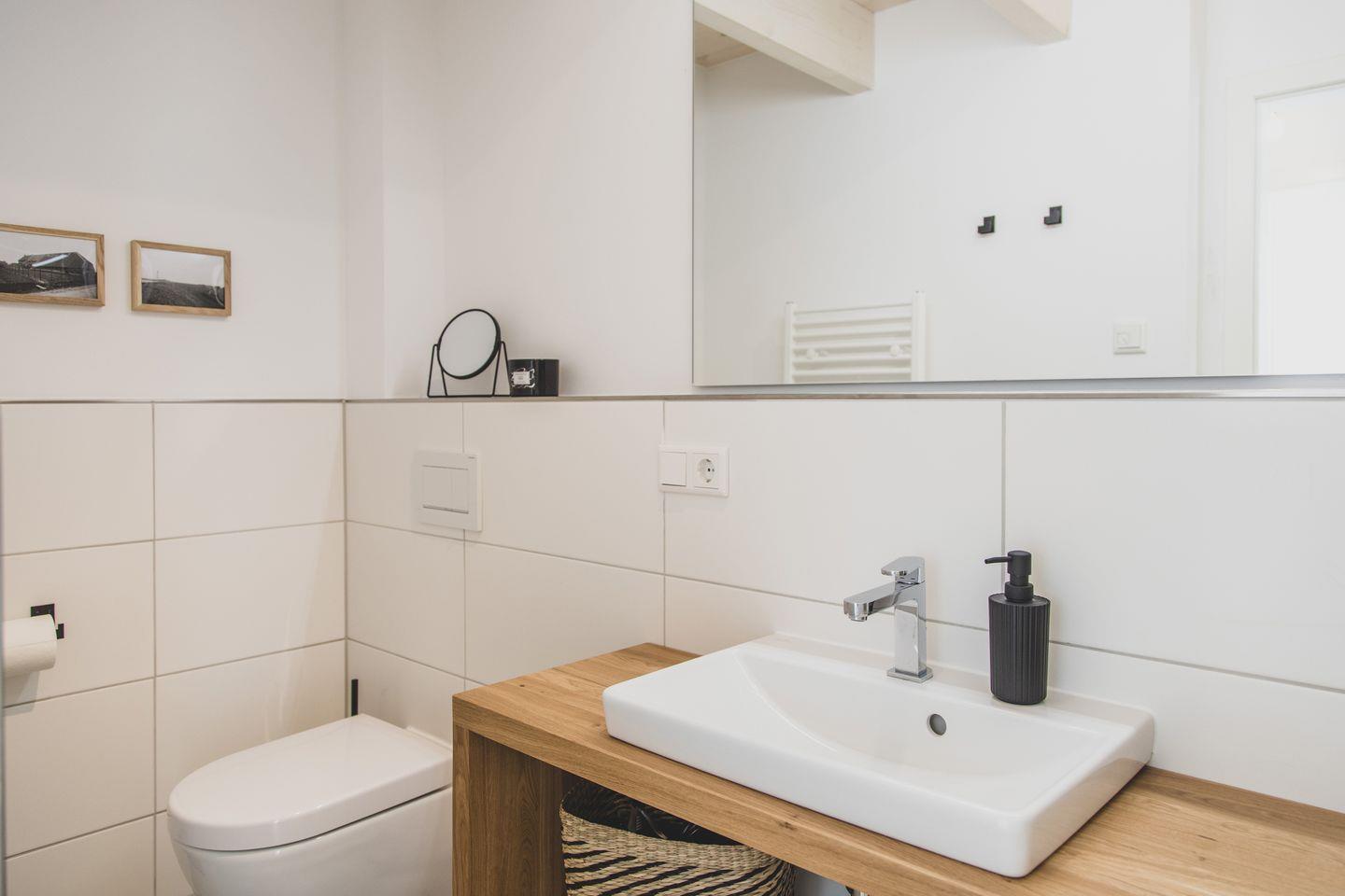 Nach einem erlebnisreichen Tag erwartet Sie im Badezimmer eine bodengleiche Dusche, die mit warmem Wasser versorgt wird. Hier finden Sie auch einen Haartrockner sowie weitere Annehmlichkeiten wie Handtücher und Badausstattung. Für Eltern mit kleinen Kindern ist die Wohnung bestens ausgestattet: Ein Babybett, ein Hochstuhl und Spielzeug sind vorhanden, um den Kleinen einen sorgenfreien Aufenthalt zu ermöglichen.