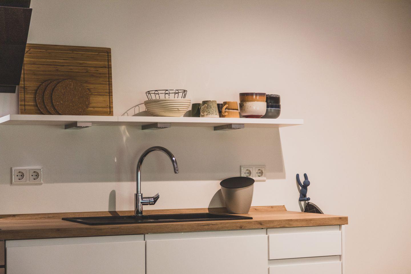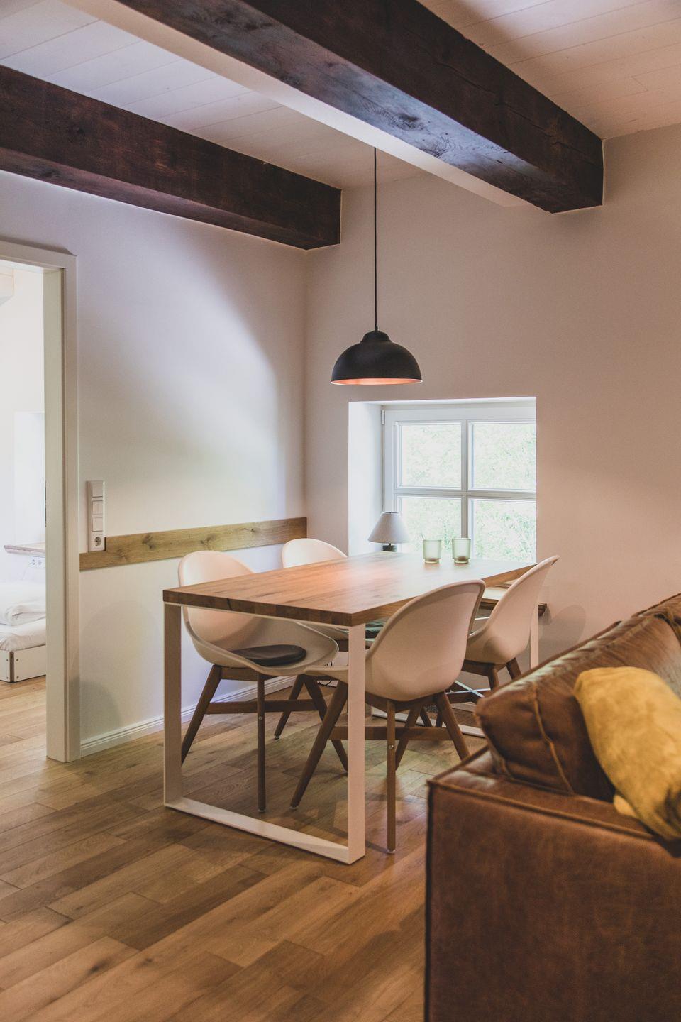 Die Wohnung ist liebevoll gestaltet und mit modernem Komfort ausgestattet. Sie verfügt über zwei komfortable Schlafzimmer mit Parkettboden, die für erholsamen Schlaf sorgen. Das großzügige Wohnzimmer schließt sich an die offene Küche an und ist der perfekte Ort, um gemeinsame Zeit zu verbringen. Hier können Sie am Esstisch zusammen speisen oder sich auf der Sofaecke entspannen. Die voll ausgestattete Küche lässt keine Wünsche offen und bietet alles, was Sie für die Zubereitung köstlicher Mahlzeiten benötigen, inklusive Induktionsherd, Spülmaschine, und Mikrowelle.