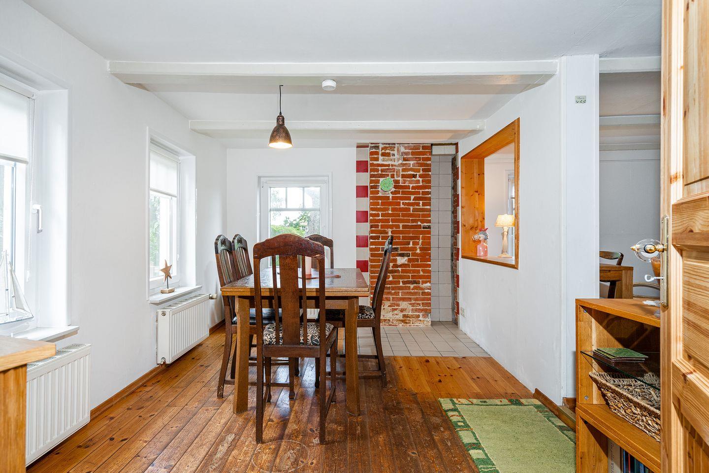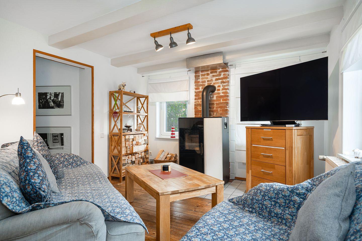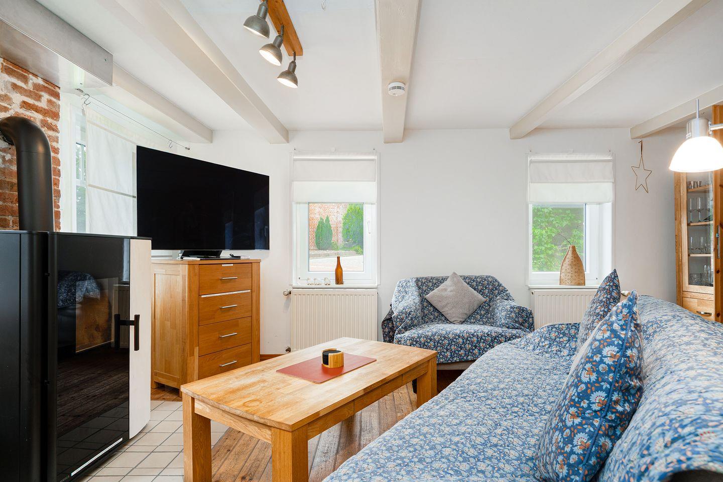 Mit Betreten des Hauses spüren Sie durch die Holzbalkendecke und die tollen Holzdielen sofort den historischen Charme dieses Hauses. Das Wohnzimmer verfügt über drei gemütliche Sofa mit Blick auf den großen Fernseher und den Pelletofen, der im Winter für angenehme Wärme sorgt. Im Esszimmer mit ausziehbarem Esstisch befindet sich ein zweiter Fernseher, sowie räumlich abgetrennt ein Schreibtisch und ein ausziehbares Schlafsofa für 1-2 Personen. Die Küche ist mit allen notwendigen Gerätschaften ausgestattet: Kühlschrank mit Gefrierschrank, Spülmaschine, Backofen, Ceran-Kochfeld, Mikrowelle, Kaffeemaschine, Toaster, Wasserkocher u.v.m..