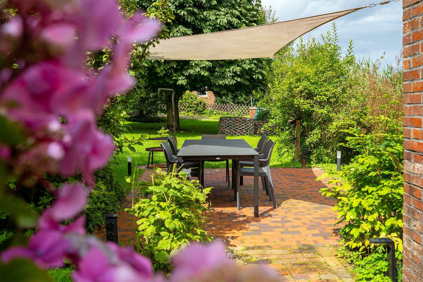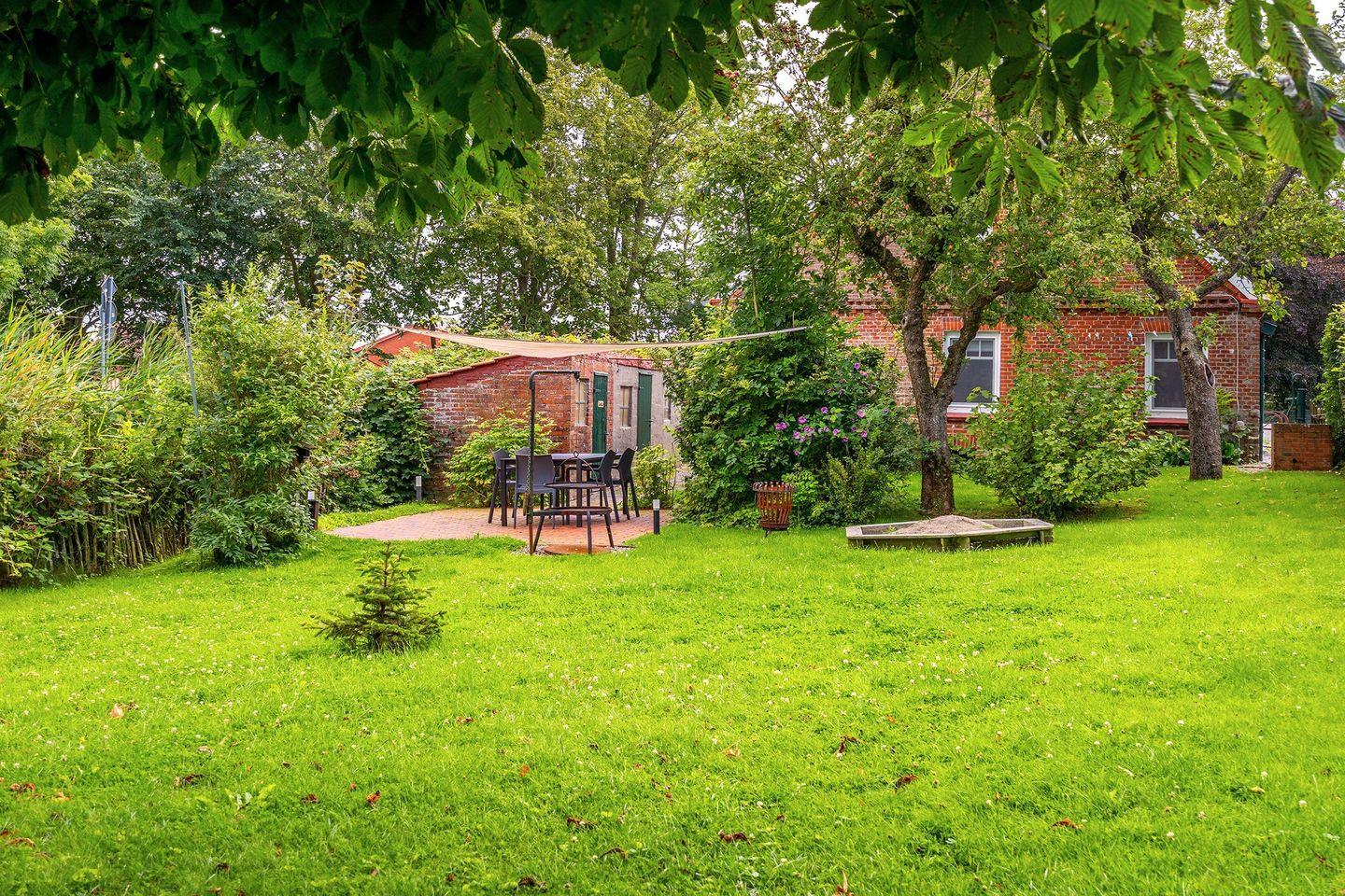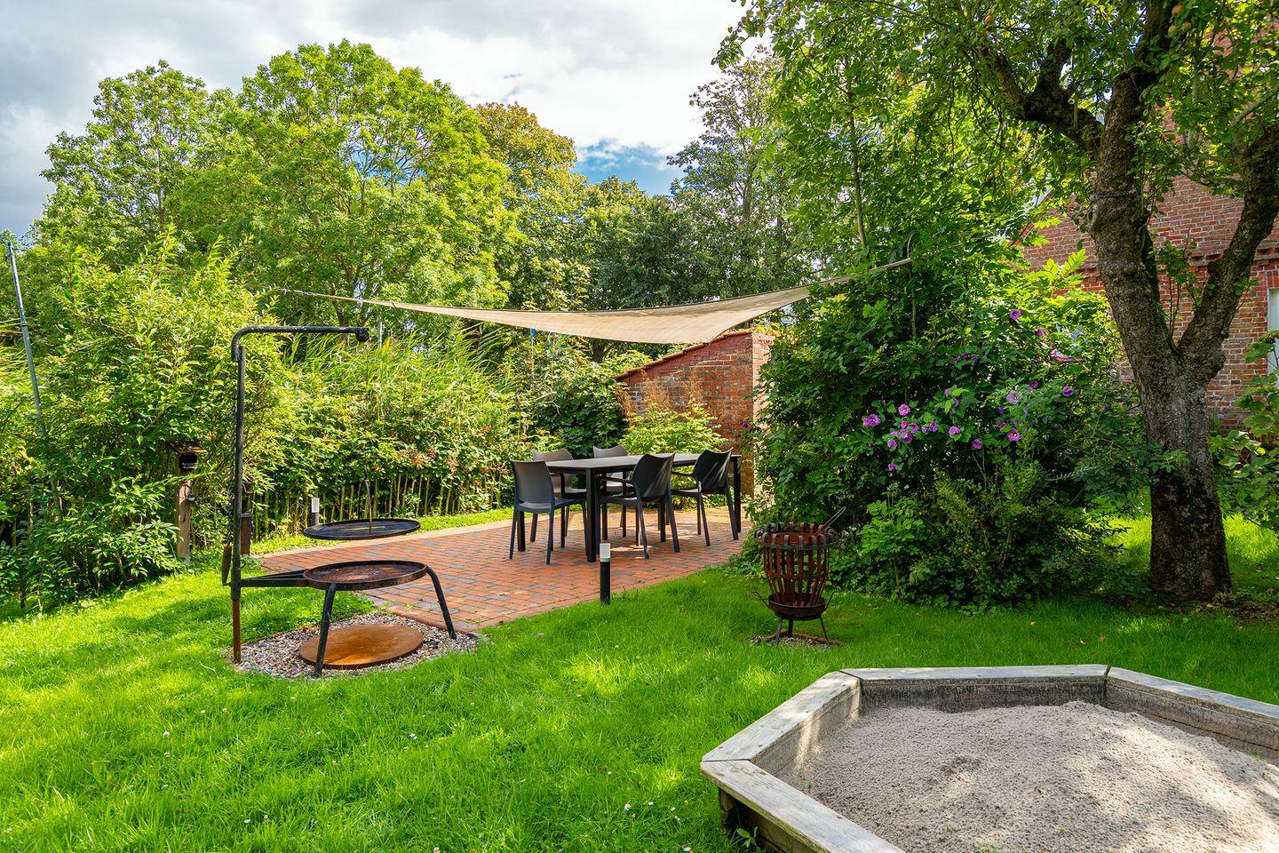 Der große Garten mit attraktiver Gartenbeleuchtung eignet sich ideal für Hunde und Kinder zum Toben und Spielen, ebenfalls ein Sandkasten für die Kinder ist vorhanden. Die vorhandene Terrasse ist möbliert, auch ein Schwenkgrill und ein Feuerkorb sind vorhanden.