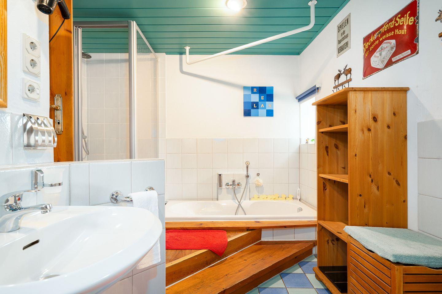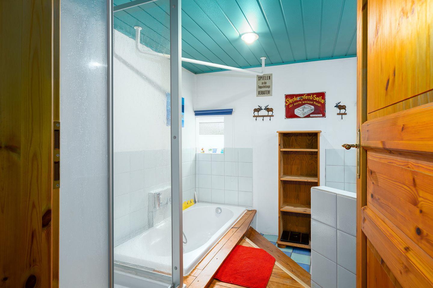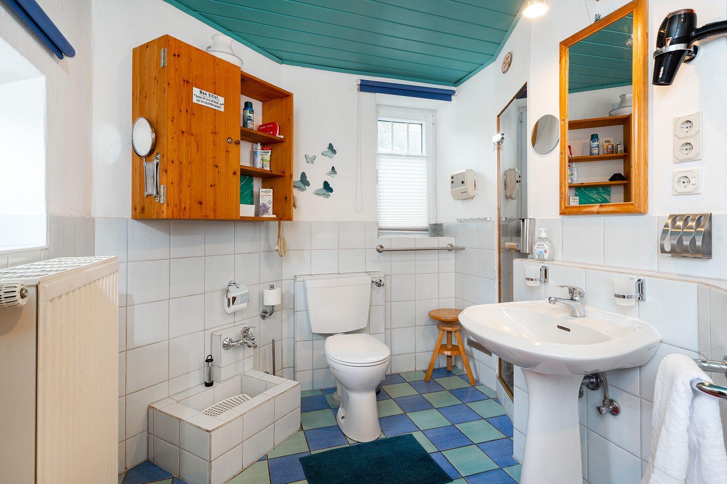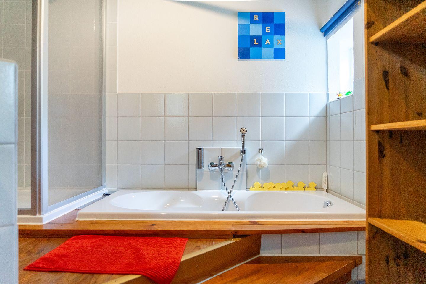 Im Erdgeschoss befinden sich ebenfalls beide Badezimmer: Ein Badezimmer verfügt über WC, Waschbecken, Fön, Dusche, Badewanne und Bio-Sauna, im zweiten Badezimmer finden Sie Waschbecken, Dusche, Pissoir und den Waschtrockner. Das Haus verfügt darüber hinaus über viele weitere praktische Dinge für den Urlaub, wie bspw. eine Schuhputzmaschine.