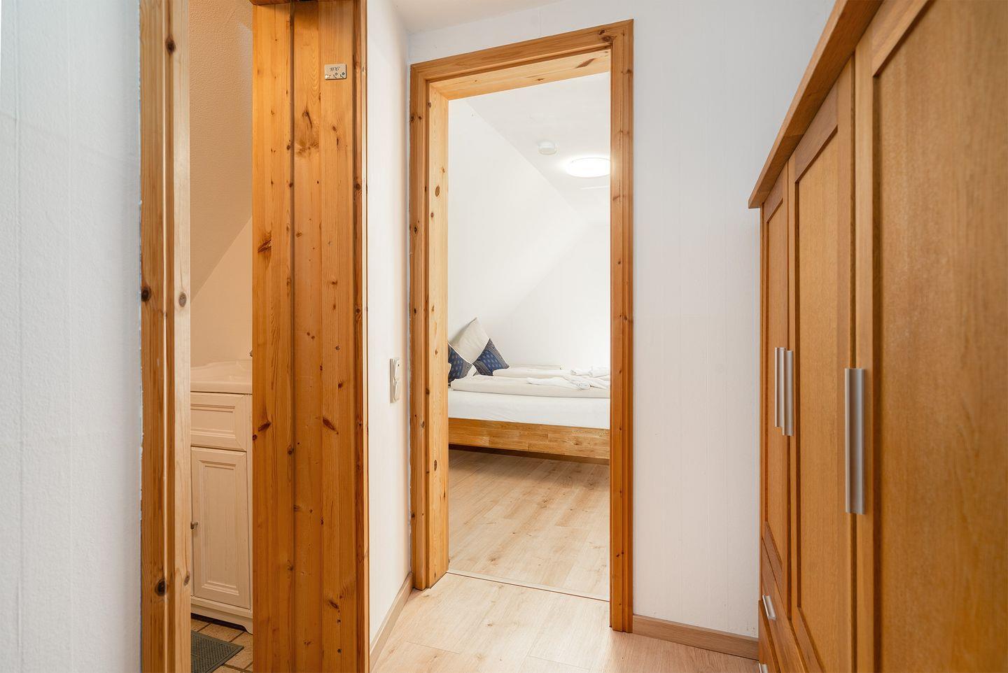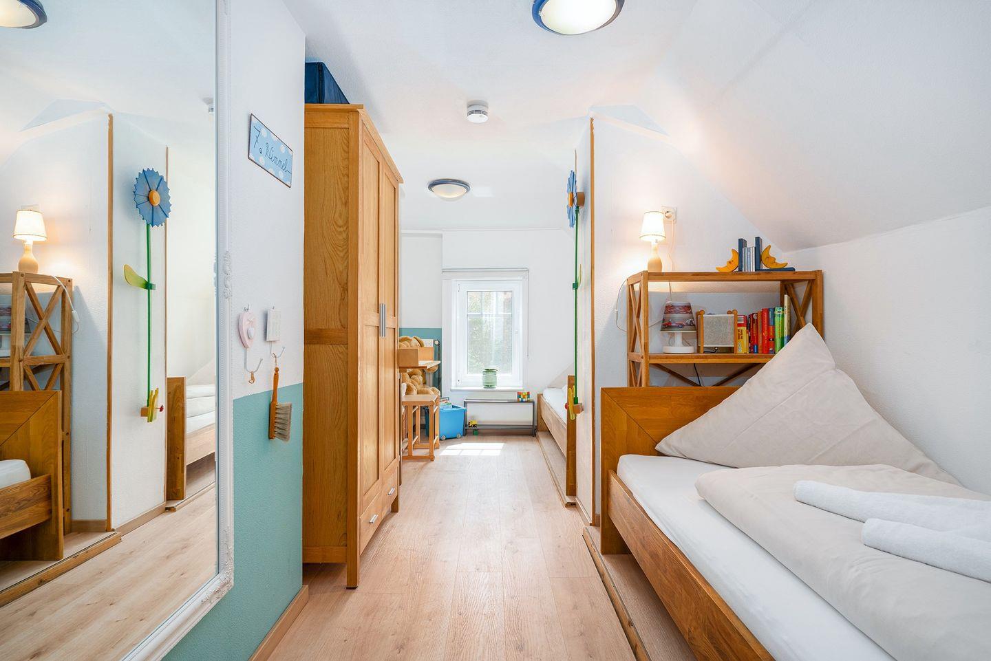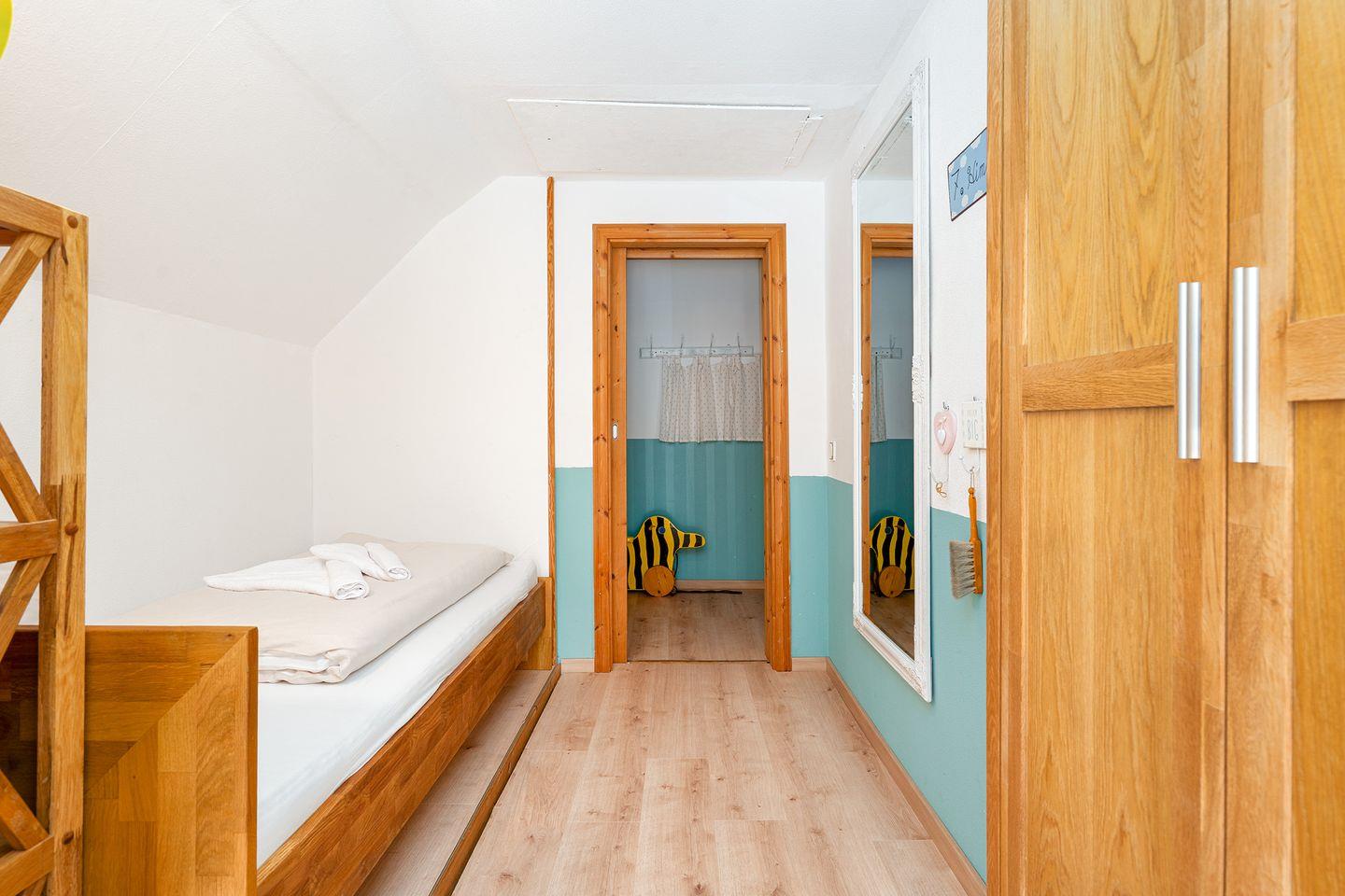 Über eine steile Treppe gelangen Sie in das Obergeschoss mit den beiden Schlafzimmern und einem Gäste-WC (nur kaltes Wasser). Ein Schlafzimmer verfügt über ein Doppelbett, das andere Schlafzimmer verfügt über zwei Einzelbetten, einen Kleiderschrank und Kinderspielzeug. In diesem Zimmer ist auch ein Wickeltisch vorhanden. Eine Treppenabsperrung als Schutz für Kinder ist auch vorhanden.