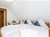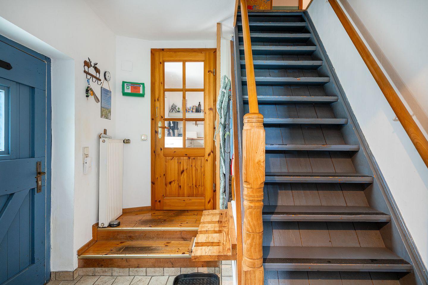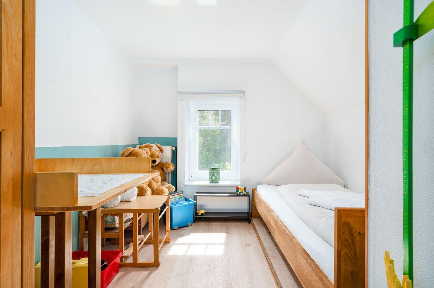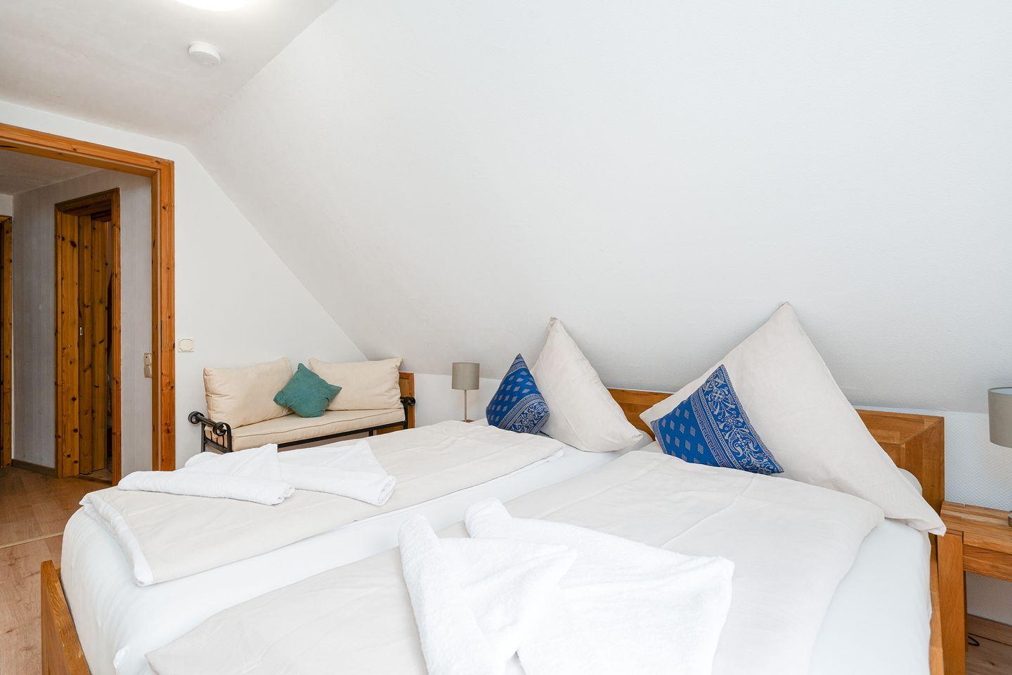 Über eine steile Treppe gelangen Sie in das Obergeschoss mit den beiden Schlafzimmern und einem Gäste-WC (nur kaltes Wasser). Ein Schlafzimmer verfügt über ein Doppelbett, das andere Schlafzimmer verfügt über zwei Einzelbetten, einen Kleiderschrank und Kinderspielzeug. In diesem Zimmer ist auch ein Wickeltisch vorhanden. Eine Treppenabsperrung als Schutz für Kinder ist auch vorhanden.