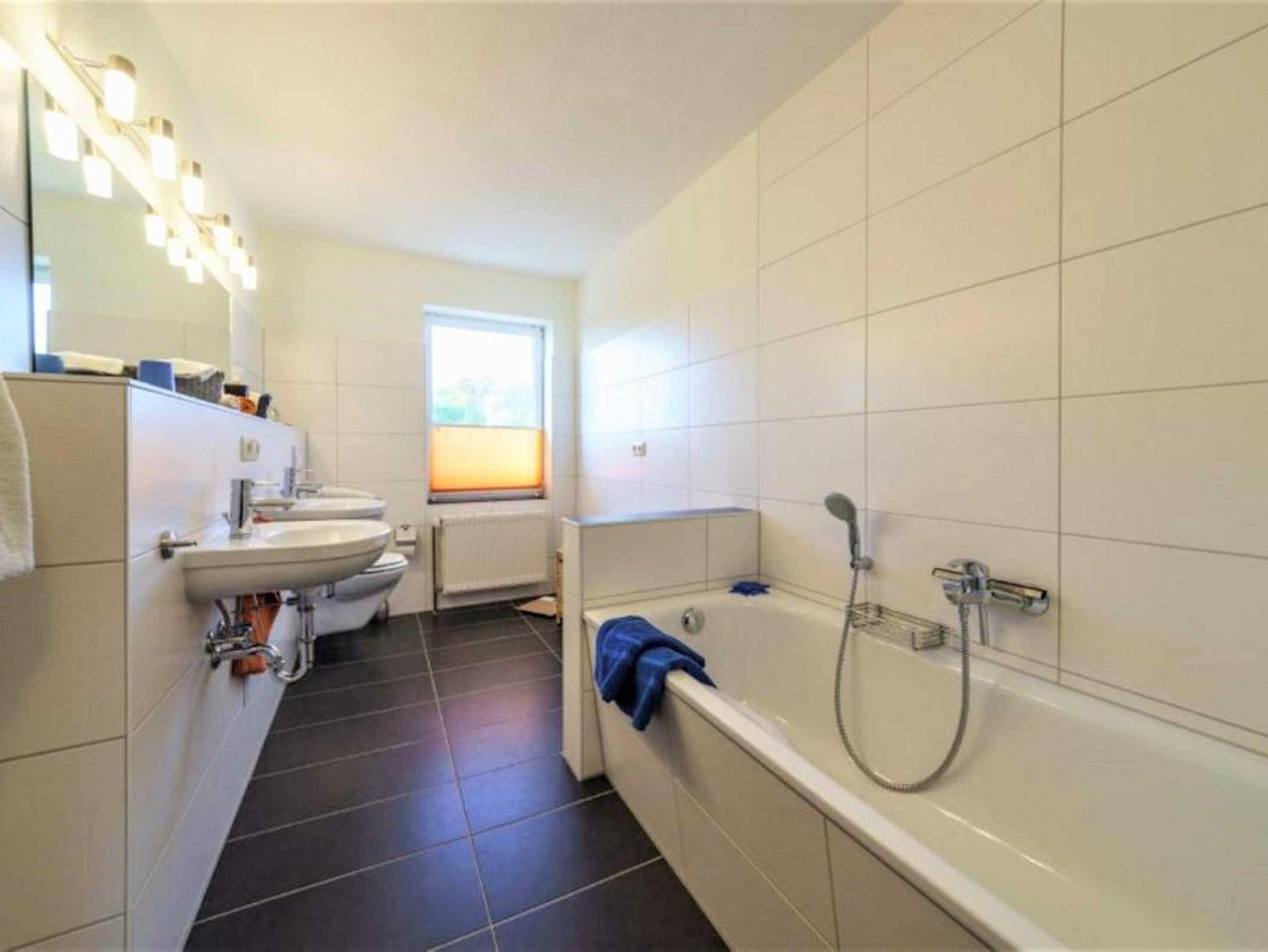 Das großzügige Bad verfügt über eine Badewanne mit Duschabgrenzung, WC und einem Haarföhn sowie zwei Waschbecken.