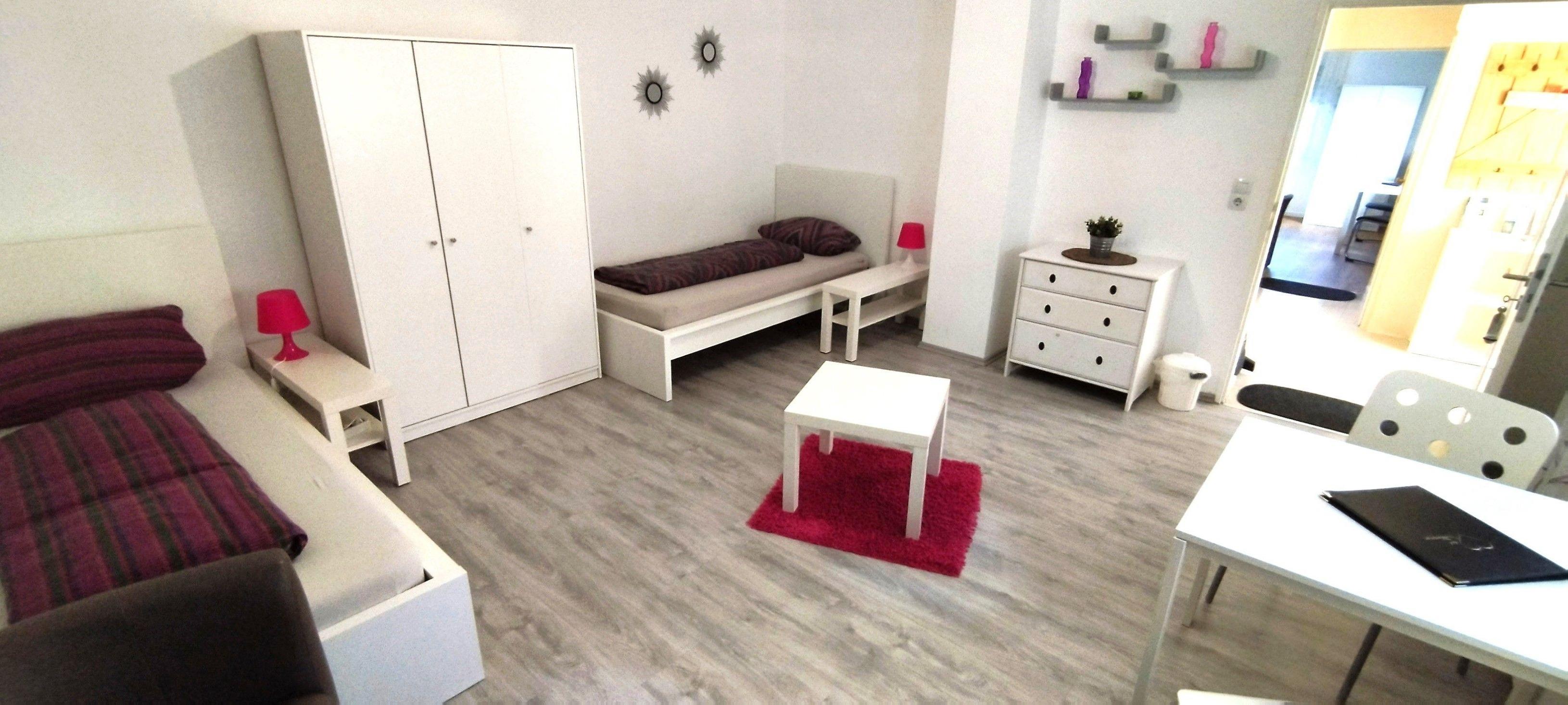 Alle Schlaf/Wohnzimmer sind mit Tisch, Nachttisch, Lampen, Schrank, Ganzkörperspiegel, LED TV und Sitzmöglichkeiten ausgestattet.