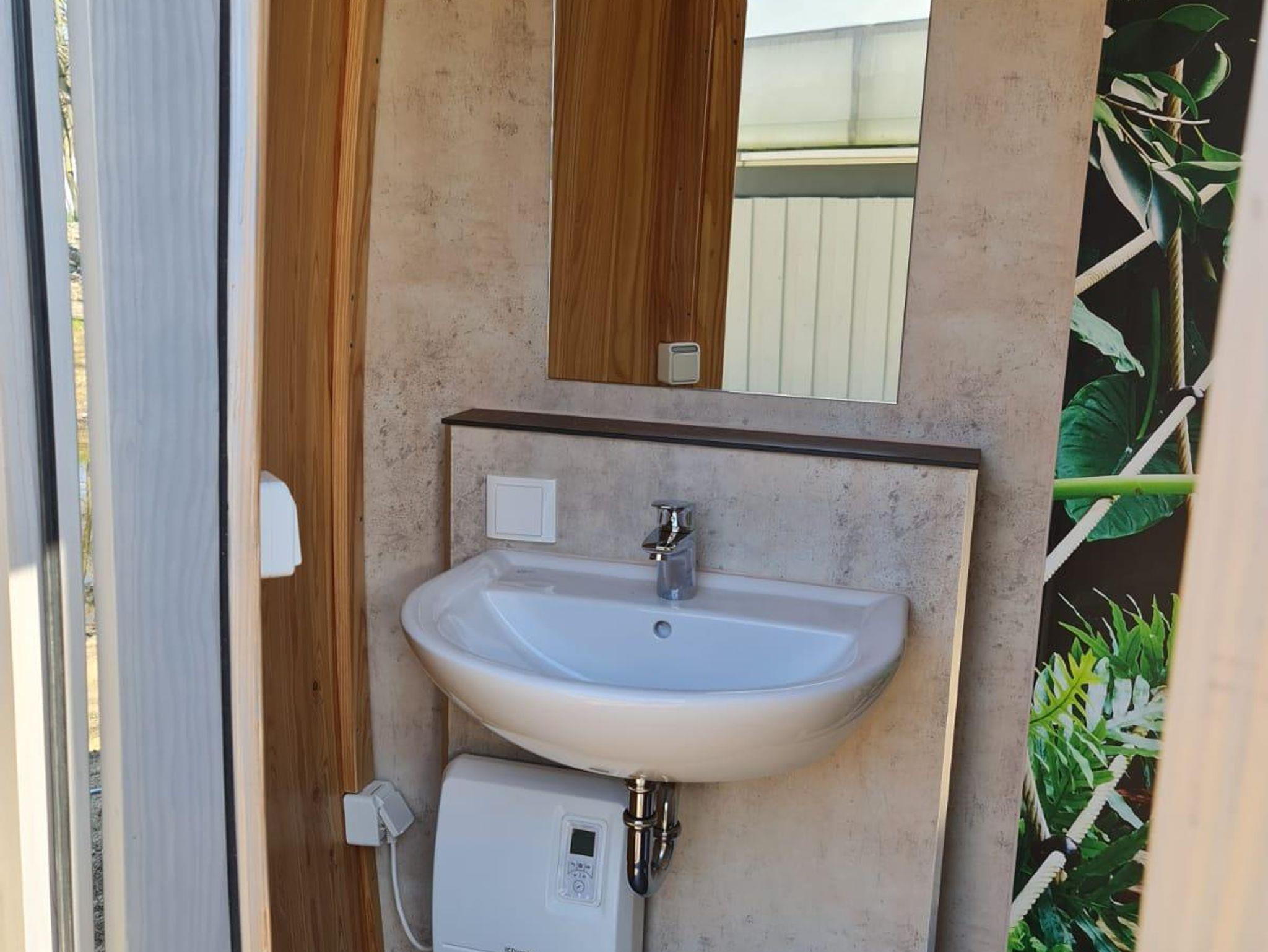Zwei Sanitärfässer auf dem Schmetterlingsparkgelände bieten komfortable Duschen und Toiletten.