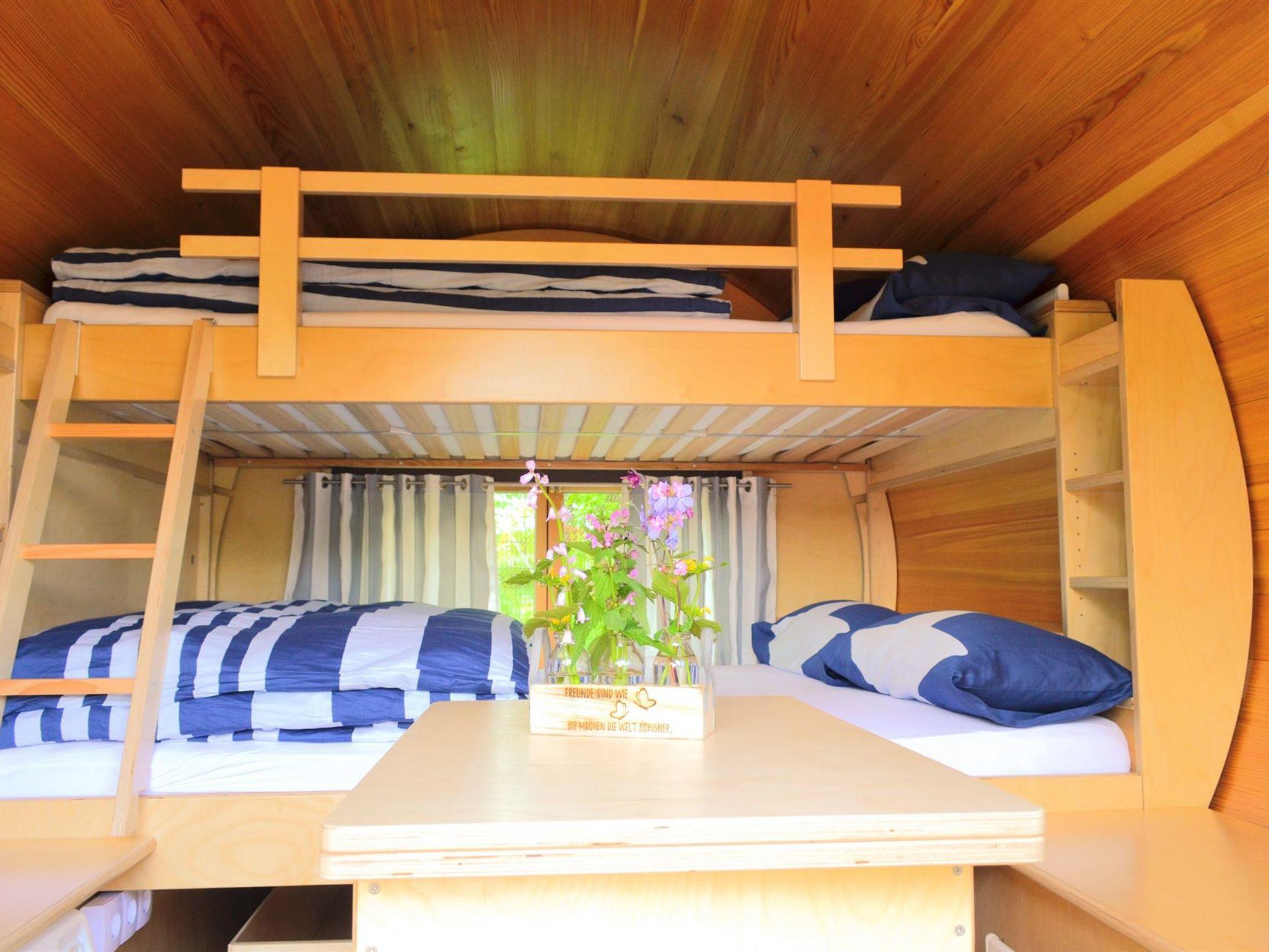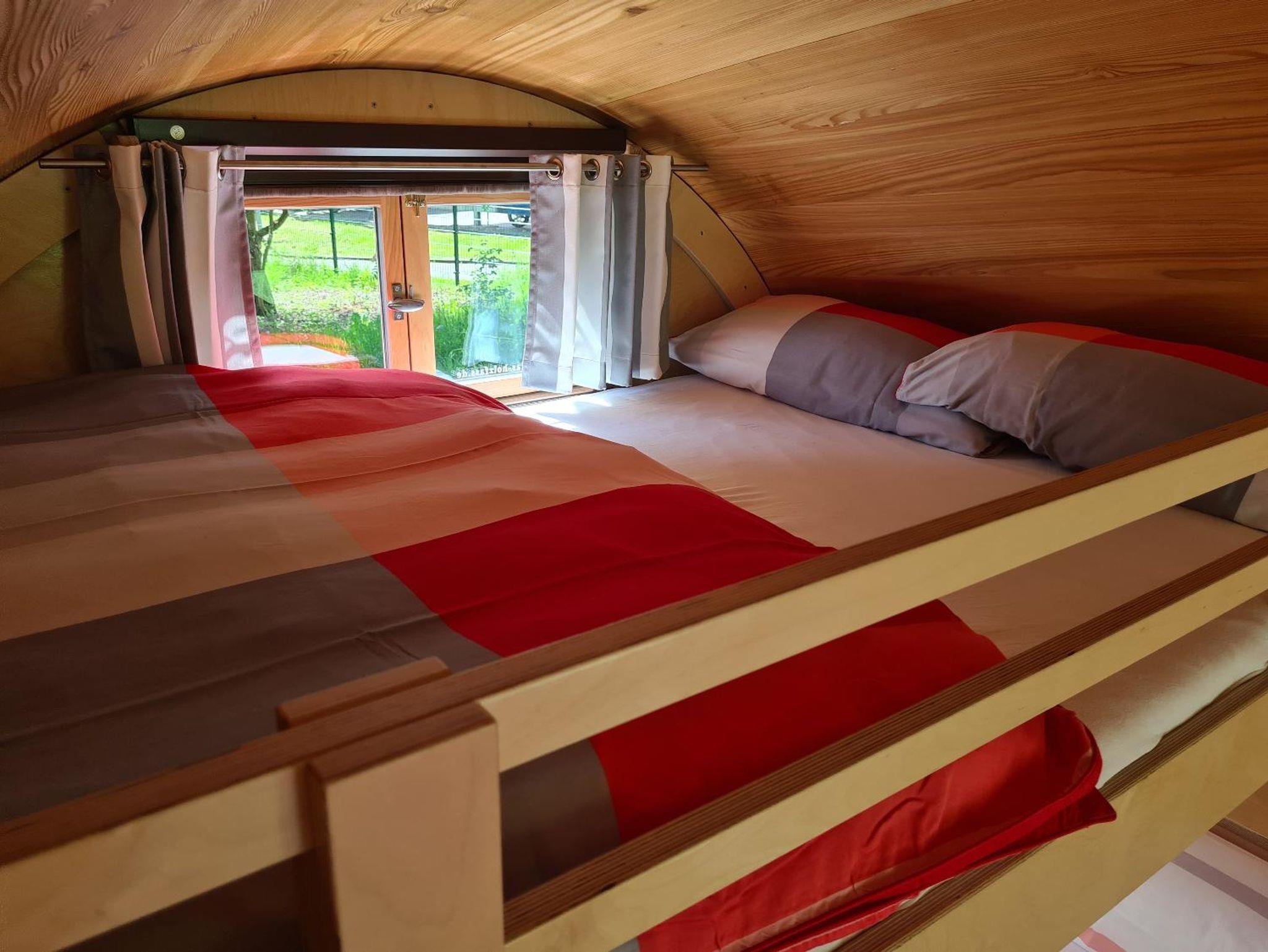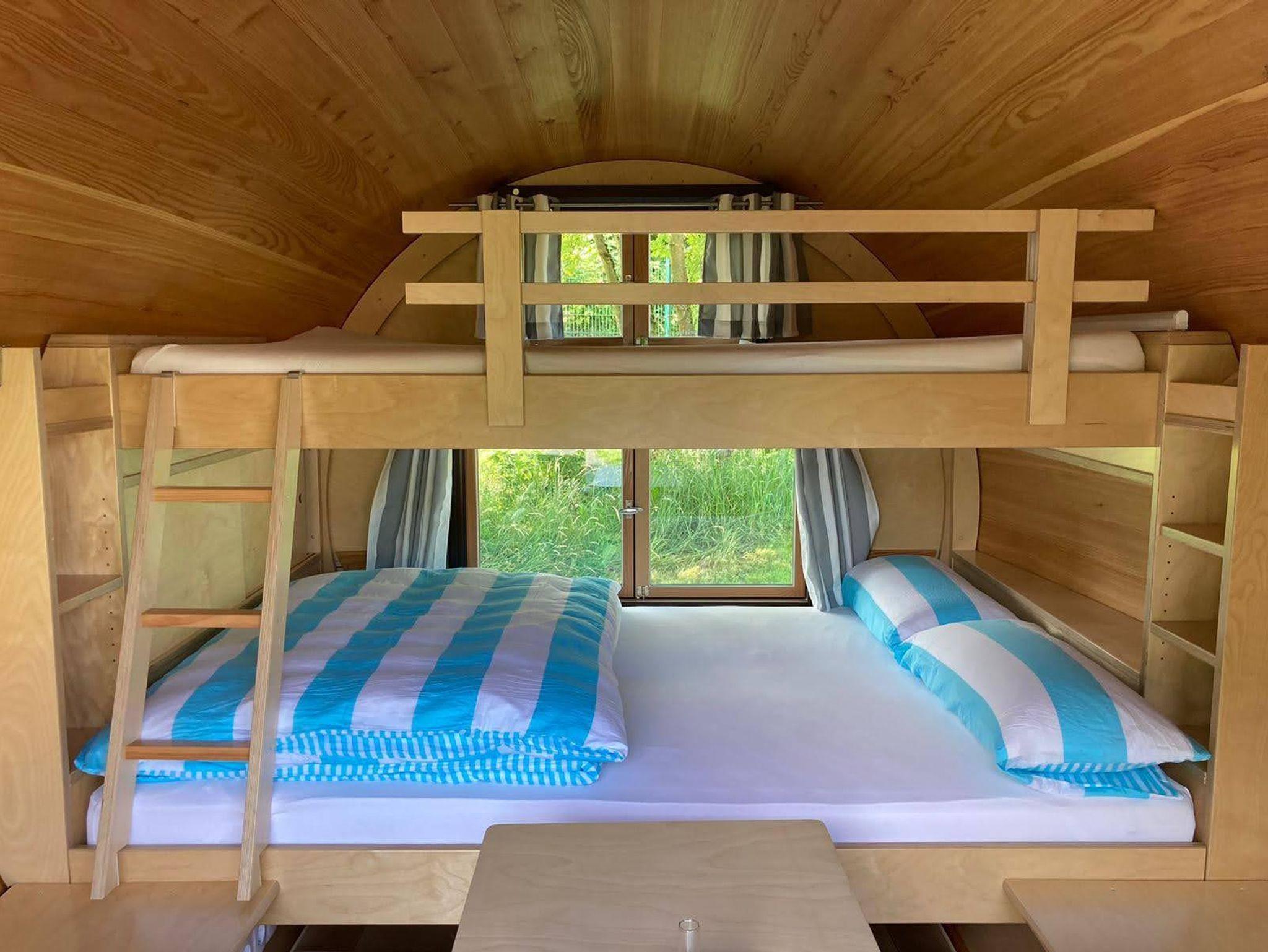 Die Schlaffässer sind mit je zwei Betten mit 1,40 x 2 m bzw. 1,20 x 2 m Liegefläche ausgestattet und bieten Platz für bis zu zwei Erwachsene und zwei Kinder.