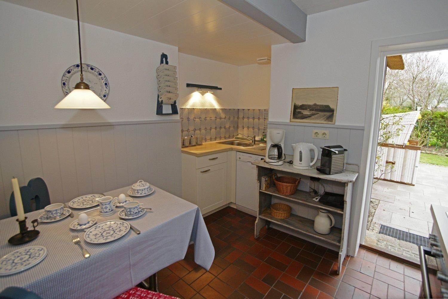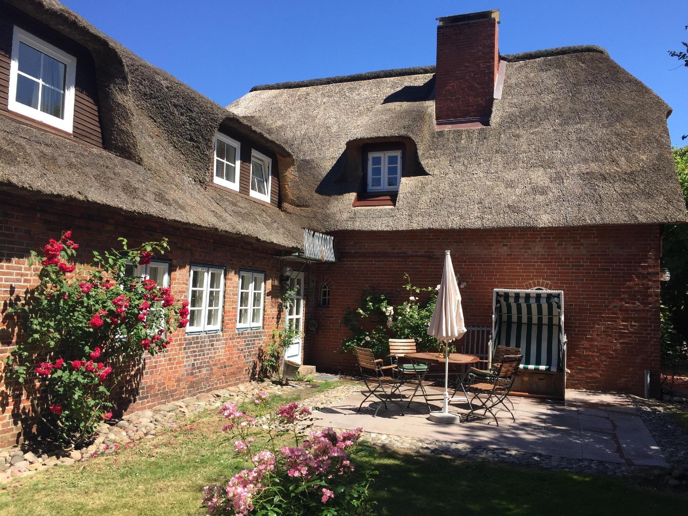 Das Ferienobjekt in Utersum bietet einen idyllischen Außenbereich, der zur vollkommenen Entspannung einlädt. Der Garten, ausgerichtet nach Süd-Westen, ist mit einer Terrasse, Gartenmöbeln, Liegen und einem Strandkorb ausgestattet. Hier können die Gäste ruhige Stunden im Freien genießen. Der direkte Zugang vom Esszimmer zum Garten ermöglicht unkomplizierte Mahlzeiten im Freien oder entspannte Nachmittage in der Sonne.