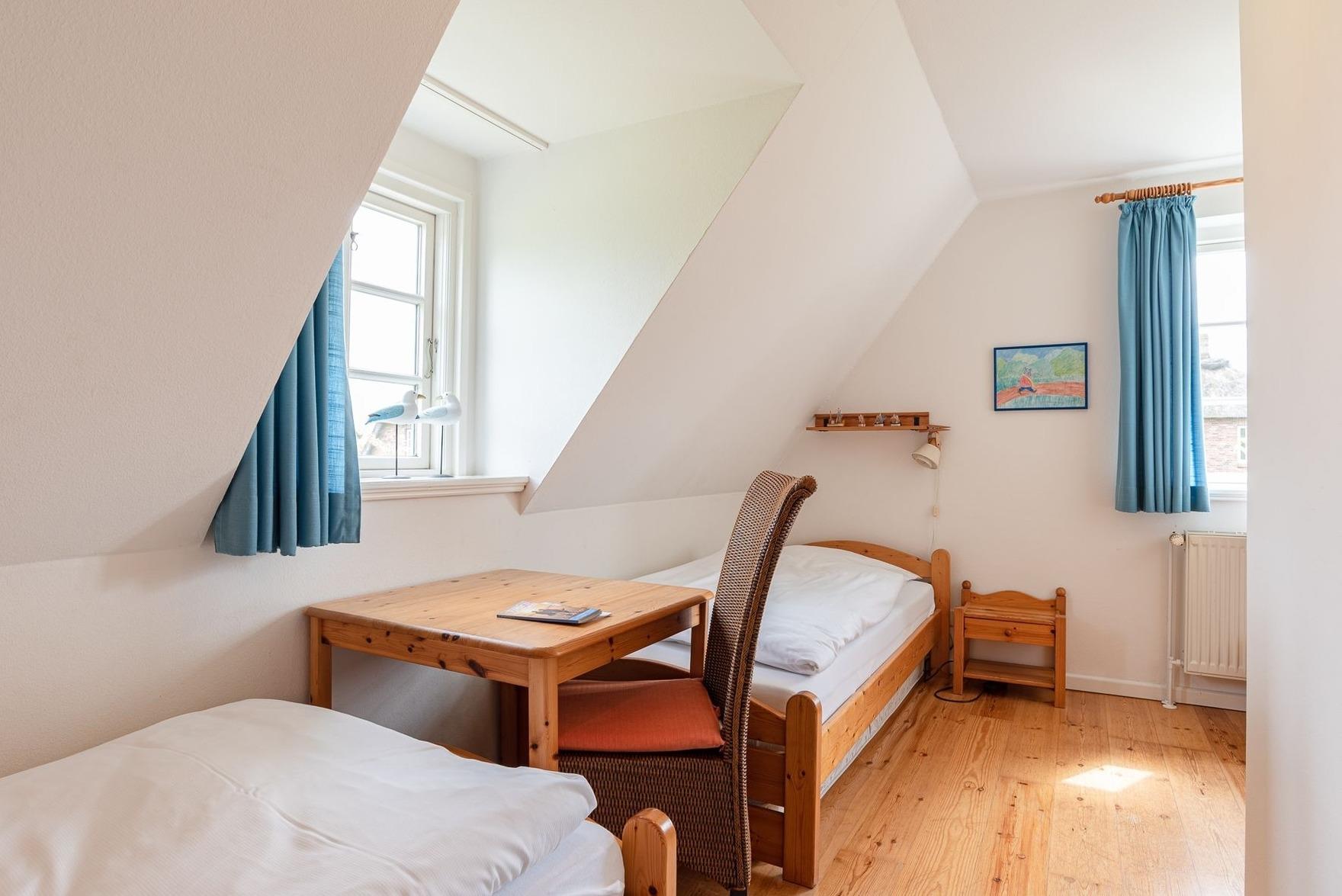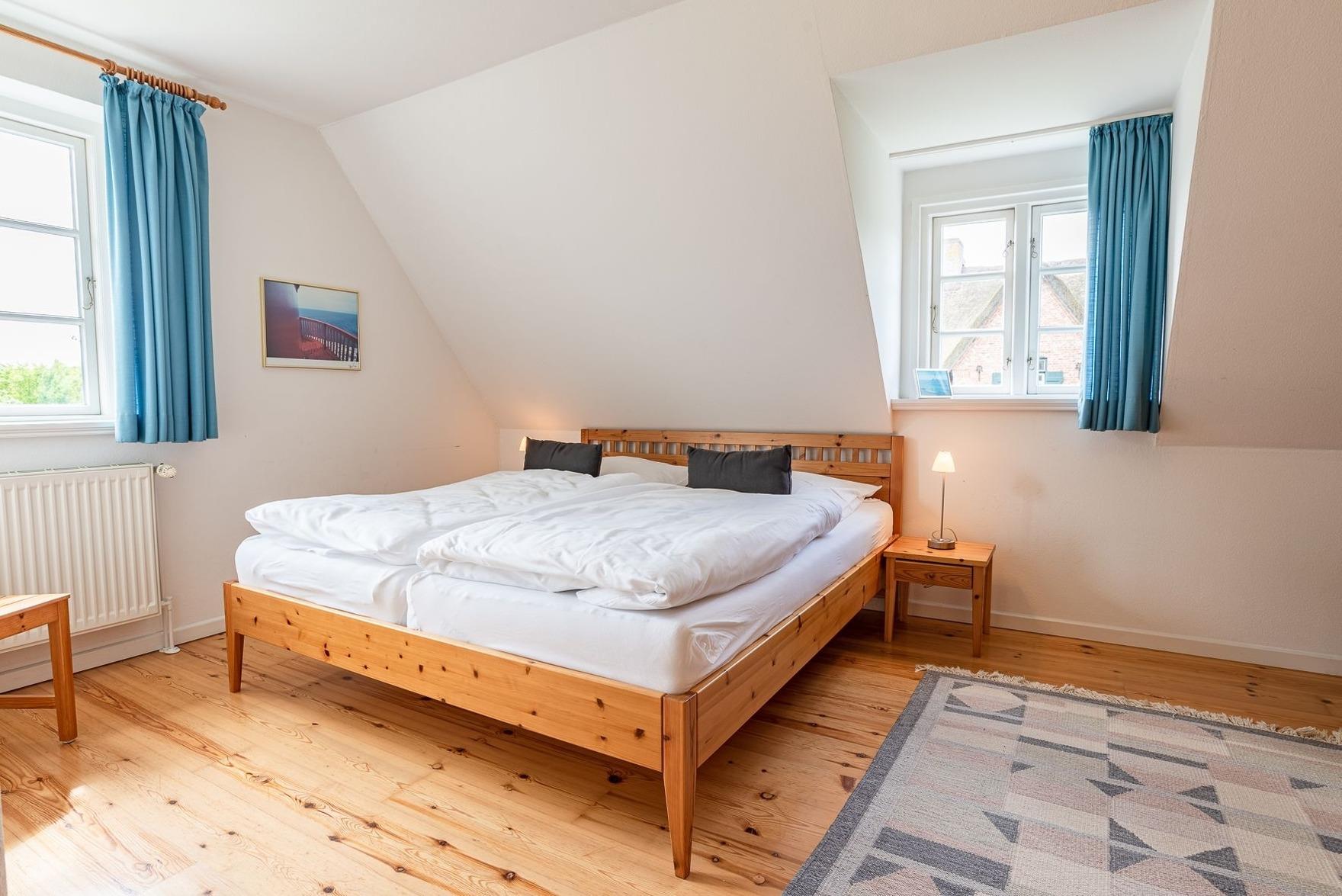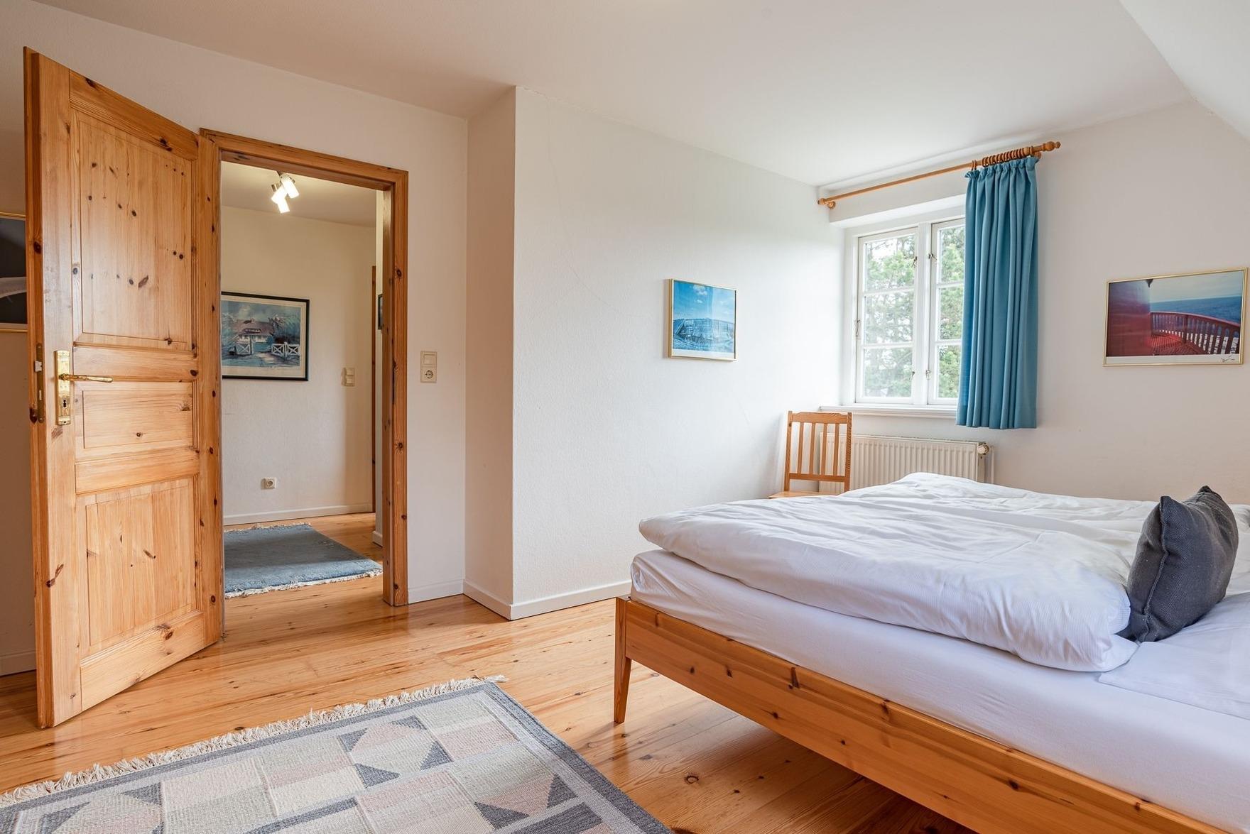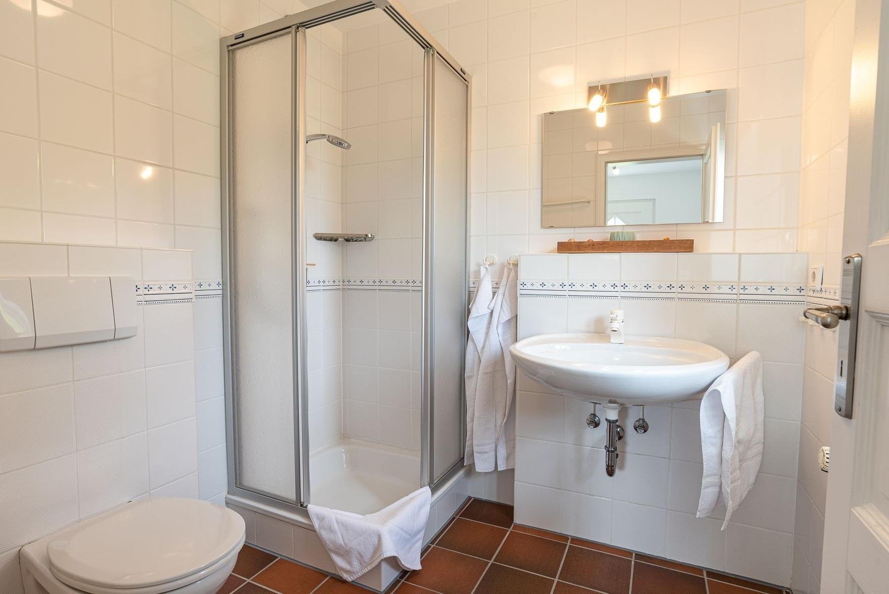 Durch die Seitentür gelangen Sie in den Vorflur in dem sich die Garderobe befindet und von dem man ins erste Duschbad gelangt. Weiter gelangt man in den großzügigen Wohn- und Essbereich, in dem sich auch der Zugang zur Terrasse und der Kaminofen befinden. Über die Treppe gelangen Sie in das 1. Obergeschoss mit zwei Schlafzimmern und dem zweiten Duschbad. Ein Schlafzimmer davon ist mit zwei Einzelbetten (hintereinander) und eins mit einem Doppelbett ausgestattet.