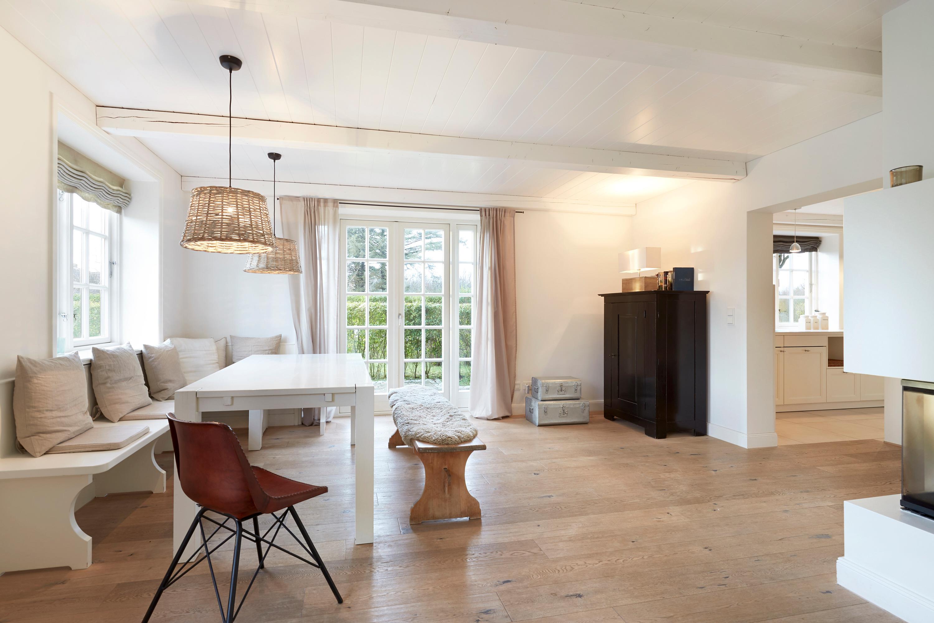Diese Reetdach-Doppelhaushälfte zeichnet sich durch viel Liebe zum Detail und ihre Großzügigkeit aus. Das Grundstück umfaßt 600 qm. Es wurde viel Wert auf friesische Bauelemente gelegt wie das rote Mauerwerk, die Holzsprossenfenster und den typischen Friesenwall. Im Inneren erwartet Sie eine hochwertige Ausstattung im Long Island-Look mit Holzdeckenbalken und Eichenböden. Ein offener Kamin und ein großer Saunabereich mit Wellness-Ruhezone ist ebenso vorhanden wie eine große Terrasse und ein Garten. Mit nur wenigen Schritten gelangen Sie zum Strand von Utersum und genießen hier die Nordsee von ihrer schönsten Seite - wunderbare Sonnenuntergänge inklusive! Seien Sie unser Gast - wir freuen uns auf Sie! Mehr unter www.strandhaus-foehr.de