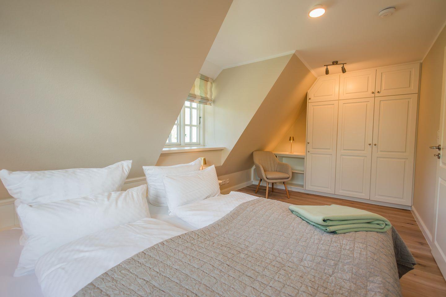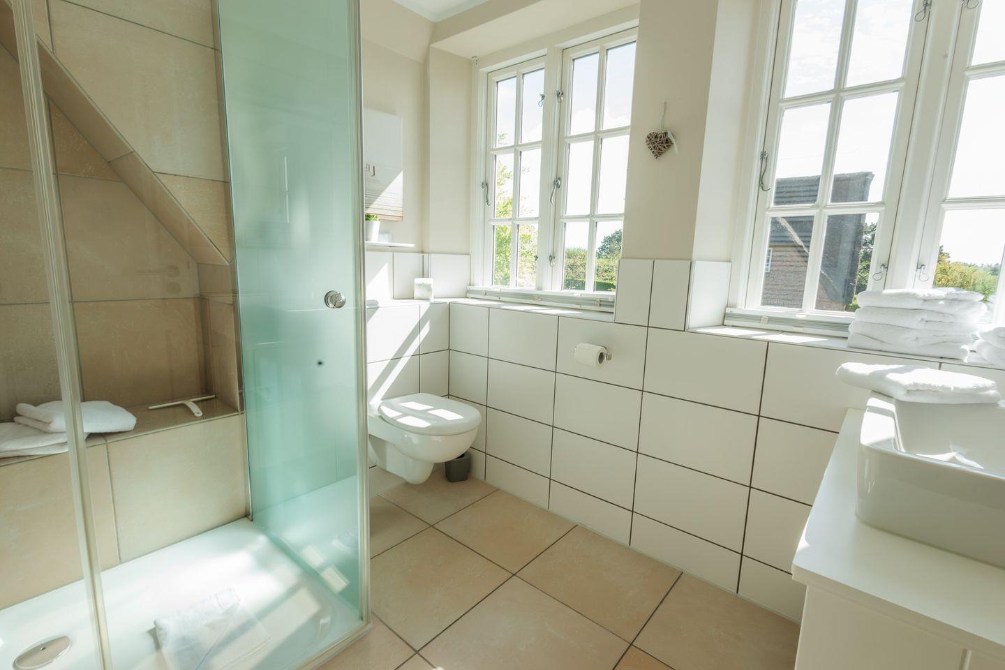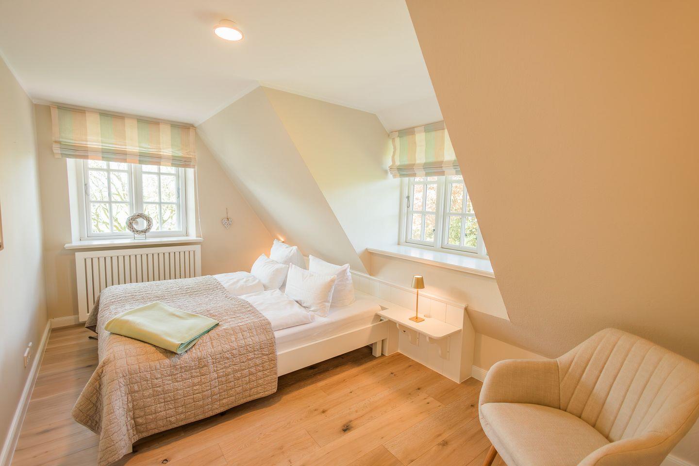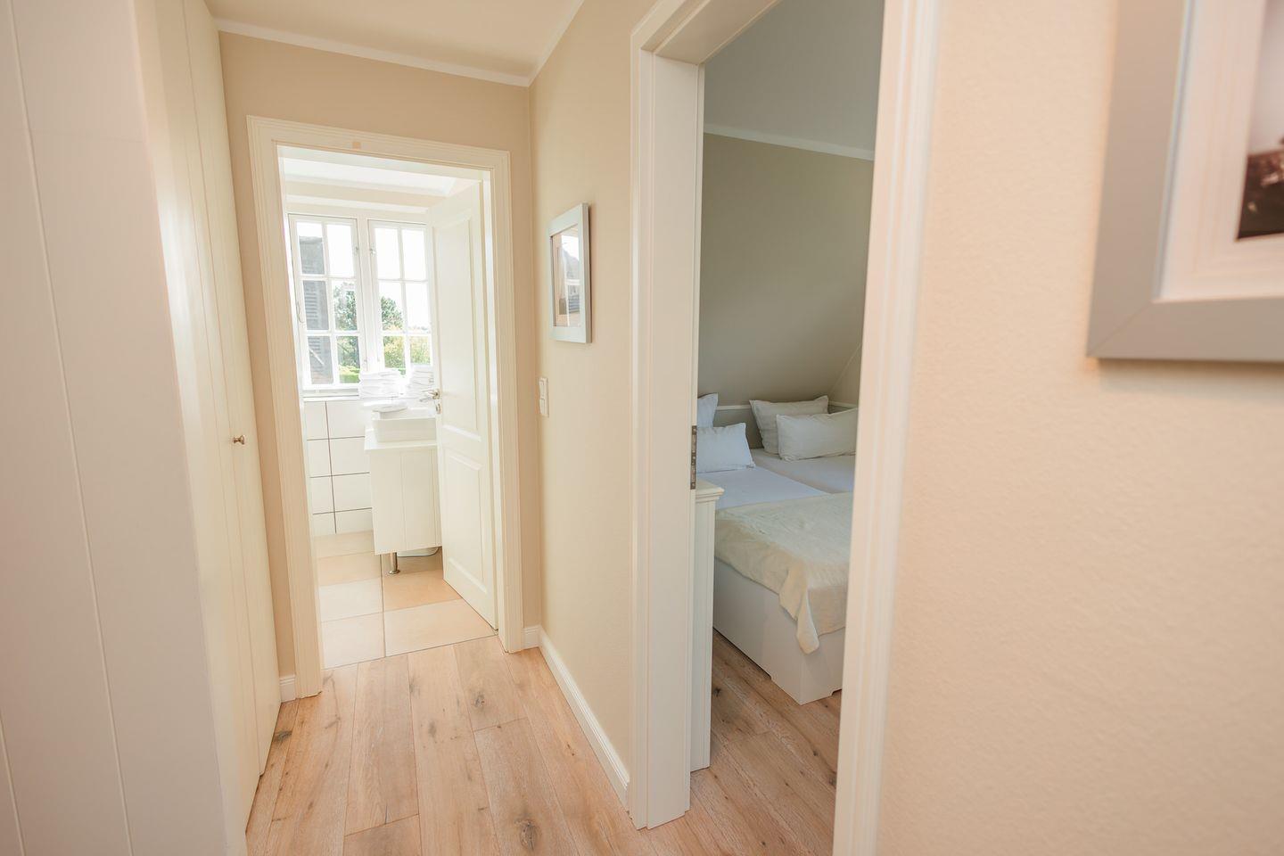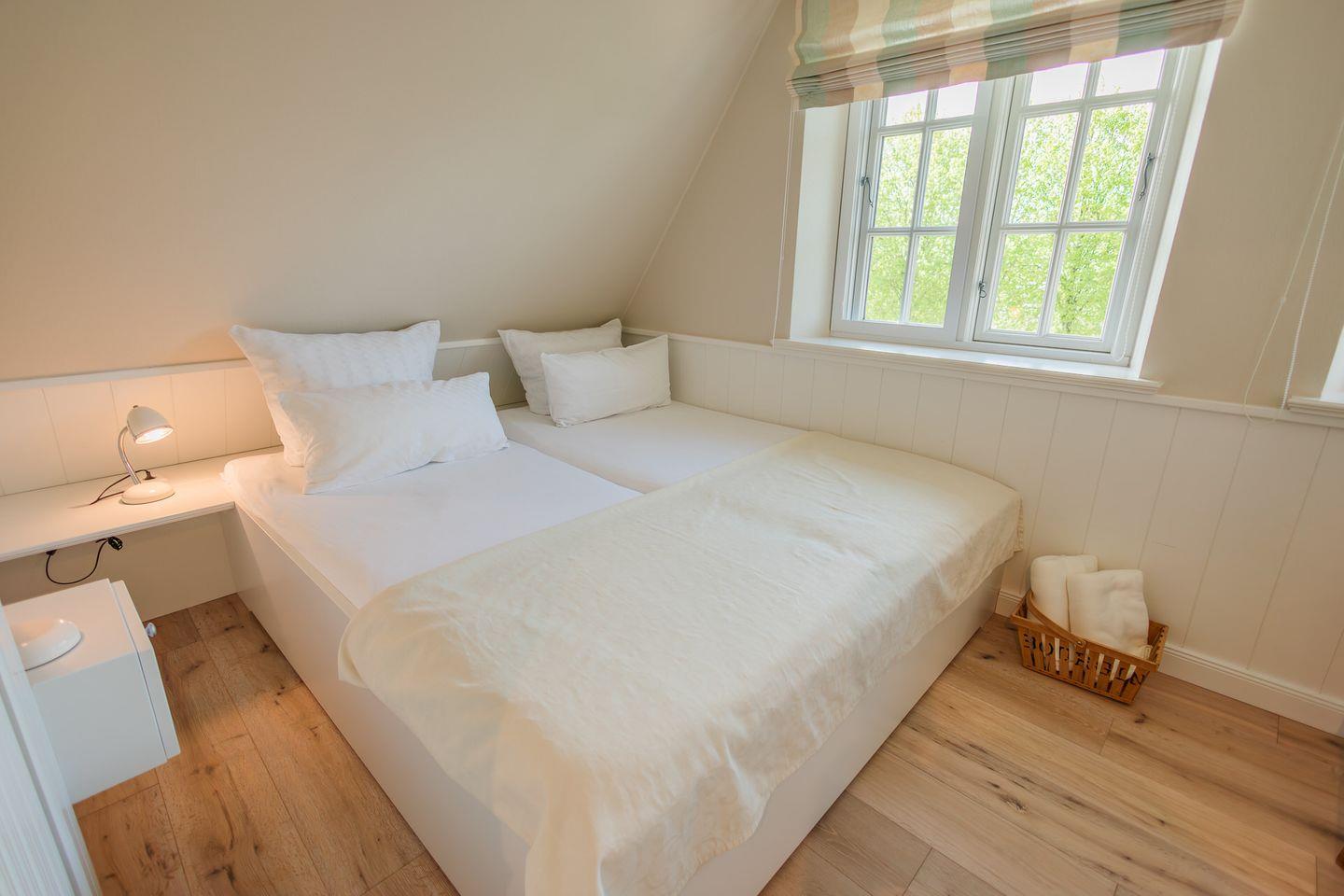 Im Obergeschoss sind die beiden Schlafzimmer mit jeweils einem Doppelbett ausgestattet - und das Duschbad mit Fußbodenheizung sowie, in einem Separee abgetrennt, Waschmaschine und Trockner gelegen. Die Doppelbettzimmer verfügen über eigenen Smart-TV.