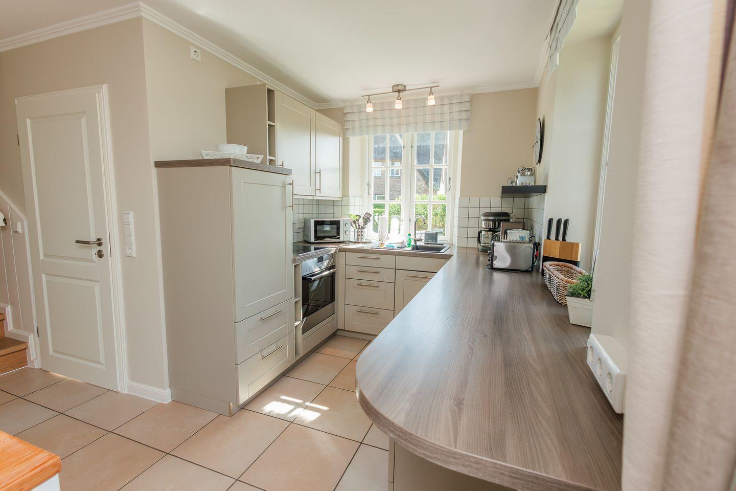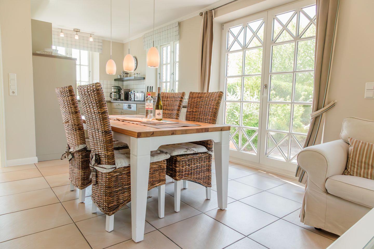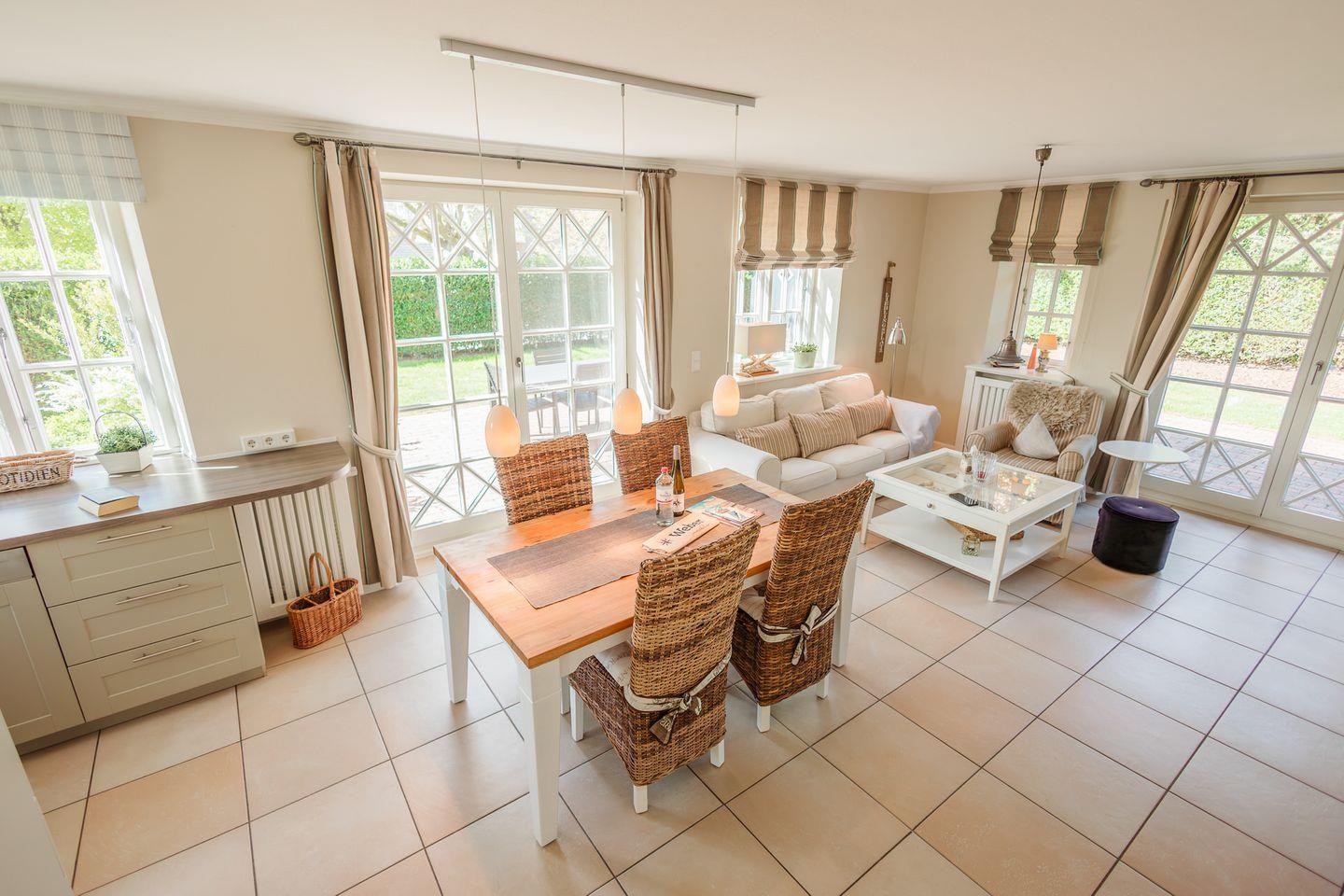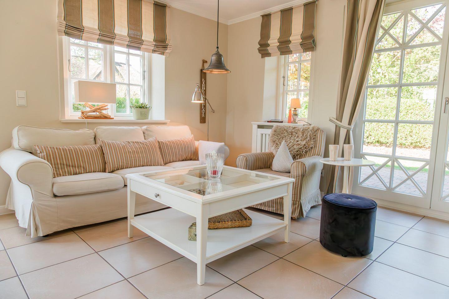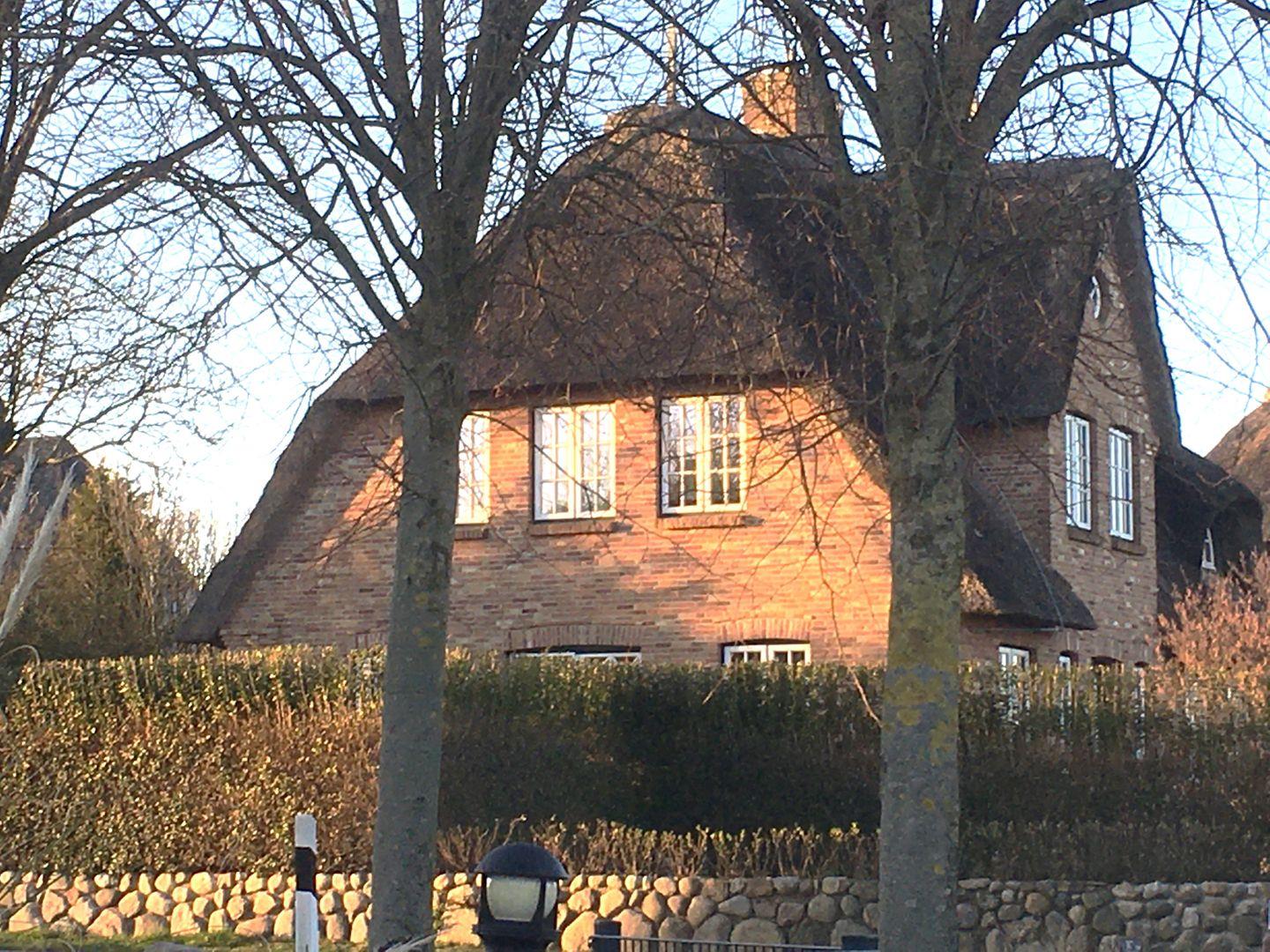 Strandnahe Reetdachhaushälfte mit zwei separaten Terrassen in Süd- (Tag) und West-Ausrichtung (Abendstunden).