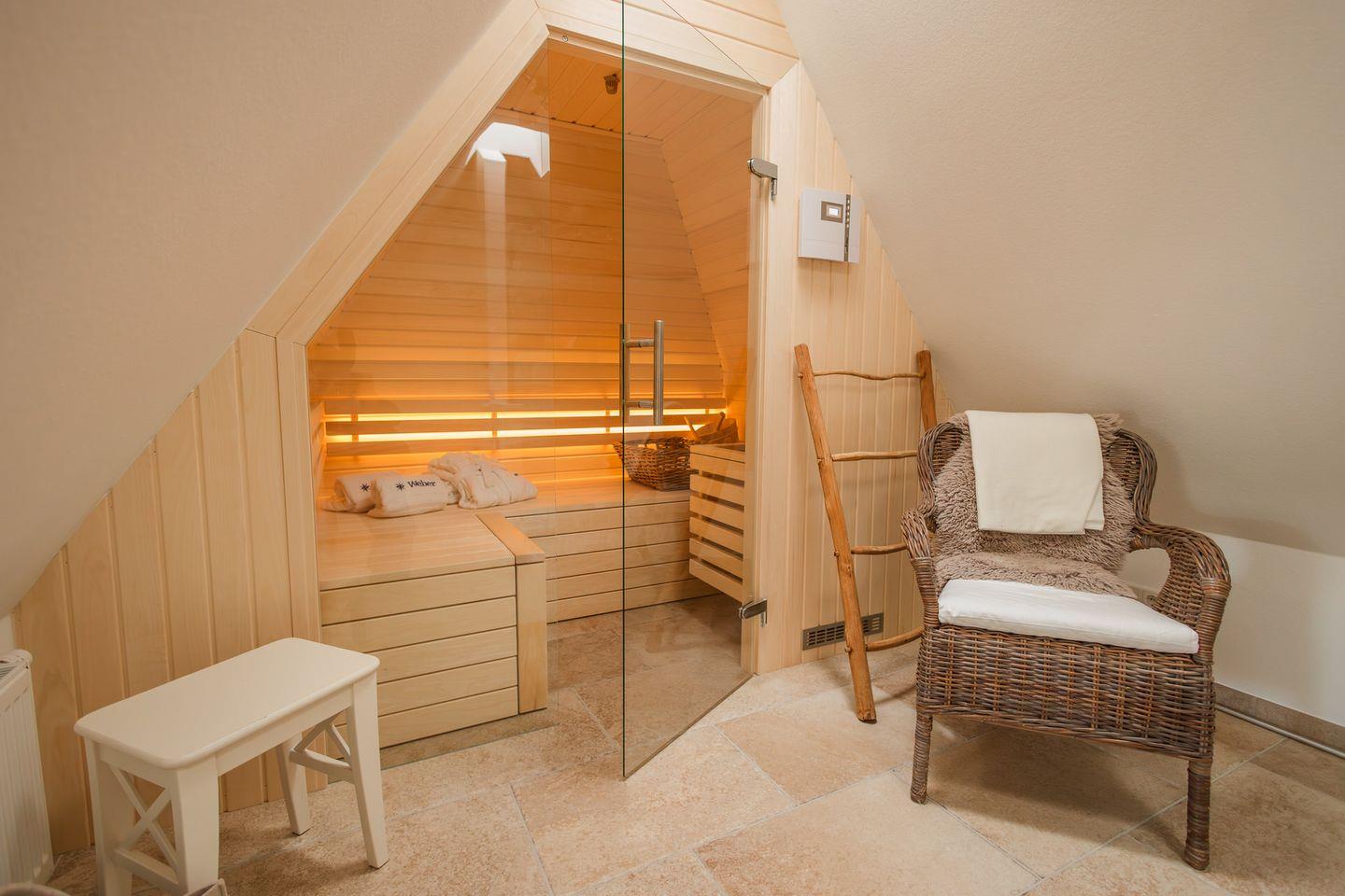 Zu den Highlights der Ferienunterkunft zählen wir u. a. den im Spitzboden verbauten Saunabereich wie Dusche, den Kaminofen, die beiden eigenen Terrassen und die ruhige, strandnahe Lage.