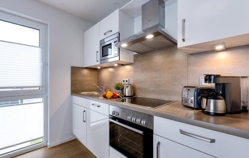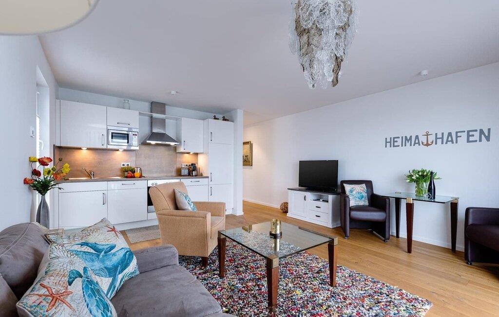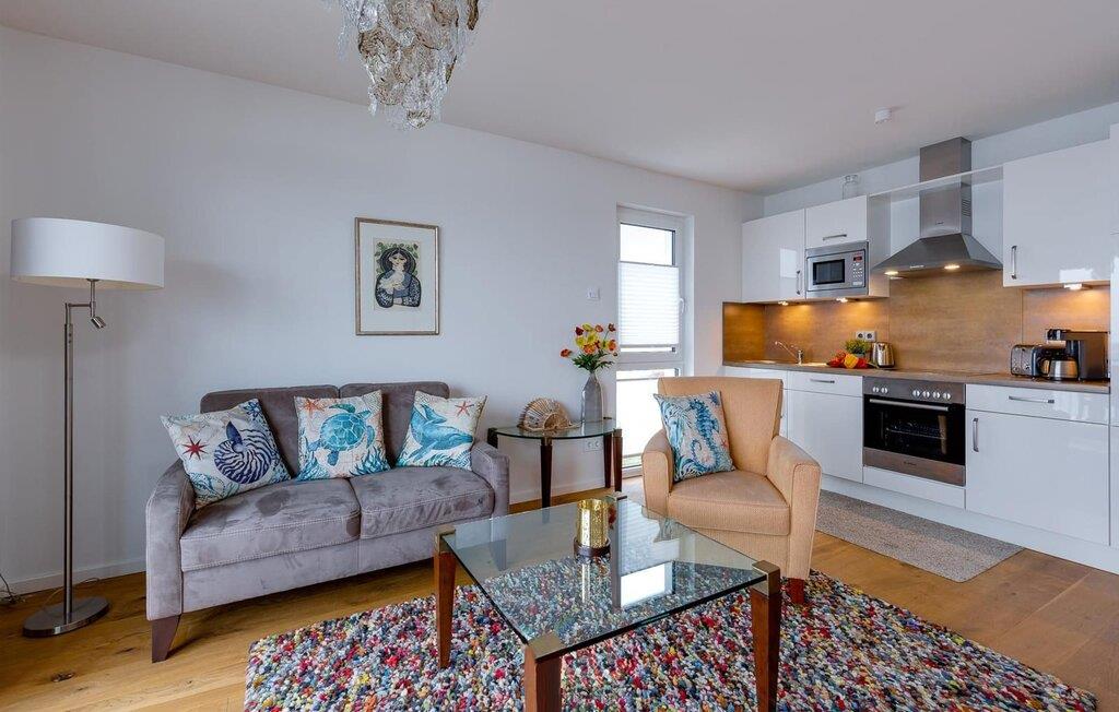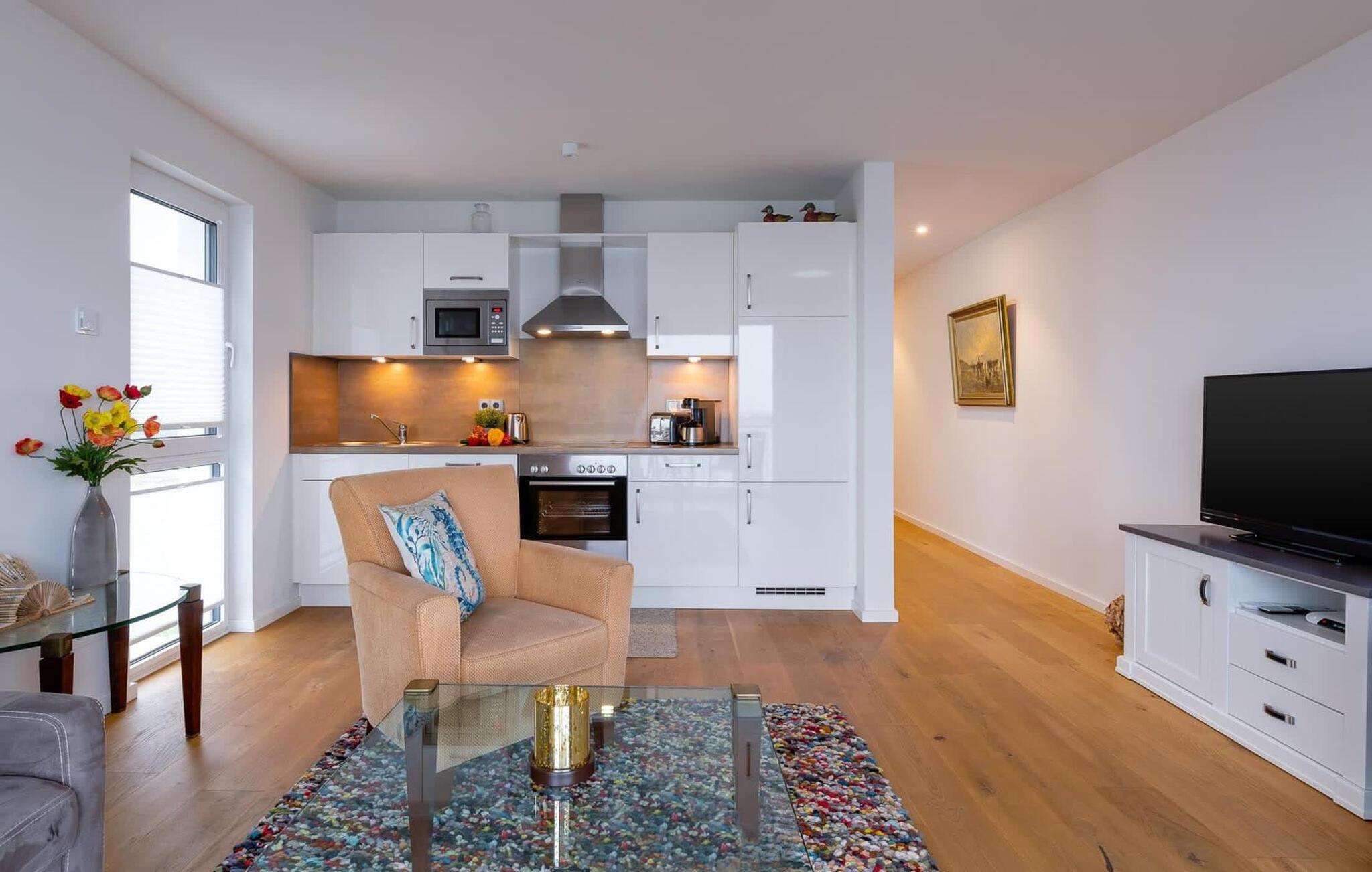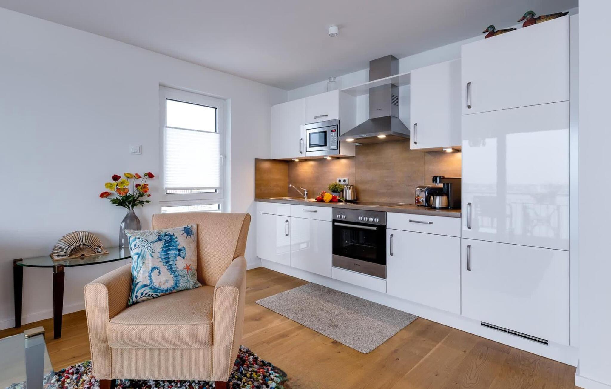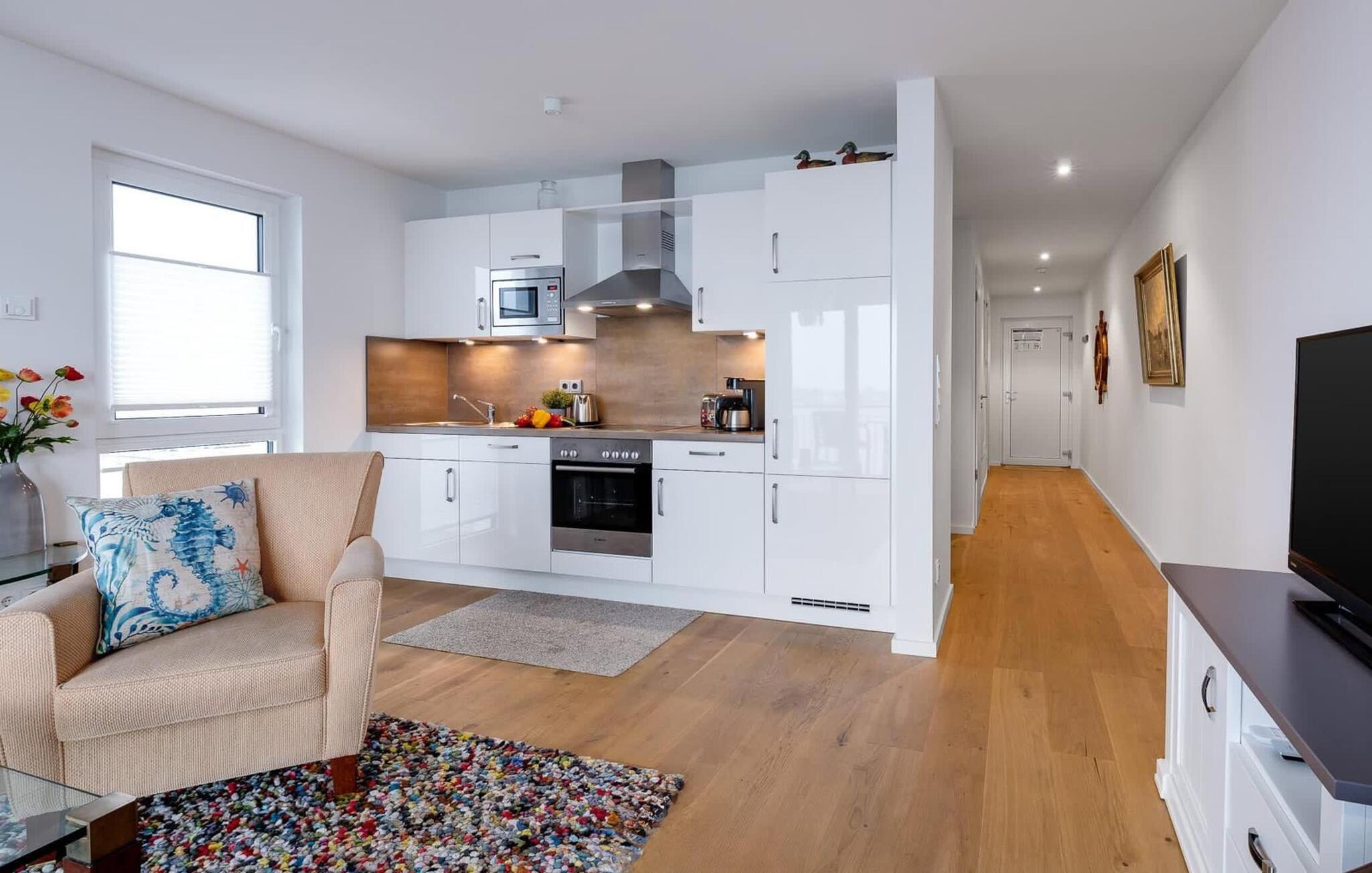 Placeret over tingene kan sejlskibe, der passerer ved indsejlingen til Østersøen, observeres fra hele opholds-/spiseområdet og balkonen. Udsigten falder på Schimmelünde fyrtårn og idyllen i landskabsbeskyttelsesområdet omkring det. Havnepromenaden i OstseeResort Olpenitz med sit voksende udbud ligger lige under ferielejligheden og er ideel til slentreture. Telekom-hjemmeunderholdningsprogrammet på fladskærms-tv'et i stuen tilbyder ekstra underholdning. Det omfattende udstyret åbne køkken lader intet tilbage at ønske. Her kan man fremtrylle lækre feriemåltider.