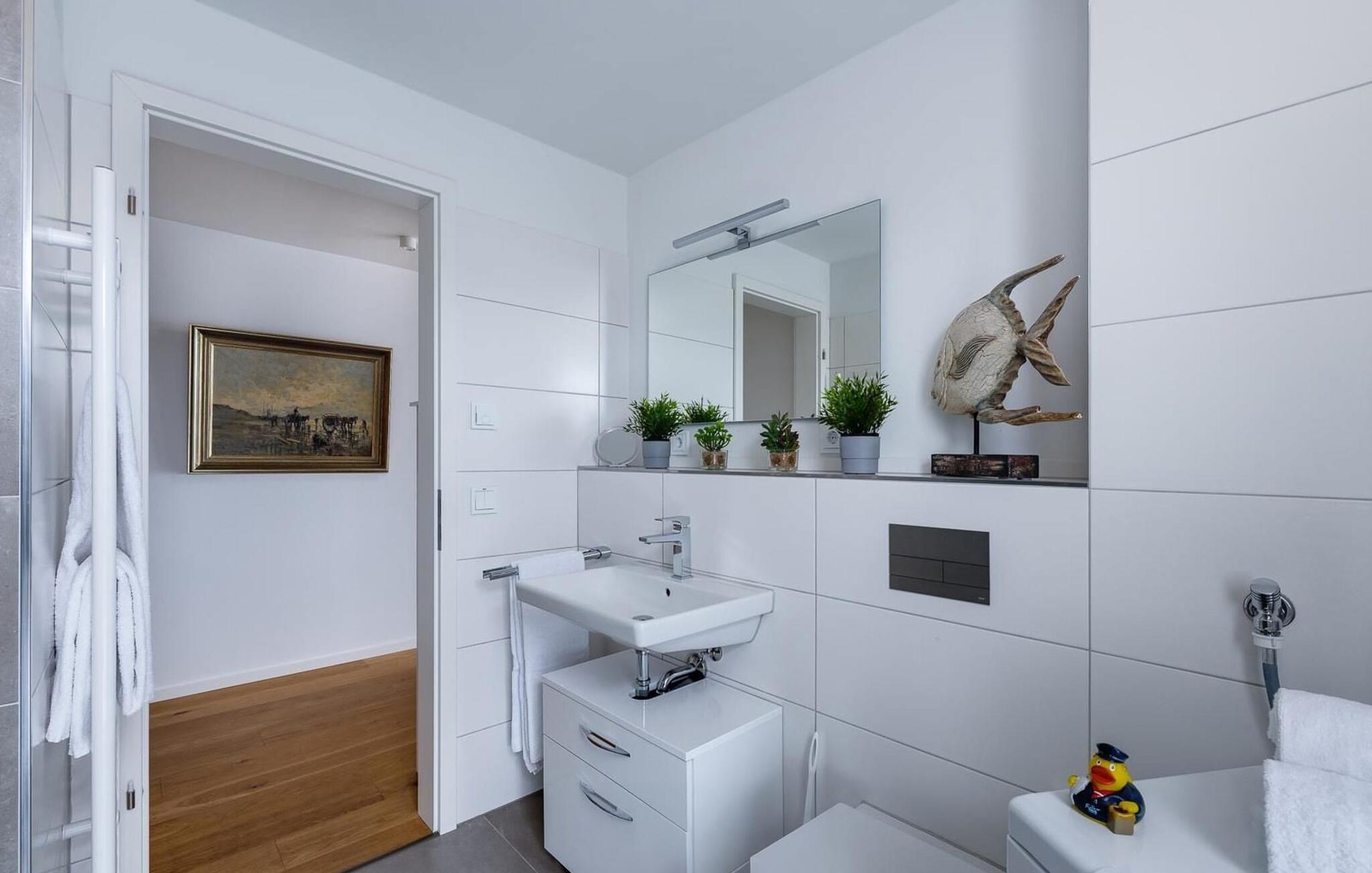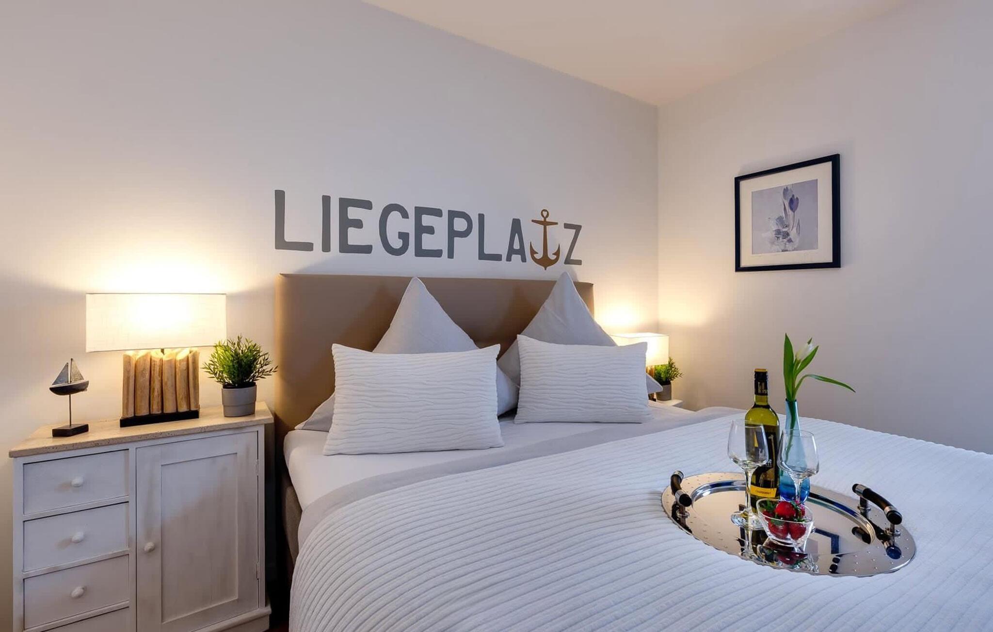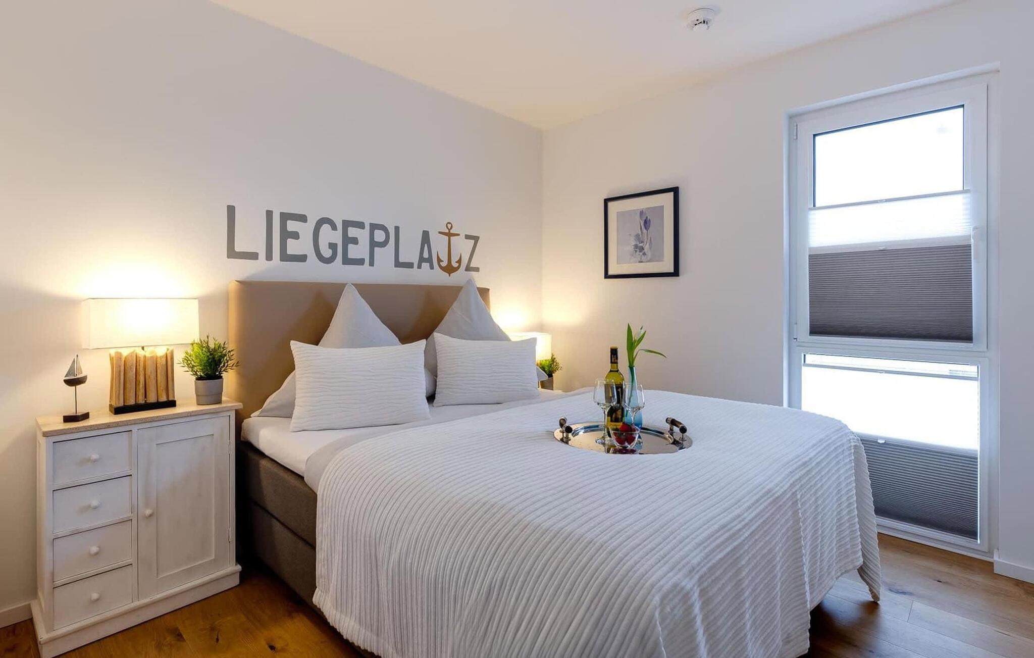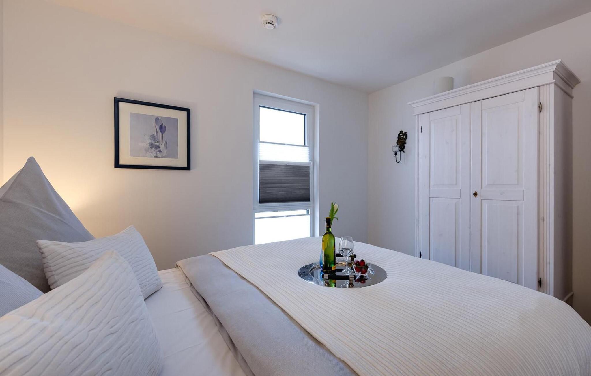 Bruserummet har et stort brusebad på gulvniveau. Lejlighedens hjørneplacering tilbyder også dette værelse bekvemmeligheden af et udvendigt vindue med udsigt over promenaden. Det hyggelige soveværelse, udstyret med en høj boxspring dobbeltseng, byder på en afslappende feriesøvn. Tidlig stående kan se fantastiske solopgange gennem vinduet.