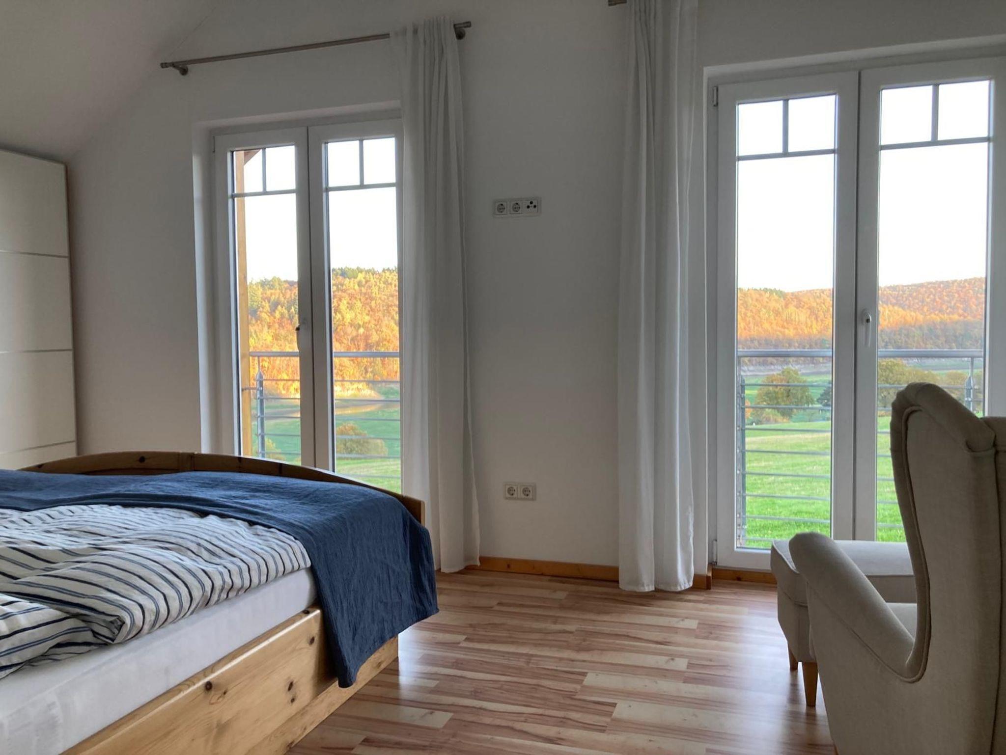 Schlafzimmer 1: Doppelbett 2x1,80m mit Seeblick, großer Wandschrank, gemütlicher Ohrensessel