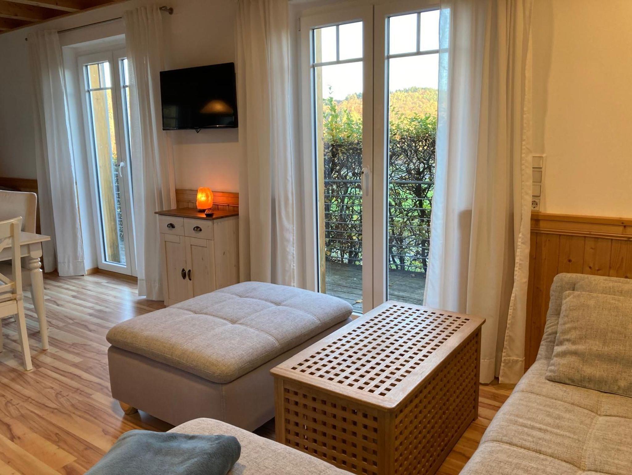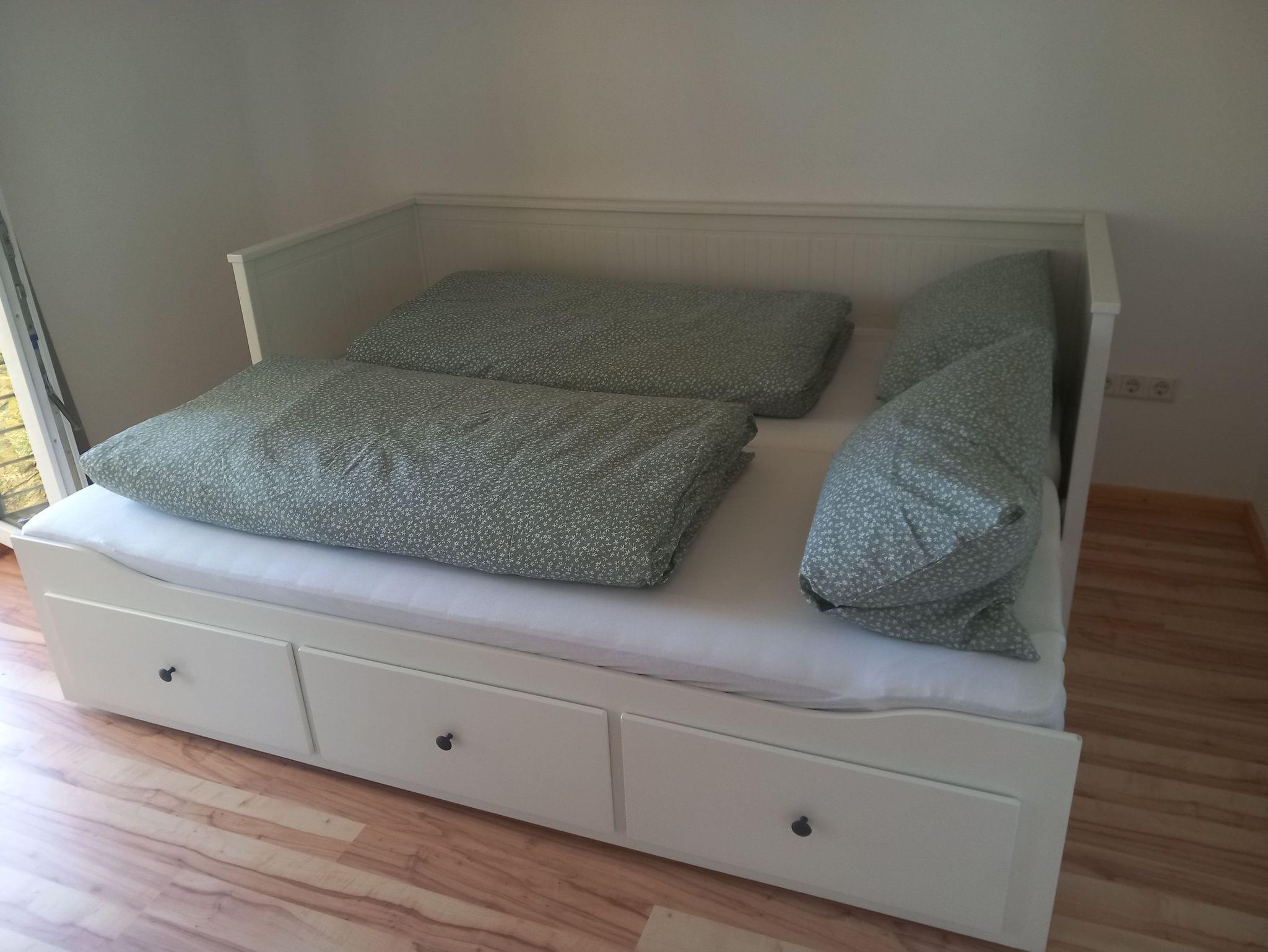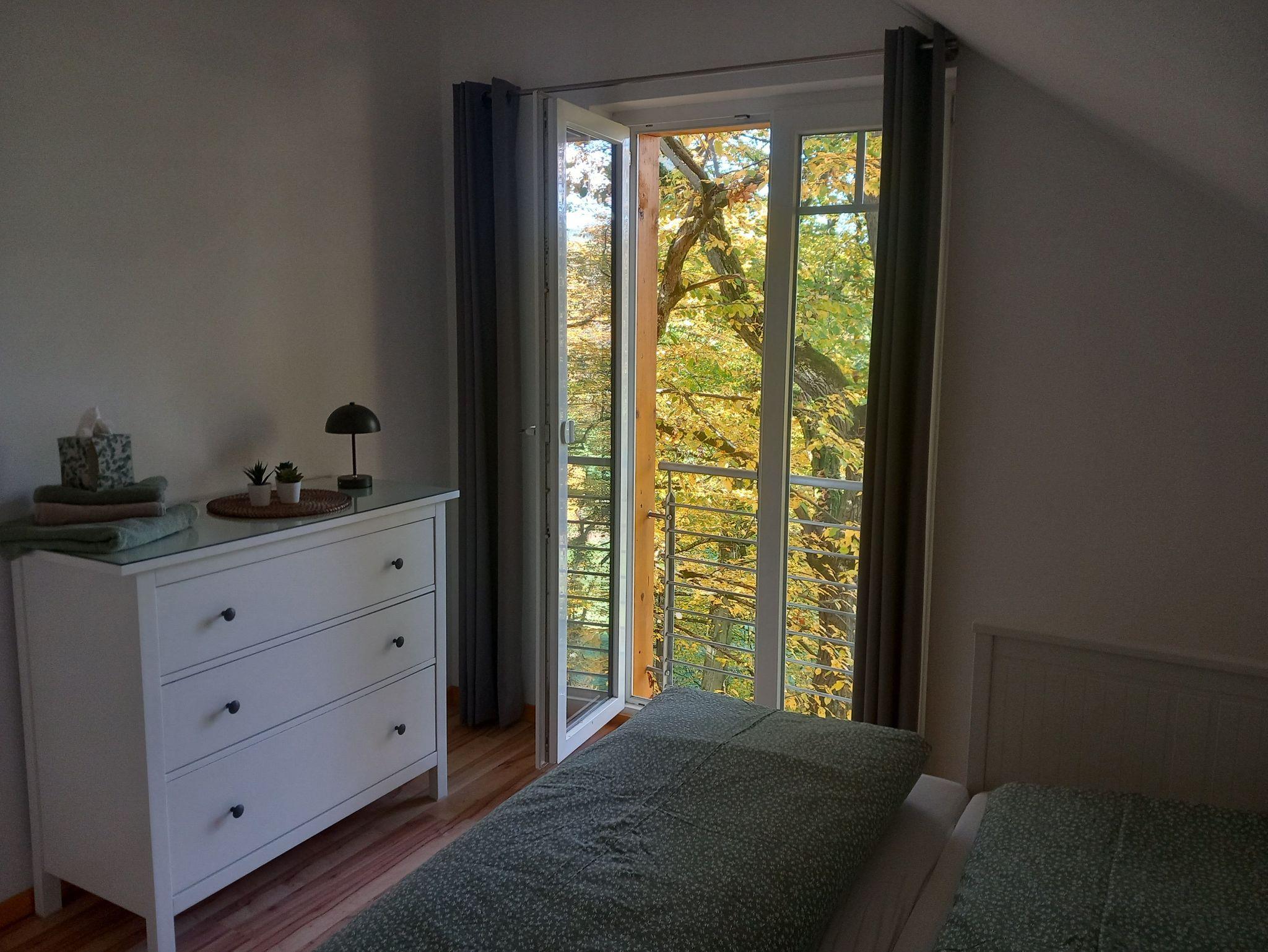 Schlafzimmer 2: Ausziehbett 2x1,40m mit Waldblick, Kommode