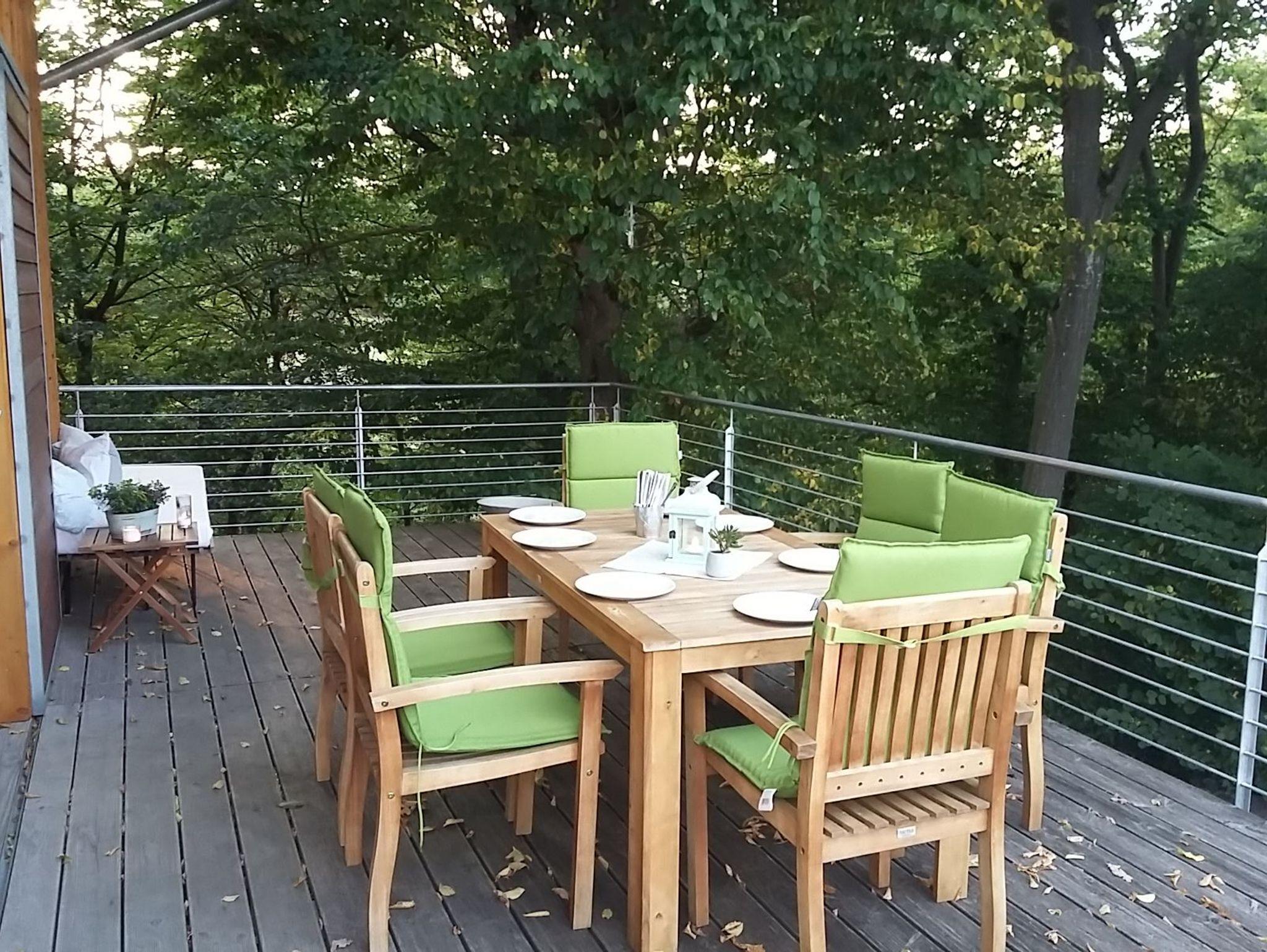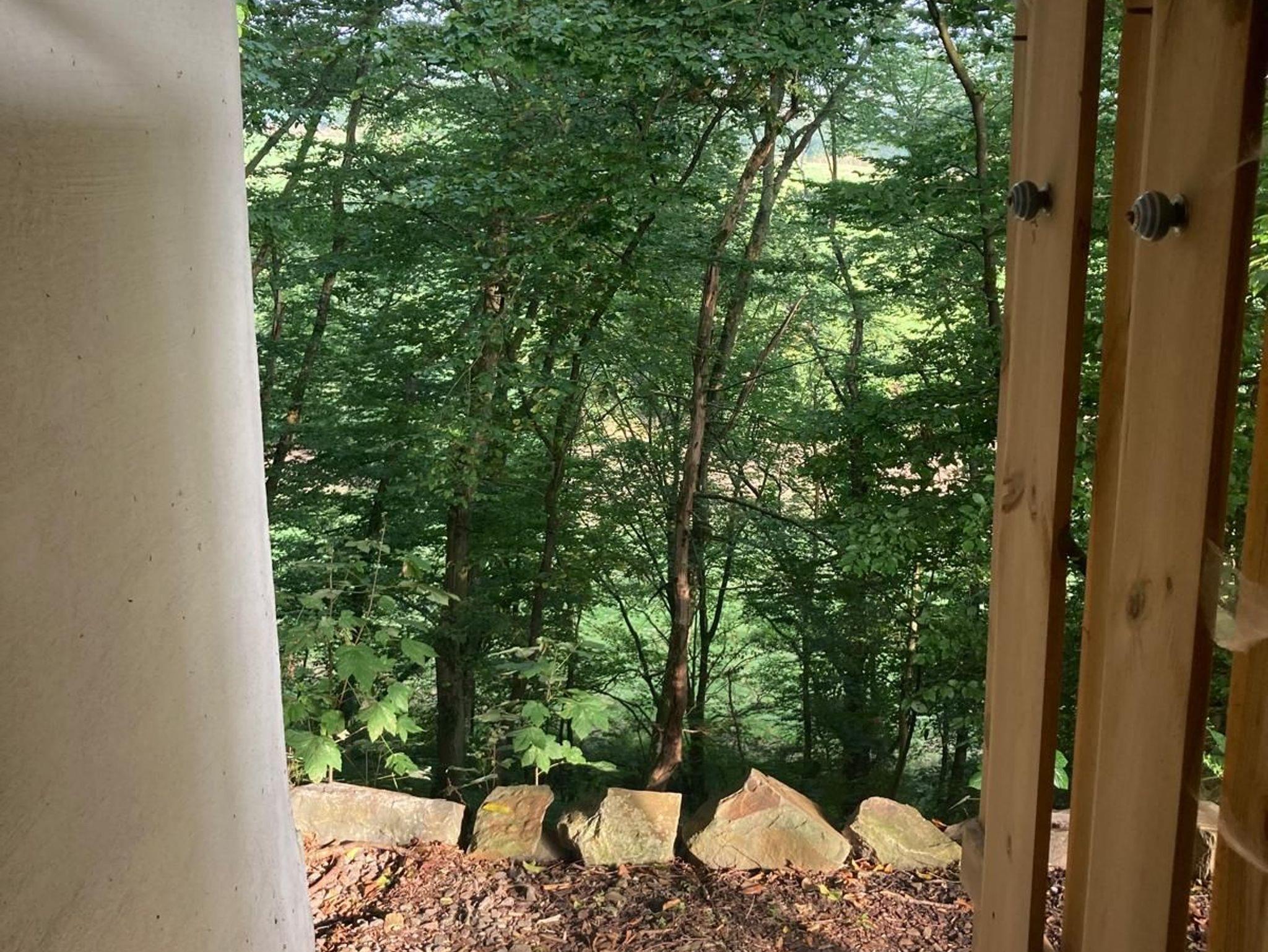 Die Waldaußendusche ist über die Terrassentreppe erreichbar.