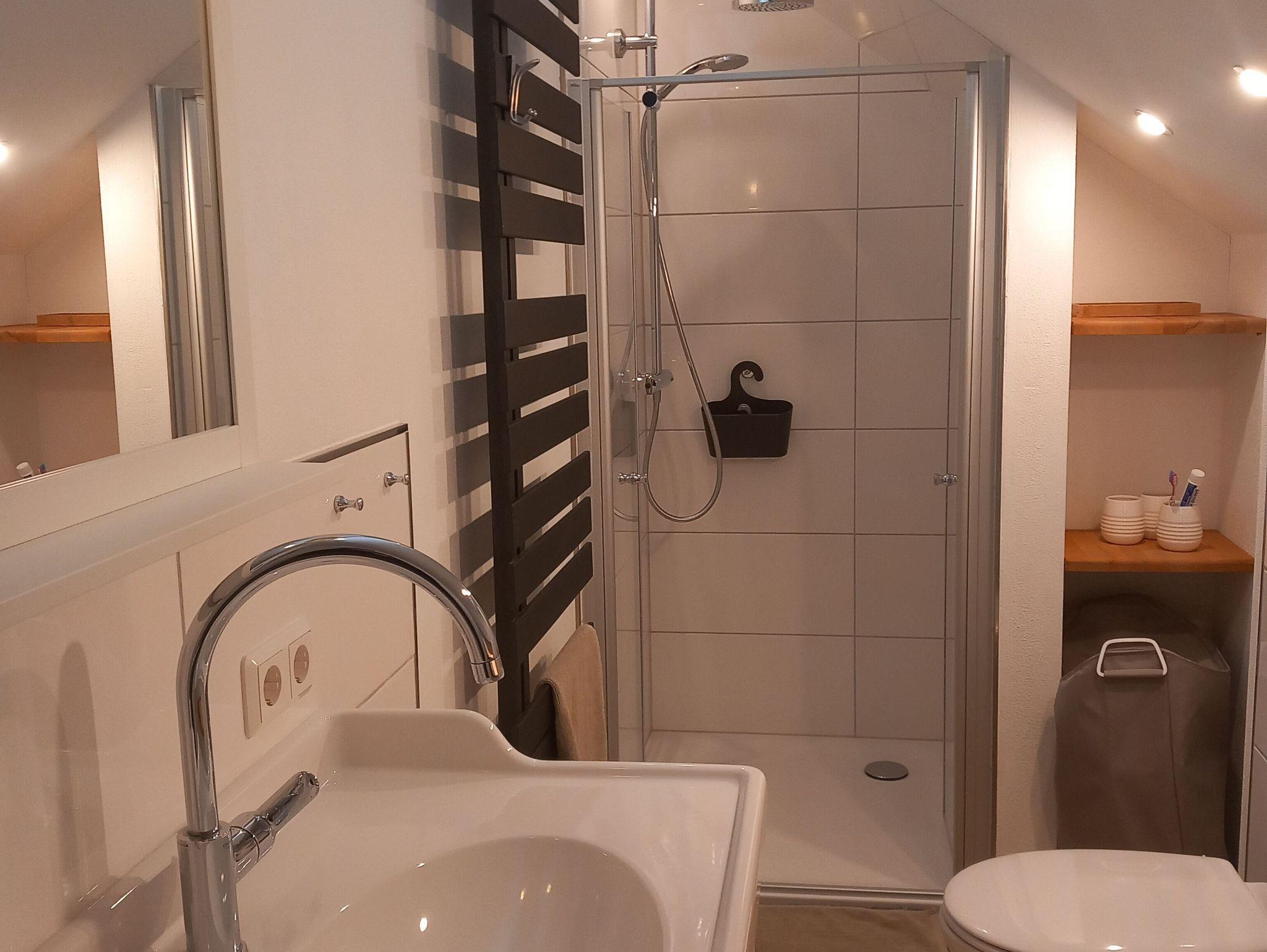 Bad: Waschtisch, WC, Dusche, Fön, Kosmetikspiegel