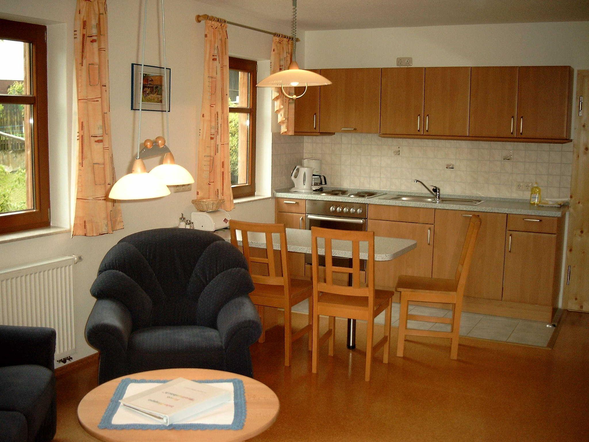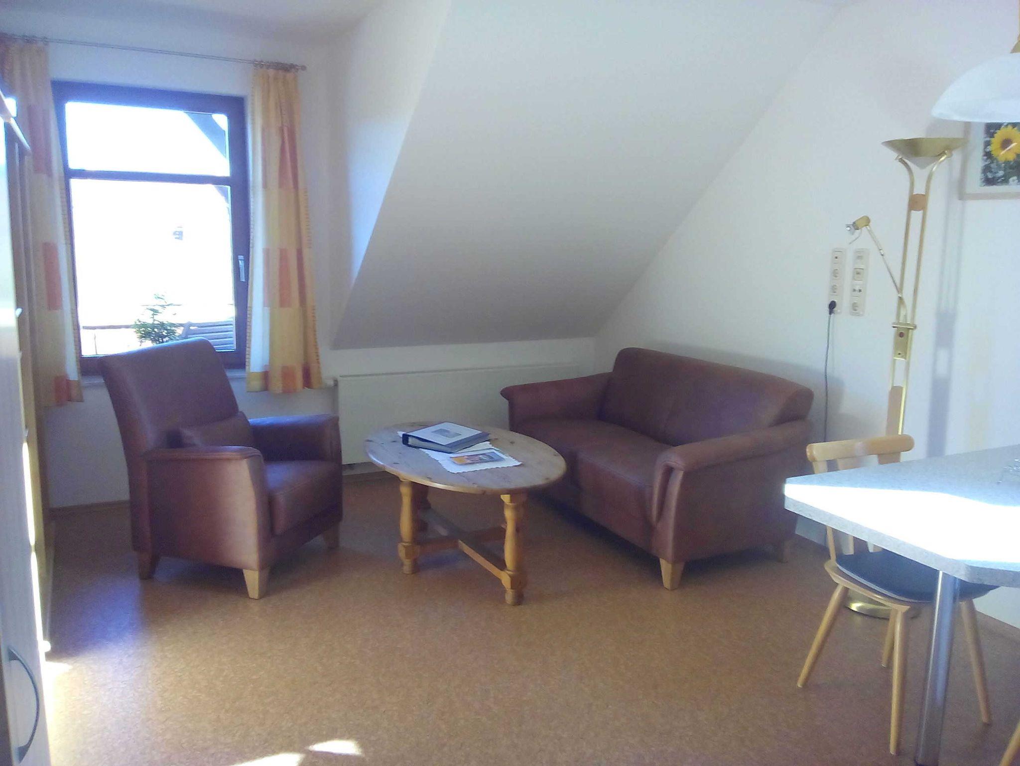 Gemütliche Ferienwohnung im II. OG mit Wohnküche, 1 Schlafraum, DU/WC mit ebenerdiger Dusche und überdachtem Balkon, Größe ca. 45 m², geeignet für bis zu 3 Personen.