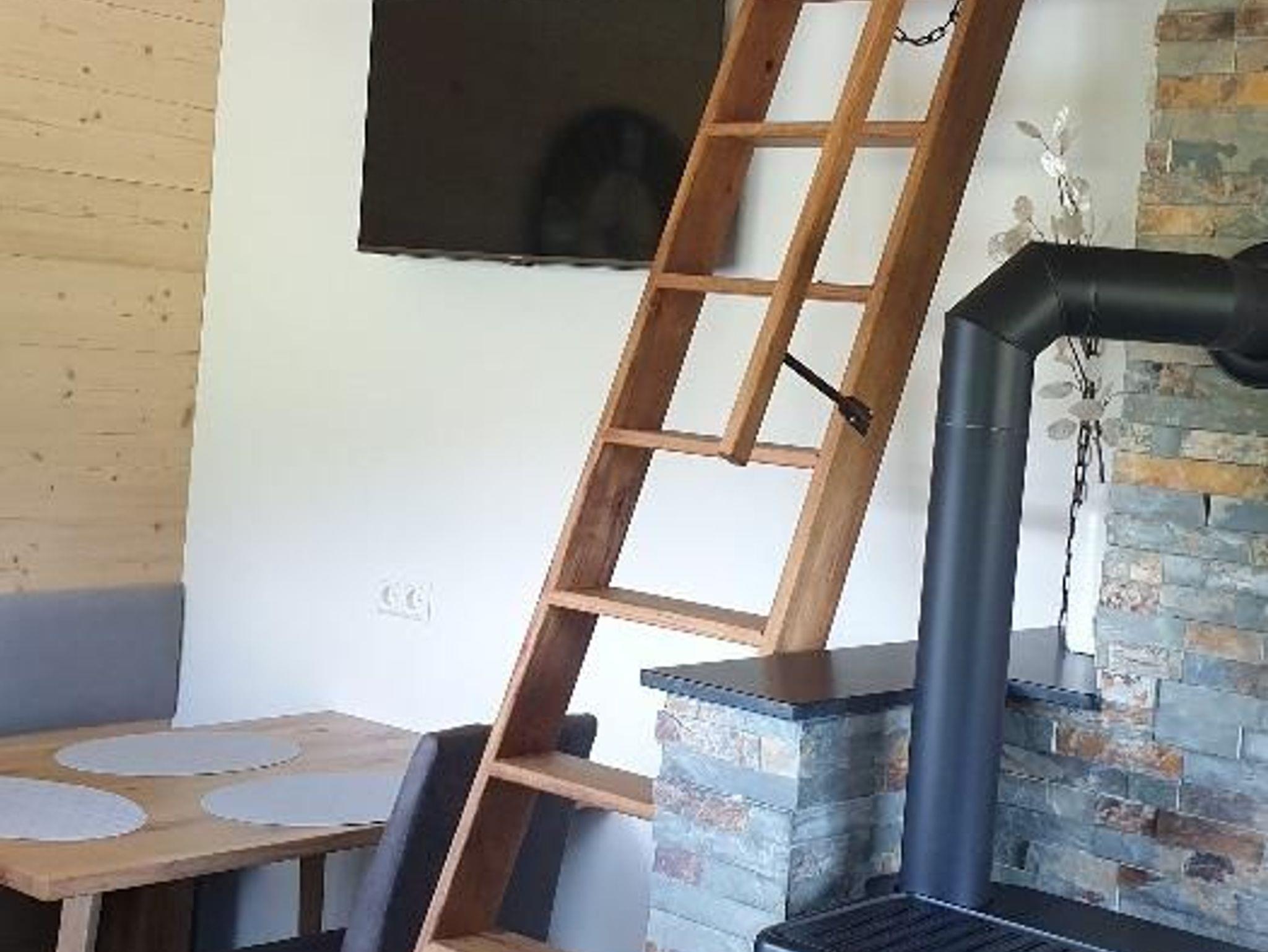 Das gemütliche Ferienhaus ist im Wohnbereich mit einem Pelettofen, Esstisch mit Bank und Stühlen sowie einem Sofa und TV ausgestattet.