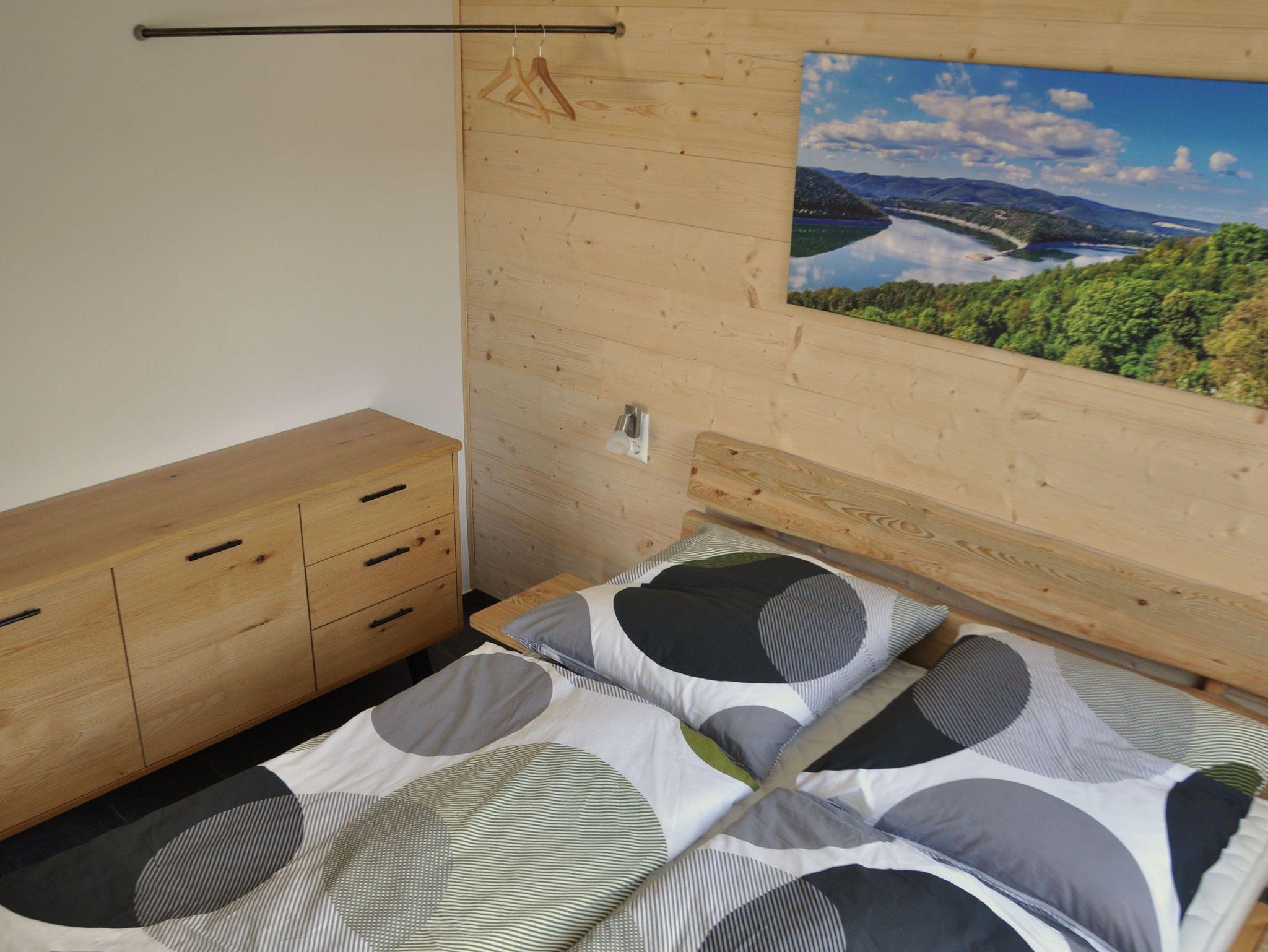 Im Schlafzimmer befindet sich ein Massivholz Doppelbett (160 x 200 cm) sowie ein Sideboard zur Wäscheablage und TV.
