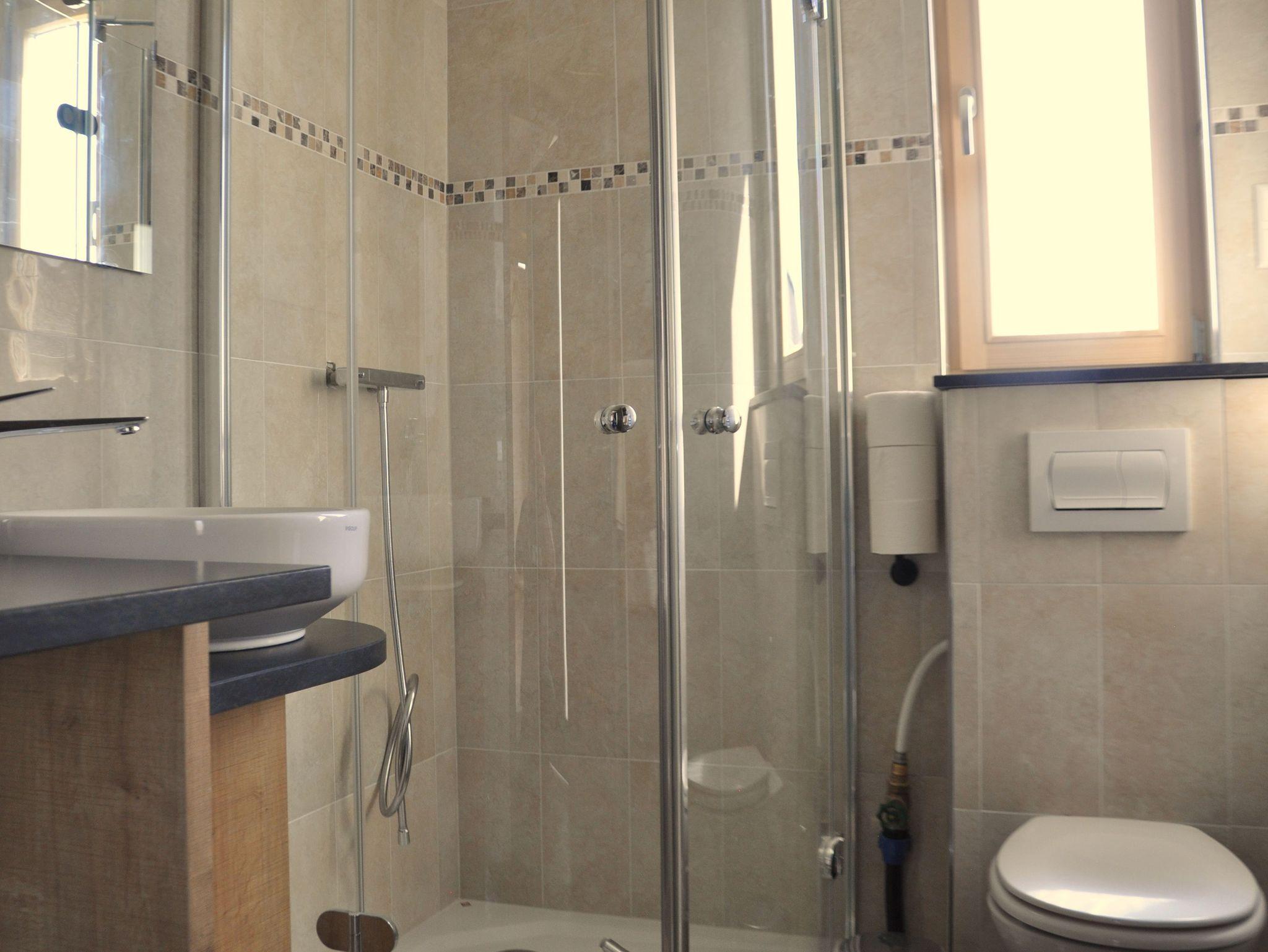 Im Badezimmer sind Dusche/WC, Waschbecken und Waschmaschine vorhanden.