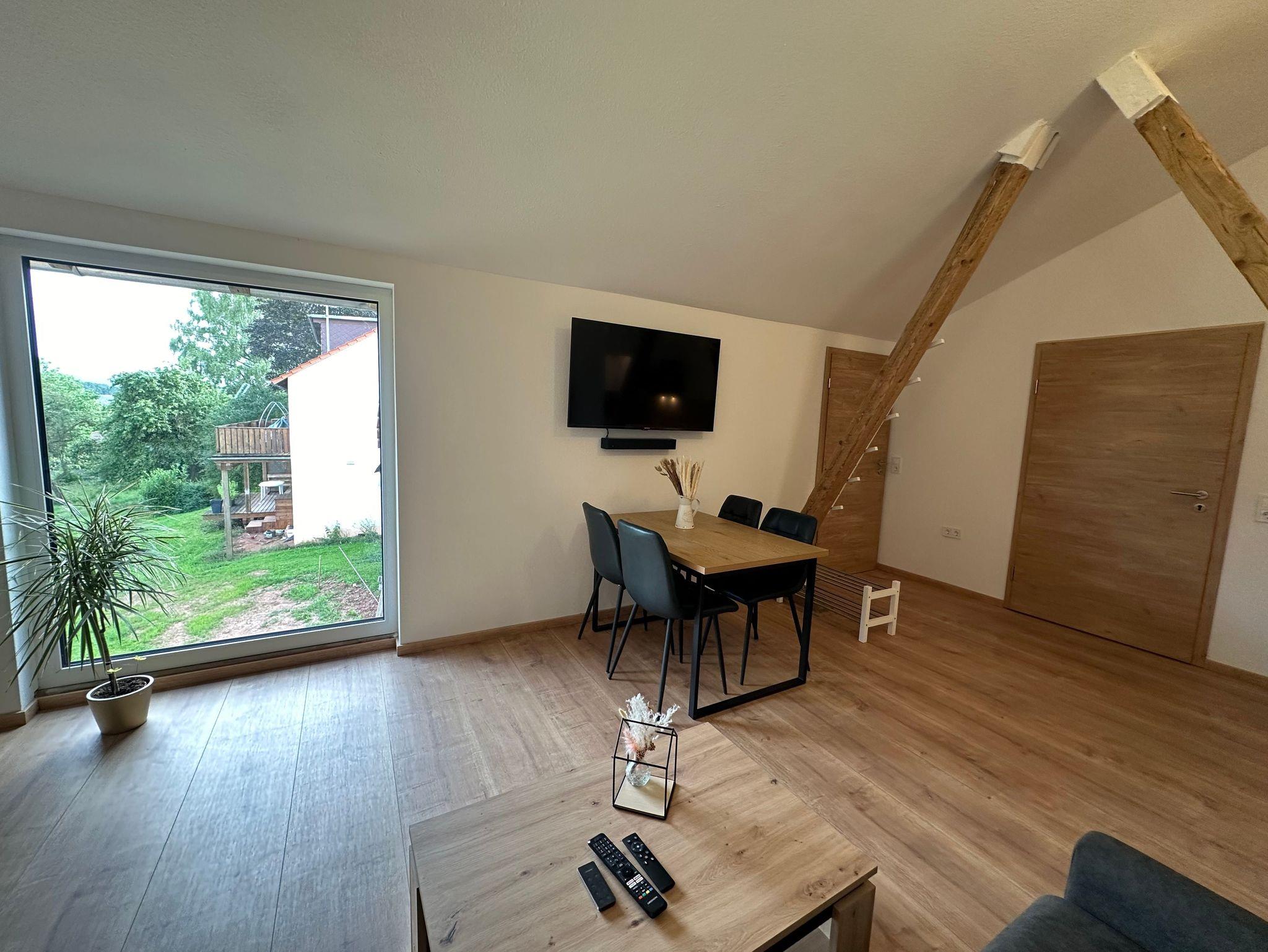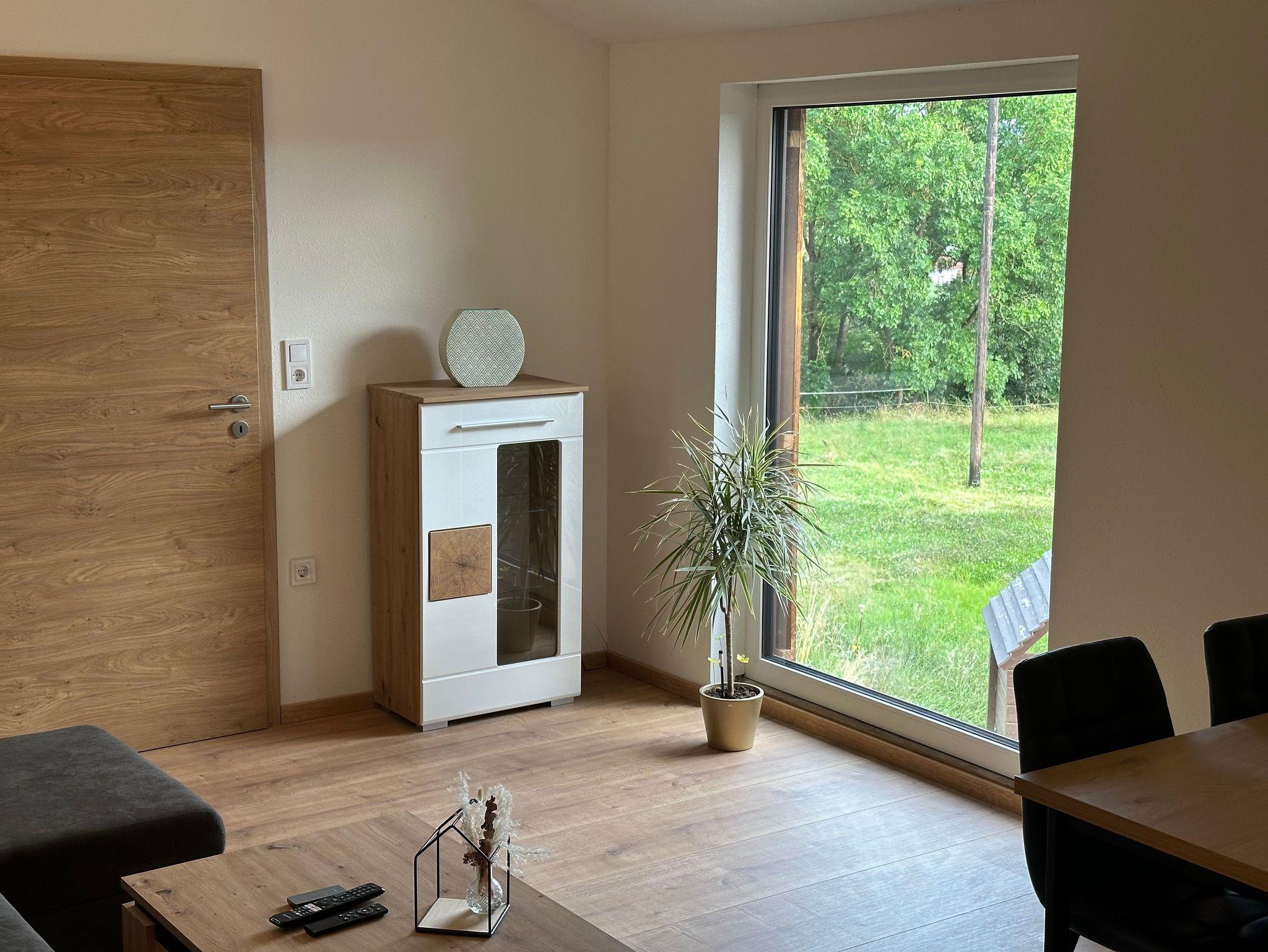 Der geräumige Wohn- und Essbereich beeindruckt mit einer 4 Meter hohen Decke und originalen Holzbalken, die der Wohnung ihren besonderen Charakter verleihen. Die großen Fenster bieten einen wundervollen Blick ins Grüne, der zur Entspannung einlädt. Die liebevoll durchdachte Einrichtung sorgt dafür, dass sich unser Gast von der ersten Minute an wie zu Hause fühlt.