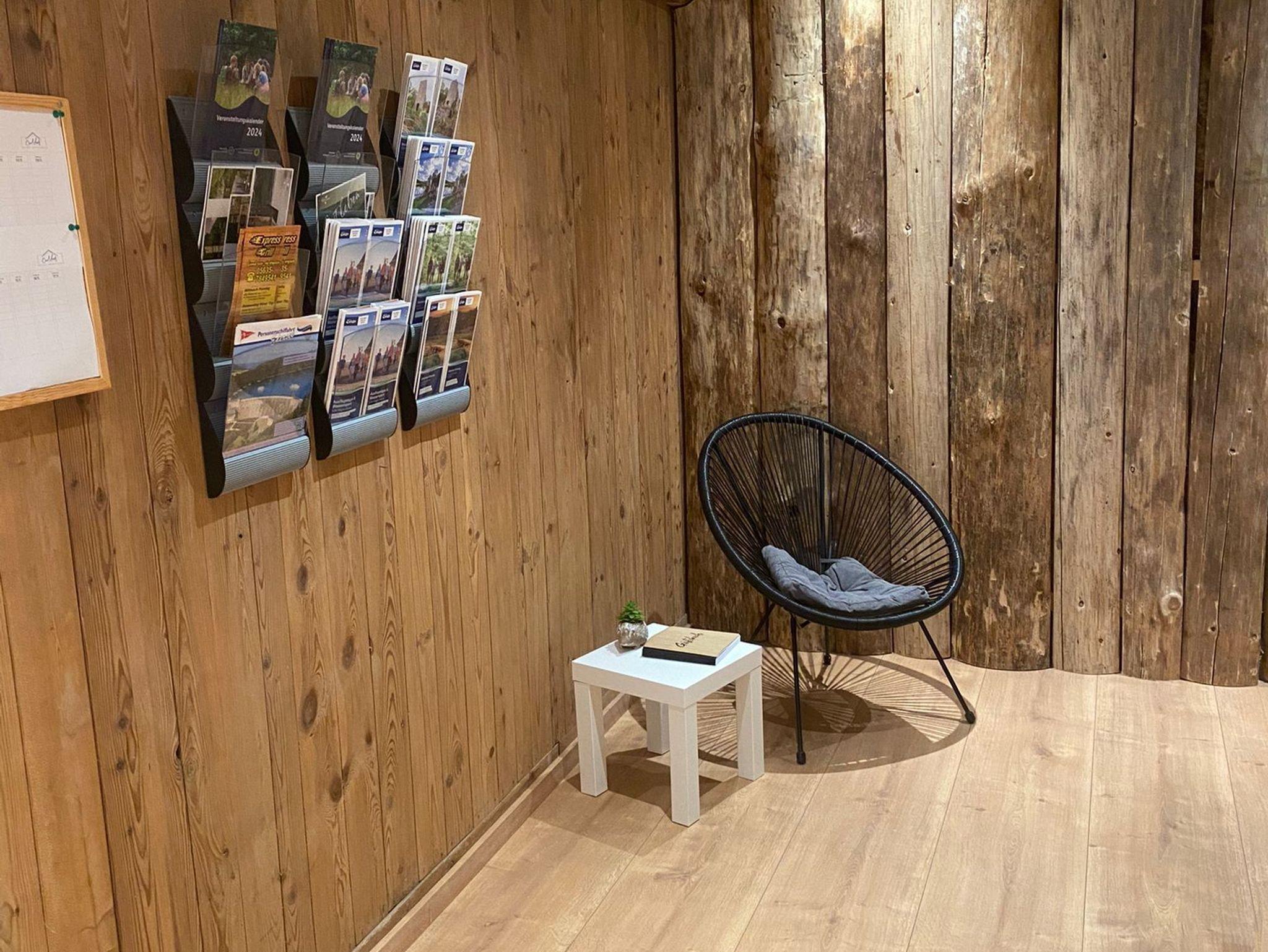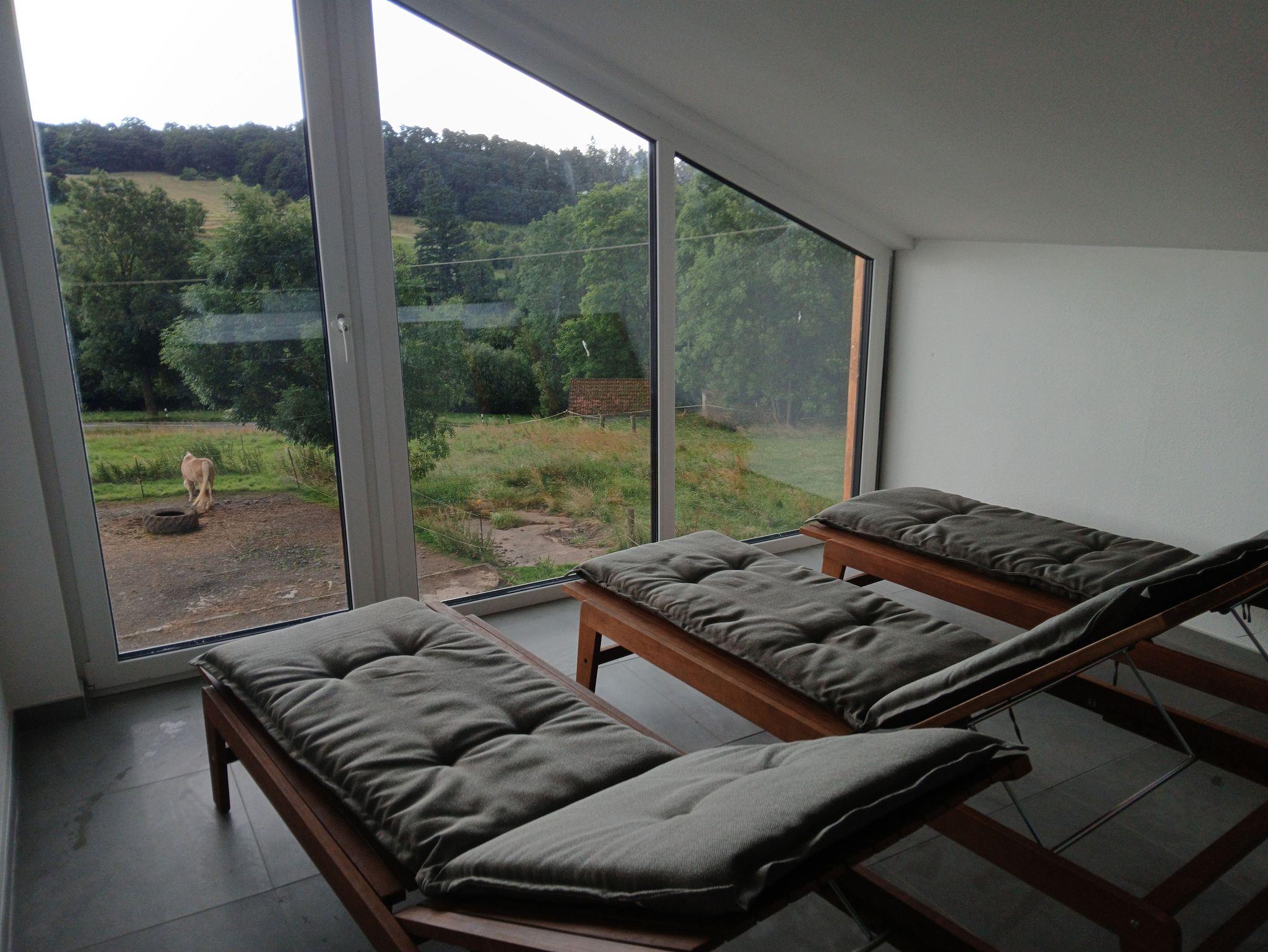 Im zweiten Obergeschoss findet ihr einen großzügigen Wellnessbereich, der über einen geräumigen Flur direkt von den Ferienwohnungen erreichbar ist. Neben einem Ruhebereich mit atemberaubendem Blick ins Grüne bietet der Wellnessbereich eine Sauna sowie einen großzügigen Whirlpool für bis zu vier Personen mit verschiedenen Massagedüsen.