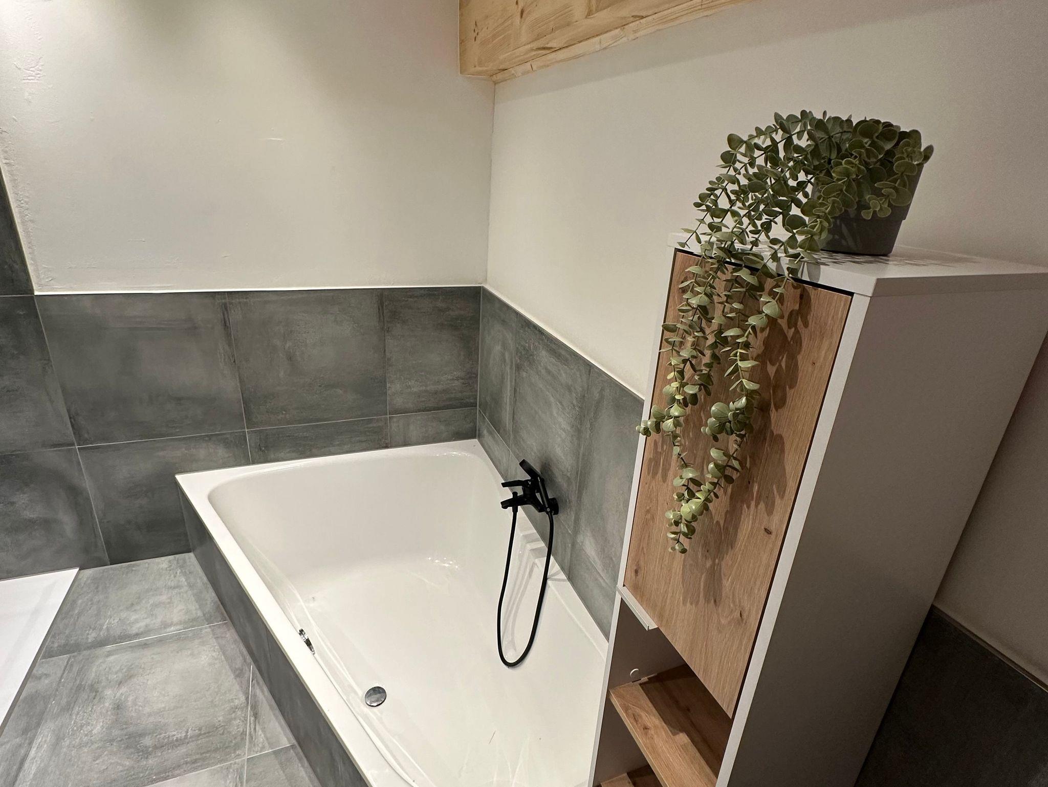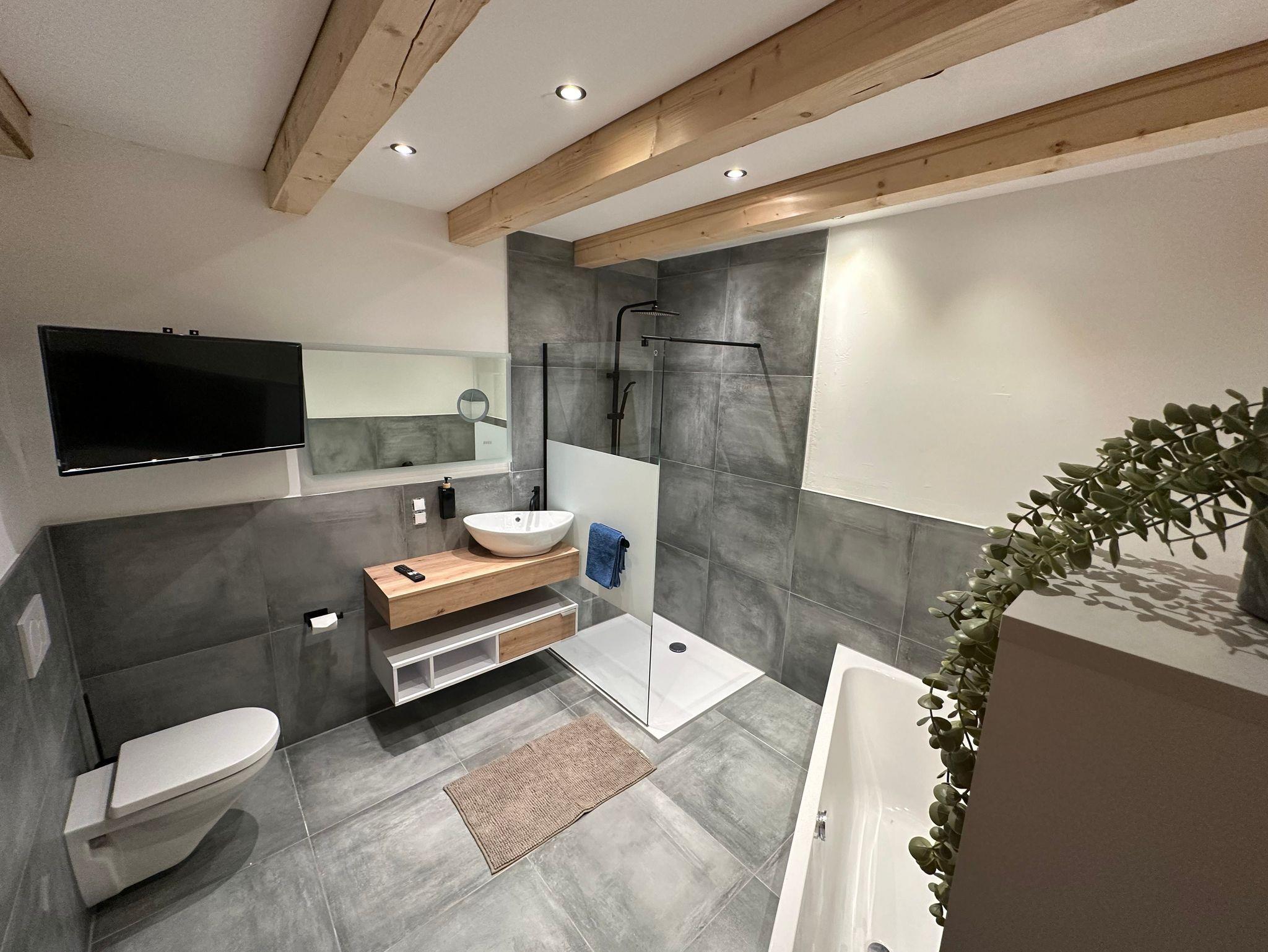 Das moderne Bad bietet eine geräumige offene Dusche, hochwertige Armaturen und einen beleuchteten Spiegel. Das absolute Highlight des Bades ist die großzügige Badewanne für zwei Personen, vor der ein Flachbild-TV installiert ist ? ideal für entspannte Stunden nach einem erlebnisreichen Tag.