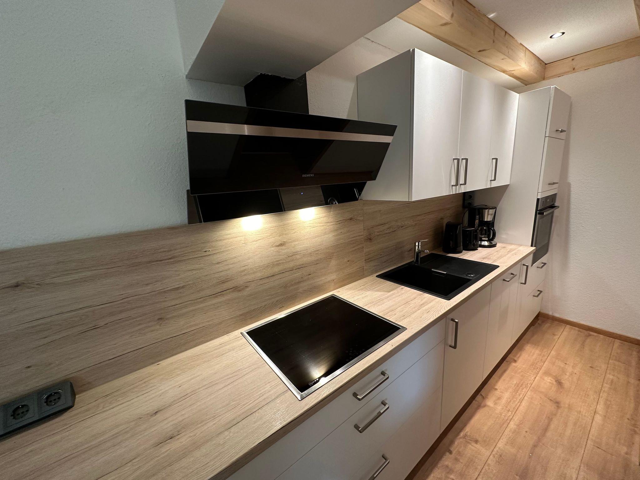 Die voll ausgestattete Küche lässt keine Wünsche offen und verfügt über einen Geschirrspüler, hochwertige Elektrogeräte (Kühlschrank, ein Gefrierfach, Induktionsherd, Mikrowelle, Ofen) sowie Toaster, Kaffeemaschine und Wasserkocher.